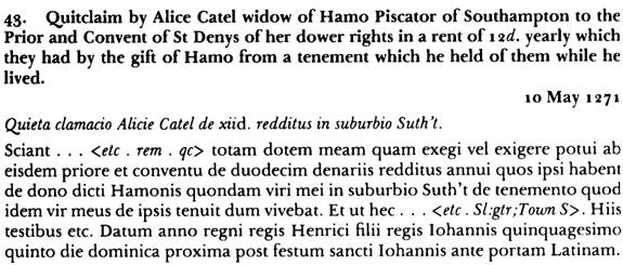 Sciant [] totam dotem meam quam exegi uel exigere potui ab eisdem priore et conuentu de duodecim denariis redditus annui quos ipsi habent de dono dicti Hamonis quondam uiri mei in suburbio Sutht de tenemento quod idem uir meus de ipsis tenuit dum uiuebat Et ut hec [] Hiis testibus [] Datum anno regni regis Henrici filii regis Iohannis quinquagesimo quinto die dominica proxima post festum sancti Iohannis ante portam Latinam