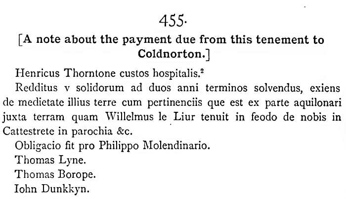 Henricus Thorntone custos hospitalis Redditus v solidorum ad duos anni terminos solvendus exiens de medietate illius terre cum pertmenciis que est ex parte aquilonari juxta terram quam Willelmus le Liur tenuit in feodo de nobis in Cattestrete in parochia [] Obligacio fit pro Philippo Molendinario Thomas Lyne Thomas Borope Iohn Dunkkyn