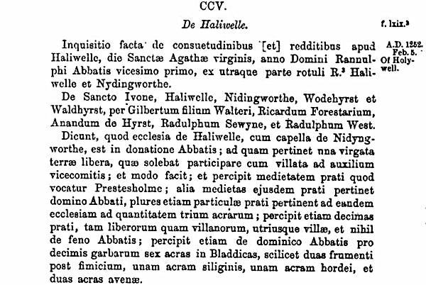 Inquisitio facta de consuetudinibus [et] redditibus apud Haliwelle die Sanctae Agathae virginis anno Domini Rannulphi Abbatis vicesimo primo ex utraque parte rotuli R Haliwelle et Nydingworthe De Sancto Ivone Haliwelle Nidingworthe Wodehyrst et Waldhyrst per Gilbertum filium Walteriname Ricardum Forestariumname Anagum de Hyrstname Radulphum Sewynename et Radulphum Westname Dicunt quod ecclesia de Haliwellename cum capella de Nidingworthe est in donatione Abbatisname ad quam pertinet una virgata terrae libera quae solebat participare cum villata ad auxilium vicecomitis et modo facit et percipit medietatem prati quod vocatur Prestesholme alia medietas ejusdem prati pertinet domino Abbatiname plures etiam particulae prati pertinent ad eandem ecclesiam ad quantitatem trium acrarum percipit etiam decimas prati tam liberorum quam villanorum utriusque villae et nihil de feno Abbatisname percipit etiam de dominico Abbatisname pro decimis garbarum sex acras in Bladdicas scilicet duas frumenti post fimicium unam acram siliginis unam acram hordei et duas acras avenae