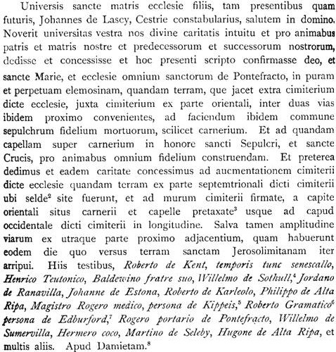 Universis sancte matris ecclesie filiis tam presentibus quam futuris Johannes de Lascy Cestrie constabularius salutem in domino Noverit universitas vestra nos divine caritatis intuitu et pro animabus patris et matris nostre et predecessorum et successorum nostrorum dedisse et concessisse et hoc presenti scripto confirmasse deo et sancte Marie et ecclesie omnium sanctorum de Pontefracto in puram et perpetuam elemosinam quandam terram que jacet extra cimiterium dicte ecclesie juxta cimiterium ex parte orientali inter duas vias ibidem proximo convenientes ad faciendum ibidem commune Sepulchrum fidelium mortuorum scilicet carnerium Et ad quandam capellam super carnerium in honore sancti Sepulcri et sancte Crucis pro animabus omnium fidelium construendam Et preterea dedimus et eadem caritate concessimus ad aucmentationem cimiterii dicte ecclesie quandam terram ex parte septemtrionali dicti cimiterii ubi selde[] site fuerunt et ad murum cimiterii firmate a capite orientali situs carnerii et capelle pretaxate usque ad capud occidentale dicti cimiterii in longitudine Salva tamen amplitudine viarum ex utraque parte proximo adjacentium quam habuerunt eodem die quo versus terram sanctam Jerosolimitanam iter arripui Hiis testibus Roberto de Kent temporis tunc senescalle Henrico Teutonico Baldewino fratre suo Willelmo de Sothull Jordano de Ranavilla Johanne de Estona Roberto de Karleolo Philippo de Alta Ripa Magistro Rogero medico persona de Kippeis [] Roberto Gramatico[] ersona de Edburford [] Rogero portario de Pontefracto Willelmo de Sumervilla Hermero coco Martino de Seleby Hugone de Alta Ripa et multis aliis Apud Damietam []
