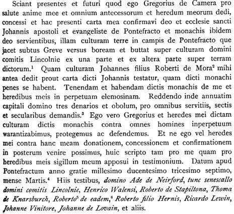 Sciant presentes et futuri quod ego Gregorius de Camera pro salute anime mee et omnium antecessorum et heredum meorum dedi concessi et hac presenti carta mea confirmavi deo et ecclesie sancti Johannis apostoli et evangeliste de Pontefracto et monachis ibidem deo servientibus illam culturam terre in campis de Pontefracto que jacet subtus Greve versus boream et buttat super culturam domini comitis Lincolnie ex una parte et ex altera parte super terram dictorum Quam culturam Johannes filius Roberti de Mora mihi antea dedit prout carta dicti Johannis testatur quam dicti monachi penes se habent tenend et habend dictis monachis de me et heredibus meis in perpetuam elemosinam Reddendo inde annuatim capitali domino tres denarios et obolum pro omnibus servitiis sectis et secularibus demandis Ego vero Gregorius et heredes mei dictam culturam dictis monachis contra omnes homines inperpetuum warantizabimus protegemus ac defendemus Et ne ego vel heredes Mei contra hanc meam donationem concessionem et confirmationem in posterum venire possimus huic scripto tam pro me quam pro heredibus meis sigillum meum apposui in testimonium Datum apud Pontefractum anno gratie millesimo ducentesimo tricesimo septimo mense Martis Hiis testibus domino Ade de Neirford tunc senescallo do domini comitis Lincolnie Henrieo Walensi Roberto de Stapiltona Thoma de Knarsburch Roberto de eadem Roberto filio Hernis Ricardo Lewin Johanne Vinitore Johanne de Lovain et aliis