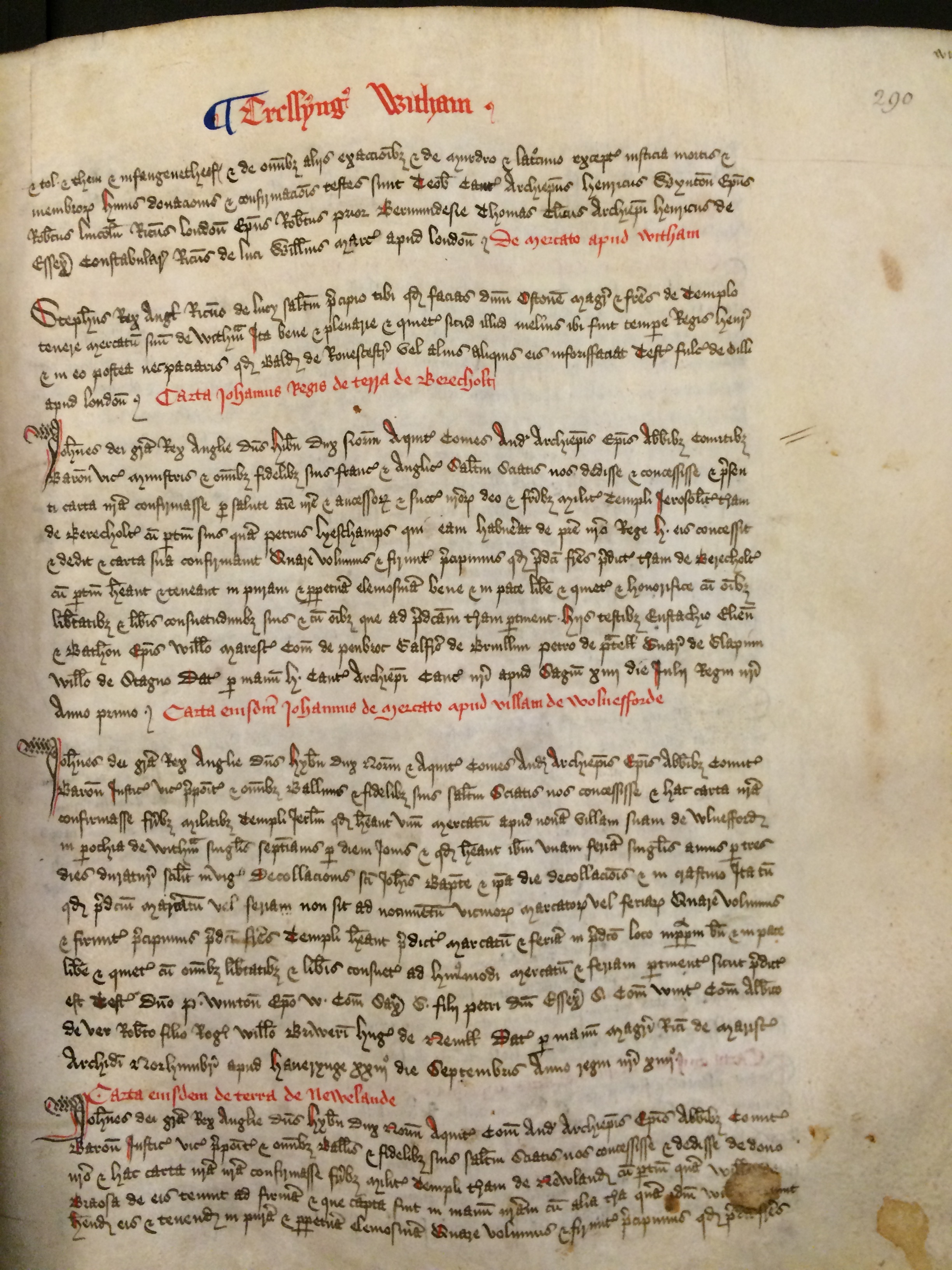 Iohannes Dei gratia rex Anglie dominus Hibern[ie] dux Norm[annie][et] Aquit[anie] comes And[egavie] archiepiscopis episcopis abbatibus comitibus baronibus vicecomitibus ministris et omnibus fidelibus suis Francis et Anglicis salutem Sciatis nos dedisse et concessisse et presenti carta nostra confirmasse pro salute anime nostre et antecessorum et successorum nostrorum Deo et fratribus militibus Templi Ierosol[im]it[ani] terram de Berecholt cum pertinentiis suis quam Petrus Lyeschamps qui eam habuerat de patre nostro rege h[enrico] eis concessit et dedit et carta sua confirmavit Quare volumus et firmiter precipimus [quod] predicti fratres predictam terram de Berecholt cum pertinentiis habeant et teneant in puram et perpetuam elemosinam bene et in pace libere et quiete et honorifice cum omnibus libertatibus et liberis consuetudinibus suis et cum omnibus que ad predictam terram pertinent Hiis testibus Eustachio Elien[si] et [savarico] Bathon[ensi] episcopis Willelmo marescallo comite de Penbroc Galfrido de Bruillun Petro de Pratellis Guarino de Glapiun Willelmo de Stagno Datum per manum h[uberti] Cant[uariensis] archiepiscopi cancellarii nostri apud Sagiu[m] quarto decimo die iulii regni nostri anno primo