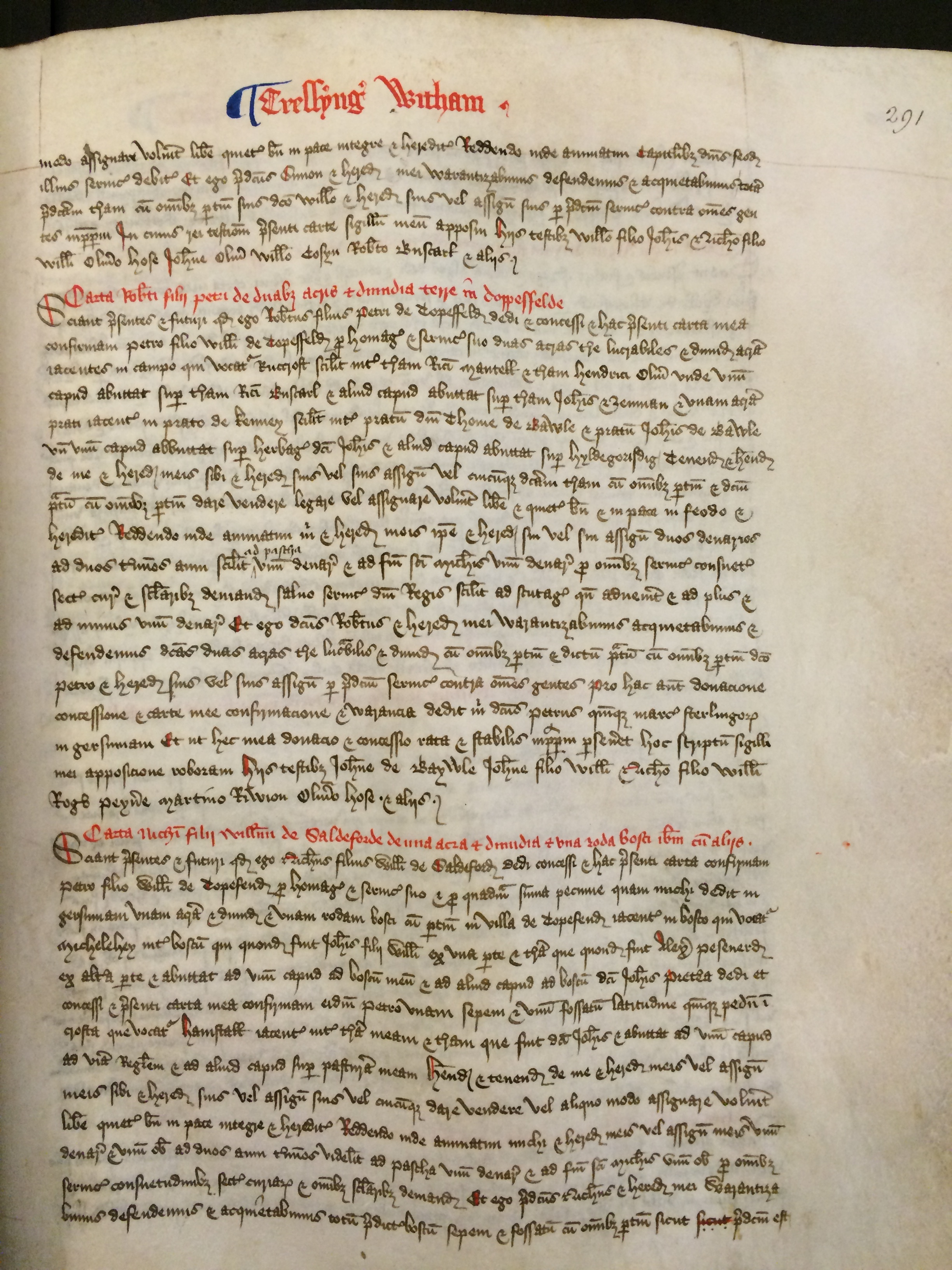 Sciant presentes et futuri quod ego Robertus filius Petri de Topesfeldname[] dedi et concessi et hac presenti carta mea confirmavi Petro filio Willelmi de Topesfeldname[] pro homagio et servicio suo duas acras terre lucrabiles et dimidiam acram iacentes in campo qui vocatur Ruccroft scilicet inter terram Ricardi Mancellname[] et terram Hendrici Olivername[] unde unum capud abuttat super terram Ricardi buscarlname et aliud capud abuttat super terram Iohannis Neumanname et unam acram prati iacentem in prato de Kenney scilicet inter pratum domini Thome de Bawlename et pratum Iohannis de Bawlename unde unum capud abbuttat super herbagium dicti Iohannisname et aliud capud abuttat super Hyldegorisdig tenendas et habendas de me et heredibus meis sibi et heredibus suis vel suis assignatis vel cuicumque dictam terram cum omnibus pertinentiis et dictum pratum cum omnibus pertinentiis dare vendere legare vel assignare voluerit libere et quiete bene et in pace in feodo et hereditarie reddendo inde annuatim michi et heredibus meis ipse et heredes sui vel sui assignati duos denarios ad duos terminos anni scilicet ad Pascha unum denarium et ad festum sancti Michaelis unum denarium pro omnibus serviciis consuetudinibus sectis curiarum et secularibus demandis salvo servicio domini regis scilicet ad scutagium quando advenerit et ad plus et ad minus unum denarium Et ego dictus Robertusname et heredes mei warantizabimus acquietabimus et defendemus dictas duas acras terre lucrabilis et dimidiam cum omnibus pertinentiis et dictum pratum cum omnibus pertinentiis dicto Petroname et heredibus suis vel suis assignatis per predictum servicium contra omnes gentes Pro hac autem donacione concessione et carte mee confirmacione et warancia dedit michi dictus Petrusname quinque marcas sterlingorum in gersumam Et ut hec mea donacio et concessio rata et stabilis in perpetuum perseveret hoc scriptum sigilli mei apposicione roboravi Hiis testibus Iohanne de Baywlename Iohanne filio Willelminame Nicholao filio Willelminame Rogero Peyv[er]ename Martino Riwionname Olivero hosename et aliis