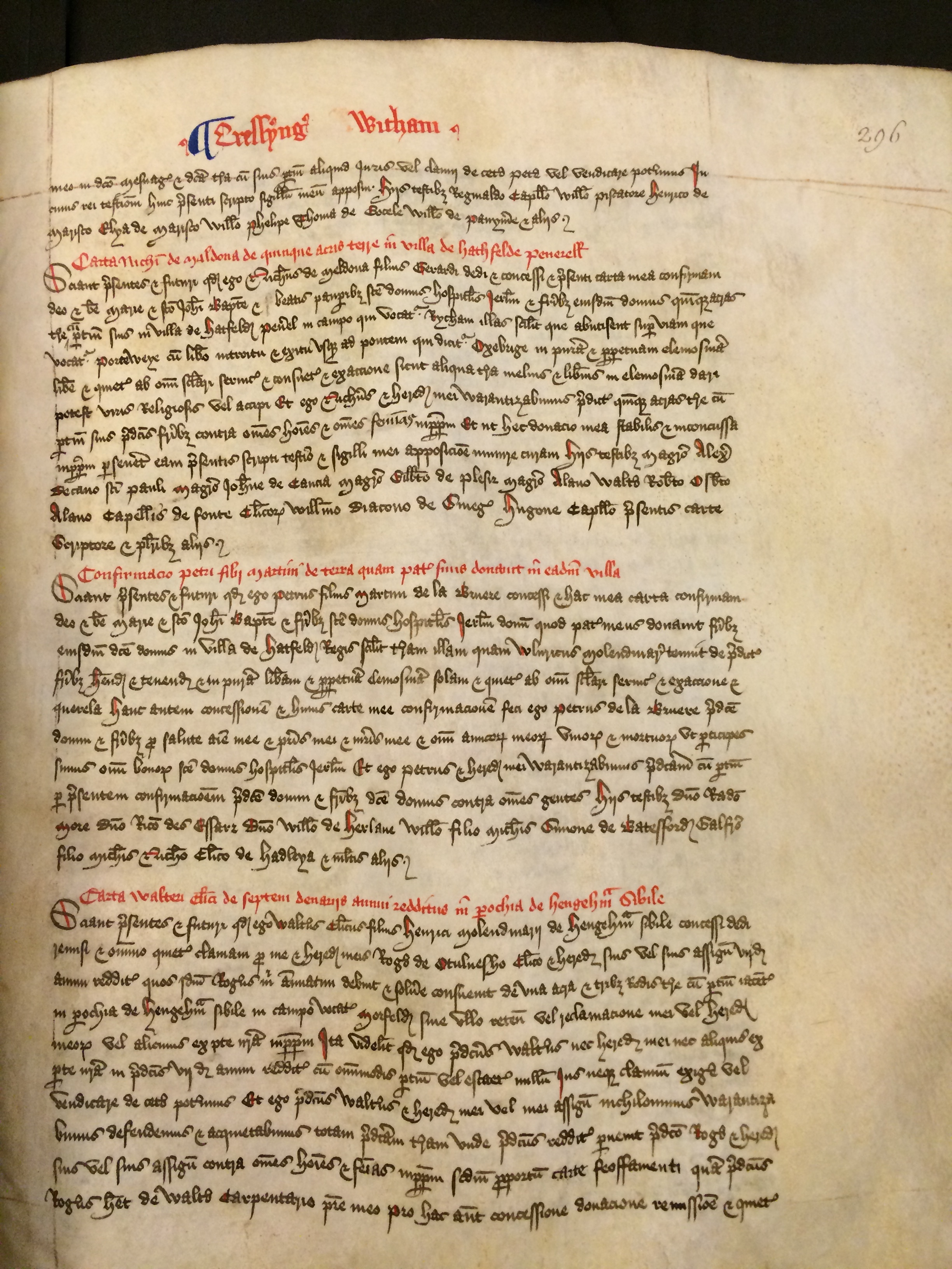 Sciant presentes et futuri quod ego Petrus filius Martini de la Bruerename concessi et hac mea carta confirmavi Deo et beate Marie et sancto Iohanni Baptiste et fratribus sancte domus hospitalis Ierusalemname donum quod pater meus donavit fratribusname eiusdem dicte domus in villa de Hatfeld[] Regis scilicet terram illam quam Wluricus molendinariusname tenuit de predictis fratribusname habendum et tenendum in puram liberam et perpetuam elemosinam solutum et quietum ab omni seculari servicio et exaccione et querela Hanc autem concessionem et huius carte mee confirmacionem feci ego Petrus de la Bruerename predicte domui et fratribus pro salute anime mee et patris mei et matris mee et omnium amicorum meorum vivorum et mortuorum ut participes simus omnium bonorum sancte domus hospitalis Ierusalemname Et ego Petrusname et heredes mei warantizabimus predictam [terram] cum pertinentiis per presentem confirmacionem predicte domui et fratribusname dicte domus contra omnes gentes Hiis testibus domino Radulpho Morename domino Ricardo des Essarzname domino Willelmo de Herlauename Willelmo filio Michaelisname Simone de Batesfordname[] Galfrido filio Michaelisname Nicholao clerico de Hadleyaname et multis aliis
