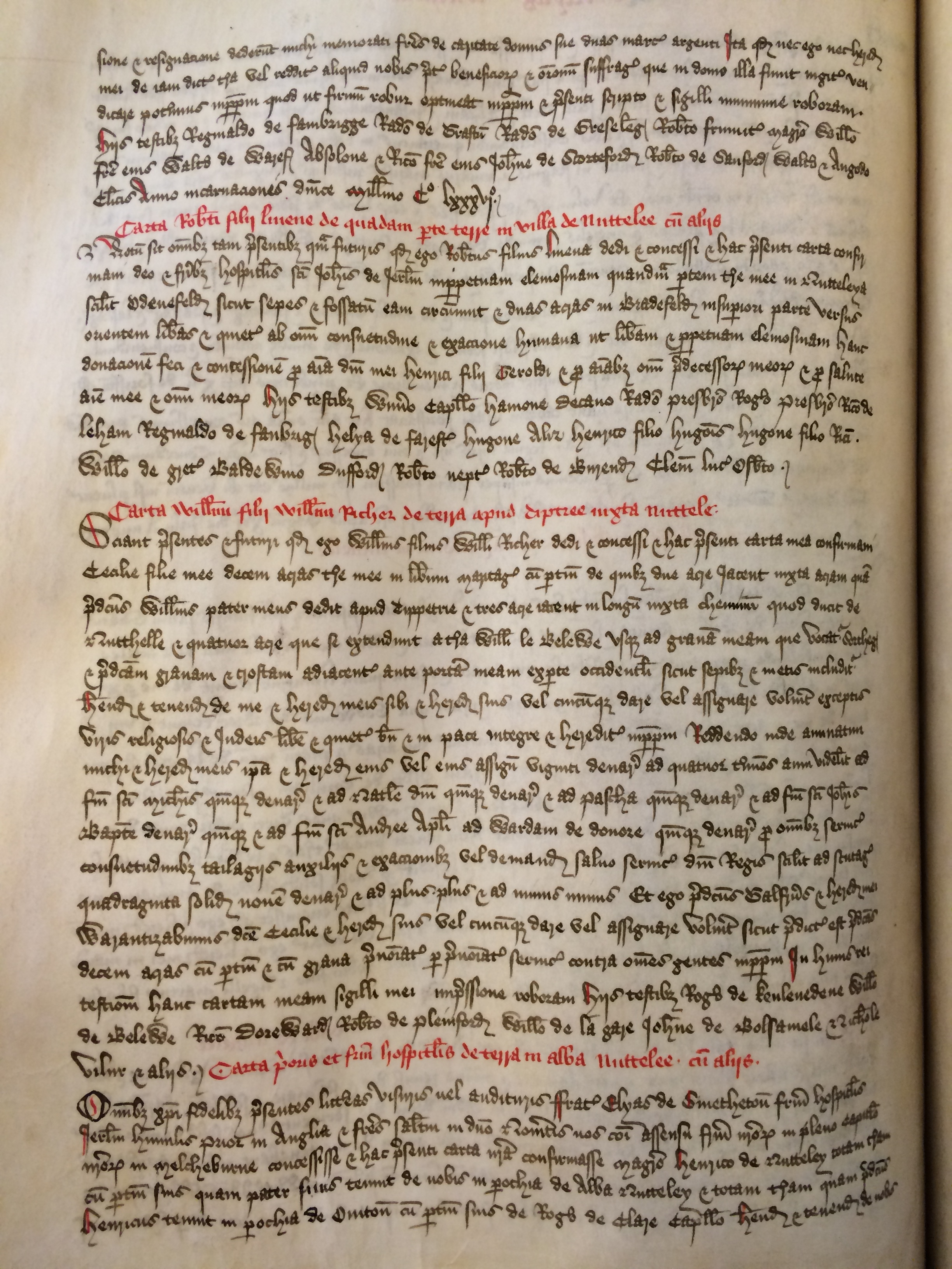 Notum sit omnibus tam presentibus quam futuris quod ego Robertus filius Liveve dedi et concessi et hac presenti carta confirmavi Deo et fratribus hospitalis sancti Iohannis de Ierusalem in perpetuam elemosinam quandam partem terre mee in Nutteleya scilicet Odeuefeld[] sicut sepes et fossatum eam circuiunt et duas acras in Bradefeld[] in superiori parte versus orientem liberas et quietas ab omni consuetudine et exaccione humana ut liberam et perpetuam elemosinam Hanc donacionem feci et concessionem pro anima domini mei Henrici filii Geroldi et pro animabus omnium predecessorum meorum et pro salute anime mee et omnium meorum Hiis testibus Wimero capellano Hamone decano Radulpho presbitero Rogero presbitero Ricardo de Leham Reginaldo de Fanbrig[] Helya de Farest[] Hugone Aliz Henrico filio Hugonis Hugone filio Ricardo Willelmo de Gret[] Baldewino Dufford[] Roberto nepote Roberto de Burend[] Clemente Luca Osberto