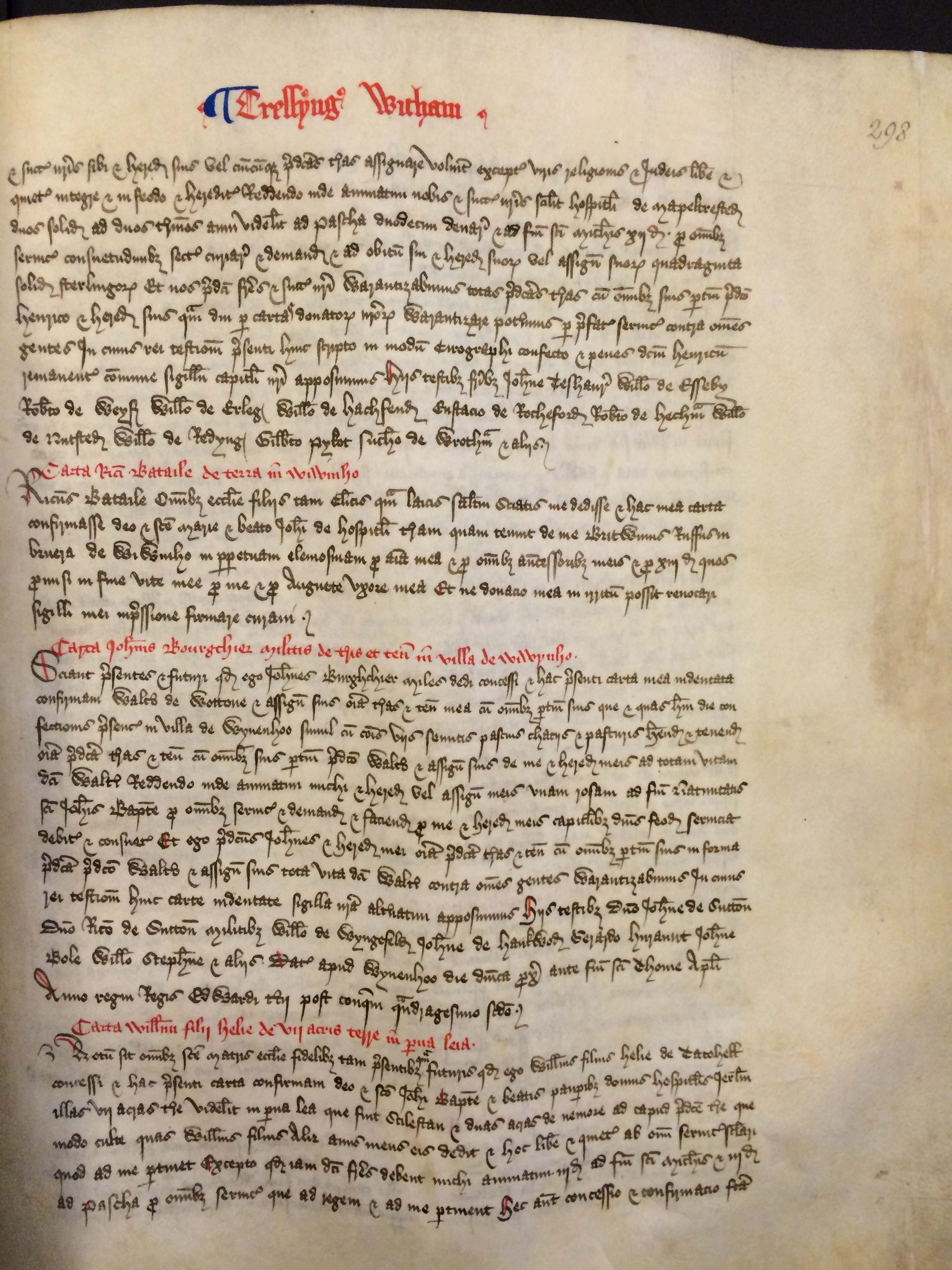 Ricardus Bataile omnibus [sancte matris] ecclesie filiis tam clericis quam laicis salutem Sciatis me dedisse et hac mea carta confirmasse Deo et sancte Marie et beato Iohanni de hospitali terram quam tenuit de me Britwinus Ruffus in bruera de Wiwinho in perpetuam elemosinam pro anima mea et pro omnibus antecessoribus meis et pro xiii d quos promisi in fine vite mee pro me et pro Angnete uxore mea Et ne donacio mea in irritum possit revocari sigilli mei inpressione firmare curavi