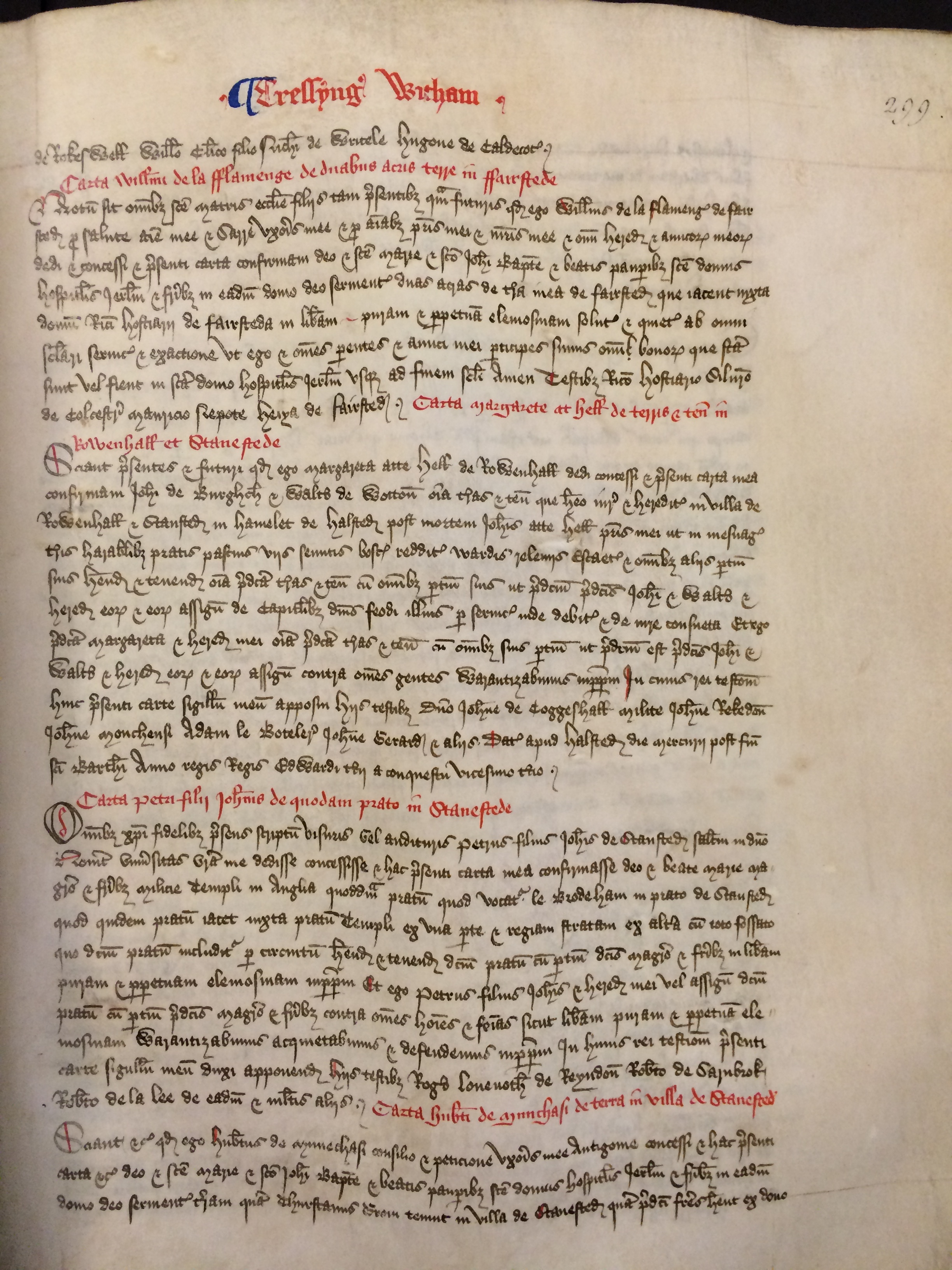 Sciant presentes et futuri quod ego Margareta atte Hell de Rowenhall dedi concessi et presenti carta mea confirmavi Iohanni de Burghch et Waltero de Wotton omnia terras et tenementa que habeo iure et hereditarie in villa de Rowenhall et Stansted in hamelet de Halsted post mortem Iohannis atte Hell patris mei ut in mesuagiis terris harabilibus pratis pascuis viis semitis boscis redditibus wardis releviis escaetis et omnibus aliis pertinentiis suis habend et tenend omnia predicta terras et tenementa cum omnibus pertinentiis suis ut predictum [est] predictis Iohanni et Waltero et heredibus eorum et eorum assignatis de capitalibus dominis feodi illius per servicium inde debita et de iure consueta Et ego predicta Margareta et heredes mei omnia predicta terras et tenementa cum omnibus suis pertinentiis ut predictum est predictis Iohanni et Waltero et heredibus eorum et eorum assignatis contra omnes gentes warantizabimus in perpetuum In cuius rei testimonium huic presenti carte sigillum meum apposui Hiis testibus domino Iohanne de Coggeshall milite Iohanne Rekedon Iohanne Monchensi Adam le boteler Iohanne Gerard et aliis Datum apud Halsted die mercurii post festum sancti Bartholomei anno regni regis Edwardi tercii a conquestu vicesimo tercio