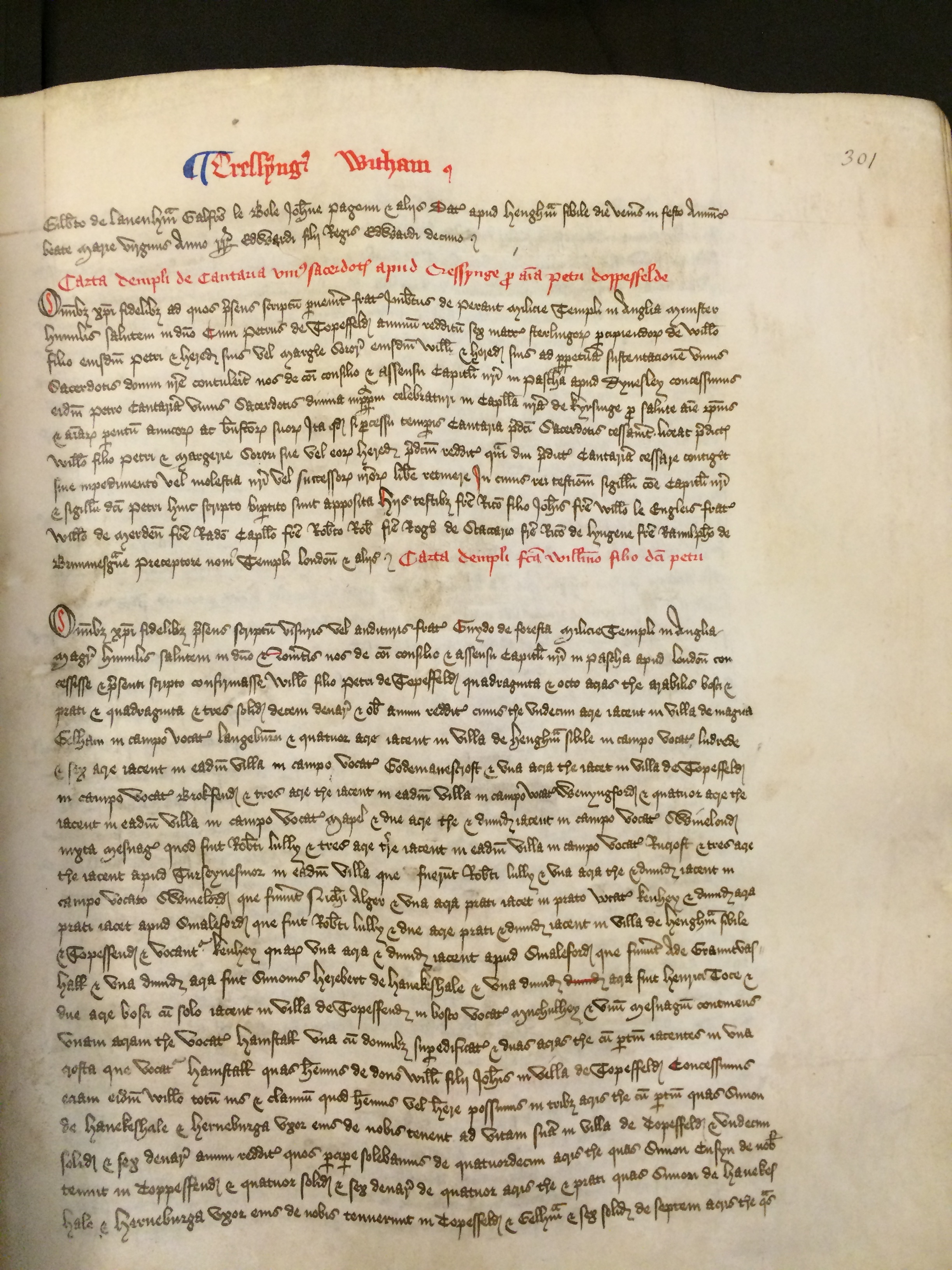 Omnibus Christi fidelibus presens scriptum visuris vel audituris frater Guydo de Foresta milicie Templi in Anglia magister humilis salutem in Domino Noveritis nos de communi consilio et assensu capituli nostri in Pascha apud London[iam] concessisse et presenti scripto confirmasse Willelmo filio Petri de Topesfeld quadraginta et octo acras terre arabilis bosci et prati et quadraginta et tres solidos decem denarios et obolum annui redditus cuius terre undecim acre iacent in villa de magna Gelham in campo vocato Langeburn et quatuor acre iacent in villa de Hengham Sibile in campo vocato Ludrede et sex acre iacent in eadem villa in campo vocato Godemanescroft et una acra terre iacet in villa de Topesfeld in campo vocato Brokfeud et tres acre terre iacent in eadem villa in campo vocato Wenyngford et quatuor acre terre iacent in eadem villa in campo vocato Mapel et due acre terre et dimidia iacent in campo vocato Swinelond iuxta mesuagium quod fuit Roberti Lully et tres acre terre iacent in eadem villa in campo vocato Rucroft et tres acre terre iacent apud Turseynesmor in eadem villa que fuerunt Roberti Lully et una acra terre et dimidia iacent in campo vocato Swinelo[n]d que fuerunt Nicholai Alger et una acra prati iacet in prato vocato Kenhey et dimidia acra prati iacet apud Smaleford que fuit Roberti Lully et due acre prati et dimidia iacent in villa de Hengham Sibile et Topesfeud et vocantur Kenhey quarum una acra et dimidia iacent apud Smaleford que fuerunt Ade Grauntvashall et una dimidia acra fuit Simonis Herebert de Hauekeshale et una dimidia acra fuit Henrici Toce et due acre bosci cum solo iacent in villa de Topesfeud in bosco vocato Muchulhey et unum mesuagium continens unam acram terre vocatum Hamstall una cum domibus superedificatis et duas acras terre cum pertinentiis iacentes in una crofta que vocatur Hamstall quas habemus de dono Willelmi filii Iohannis in villa de Topesfeld concessimus eciam eidem Willelmo totum ius et clamium quod habemus vel habere possimus in tribus acris terre cum pertinentiis quas Simon de Hauekeshale et Herneburga uxor eius de nobis tenent ad vitam suam in villa de Topesfeld et undecim solidos et sex denarios annui redditus quos percipere solebamus de quatuordecim acris terre quas Simon Cusyn de nobis tenuit in Toppesfeud et quatuor solidos et sex denarios de quatuor acris terre et prati quas Simon de Hauekeshale et Herneburga uxor eius de nobis tenuerunt in Topesfeld et Gelham et sex solidos de septem acris terre quas Radulphus de Hauekeshale de nobis tenuit in Gelham et decem et octo denarios de terra Brikini quam Robertus burscarll de nobis tenuit in Topesfeld et sex denarios de sex acris terre quas Willelmus filius Iohannis de nobis tenuit in Topesfeld que fuerunt Ricardi Guncelini et octo denarios et obolum de duabus acris terre que fuerunt Stephani le mounier in Topesfeld et unum denarium annui redditus quem habuimus de dono Ricardi Guncelini et quindecim denarios de quatuor acris terre quas Petrus Swonild de nobis tenuit in Topesfeld et quatuor denarios de tribus acris terre quas Radulphus Gerard de nobis tenuit in Topesfeld et septem denarios de una acra terre quam Alexander tolle de nobis tenuit in Topesfeld et tres denarios de uno mesuagio quod Willelmus Kebe de nobis tenuit in Topesfeld et novem solidos et octo denarios de uno mesuagio et quindecim acris terre quas Ivo de la Bourne de nobis tenuit in Fynchyngfeld et undecim denarios de quinque acris terre quas Walterus Botenheye de nobis tenuit in Fynchyngfeld et duos solidos et septem denarios et obolum de quatuor acris terre et prati quas Galfridus de Feryng et Iohanna uxor eius de nobis tenuerunt in Fynchyngefeld et duos solidos de uno mesuagio quod Nicholaus le cherl de nobis tenuit in Topesfeld et decem et octo denarios de uno mesuagio quod Iselota Godhewe de nobis tenuit in Topesfeld una cum homagiis et omnibus serviciis prenominatis singulorum nec non herietis releviis wardis maritagiis auxiliis escaetis ac universis et singulis iuribus et rebus que nobis de predictis et eorum heredibus et de ipsis tenementis et ea tenentibus aliquo tempore racione vel casu accidere possent in perpetuum que omnia habemus de dono Petri de Topesfeld habend et tenend predicto Willelmo et heredibus suis de se legittime procreatis libere quiete integre et hereditarie reddendo inde annuatim domui nostre de Kressyng quatuor marcas et dimidia sterlingorum ad duos anni terminos scilicet medietatem ad festum omnium sanctorum et aliam medietatem ad festum invencionis sancte crucis et faciendo capitalibus dominis feodi servicia inde debita et consueta pro omnibus serviciis consuetudinibus sectis curiarum auxiliis et demandis salva domui nostre in obitu suo et heredum suorum dimidia marca argenti nomine relevii Si forte dictus Willelmus sine heredibus de corpore suo legitime procreatis obierit quod absit volumus et concedimus quod Margeria filia dicti Petri soror eiusdem Willelmi si eum supervixerit in predictis terris redditibus et tenementis liberum et licitum habeat ingressum absque inpedimento vel contradictione nostri vel successorum nostrorum ita quod ipsa et heredes sui de corpore suo legittime procreati ipsa tenementa redditus et possessiones iure hereditarie possideant in perpetuum omnia predicta servicia domui nostre faciendo sicut predictum est Et nos predicta terras et tenementa cum redditibus et aliis pertinentiis suis predicto Willelmo et heredibus suis de corpore suo legittime procreatis vel dicte Margerie sorori sue et heredibus suis ut predictum est per predictum servicium contra omnes gentes warantizabimus quam diu carta donatoria ea nobis poterit warantizare Et si contingat quod dictus Willelmus et dicta Margeria obierint sine herede de se legittime procreato omnia predicta tenementa redditus et possessiones cum suis pertinentiis ad nos et successores nostros libere et sine contradictione aliqua revertentur In cuius rei testimonium sigillum commune capituli nostri huic scripto apposuimus Hiis test