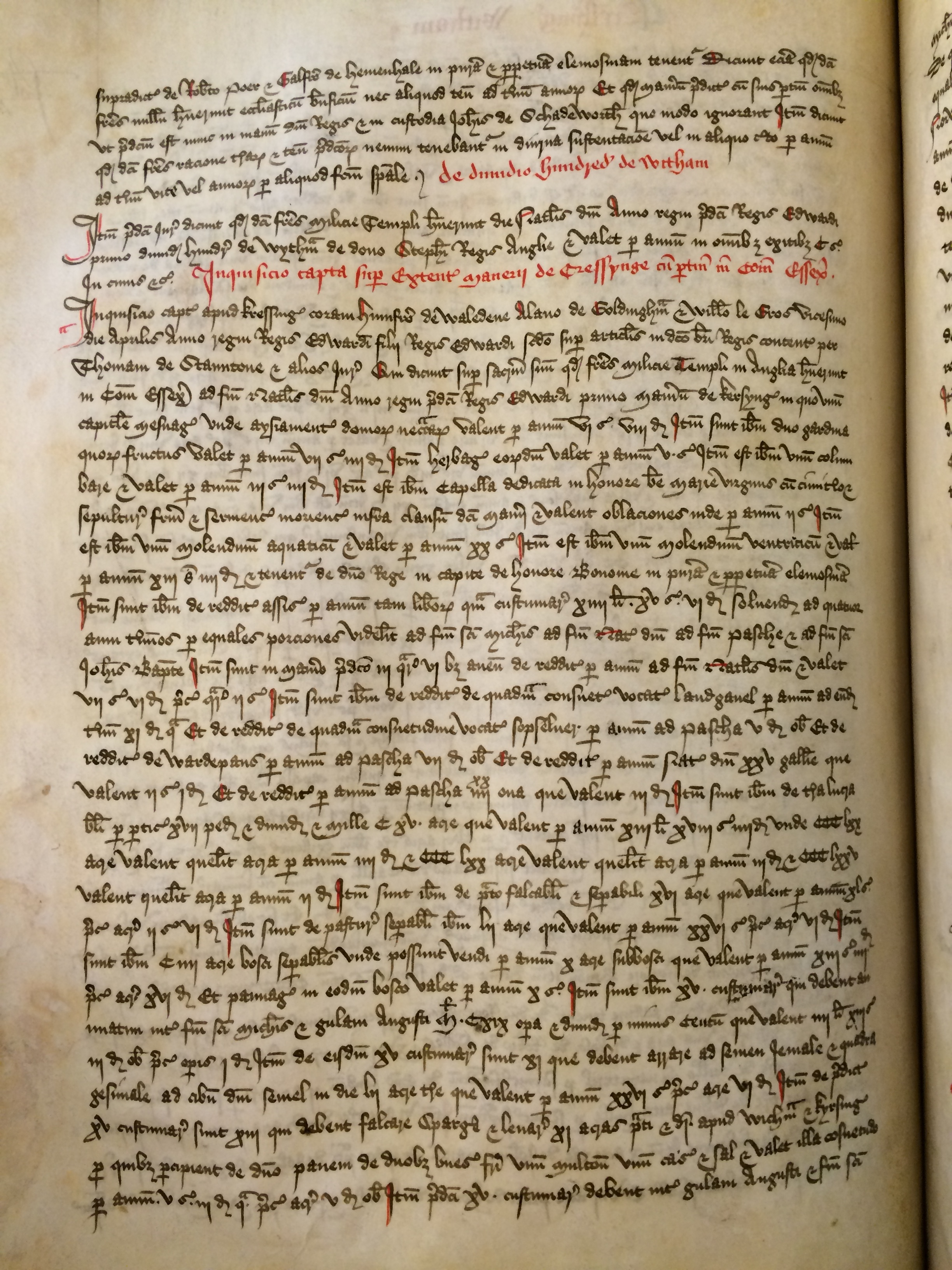 Item predicti iuratores dicunt quod dicti fratres milicie Templi habuerunt die Natalis Domini anno regni predicti regis Edwardi primo dimidium hundredum de Wytham de dono Stephani regis Anglie et valet per annum in omnibus exitibus c s In cuius []