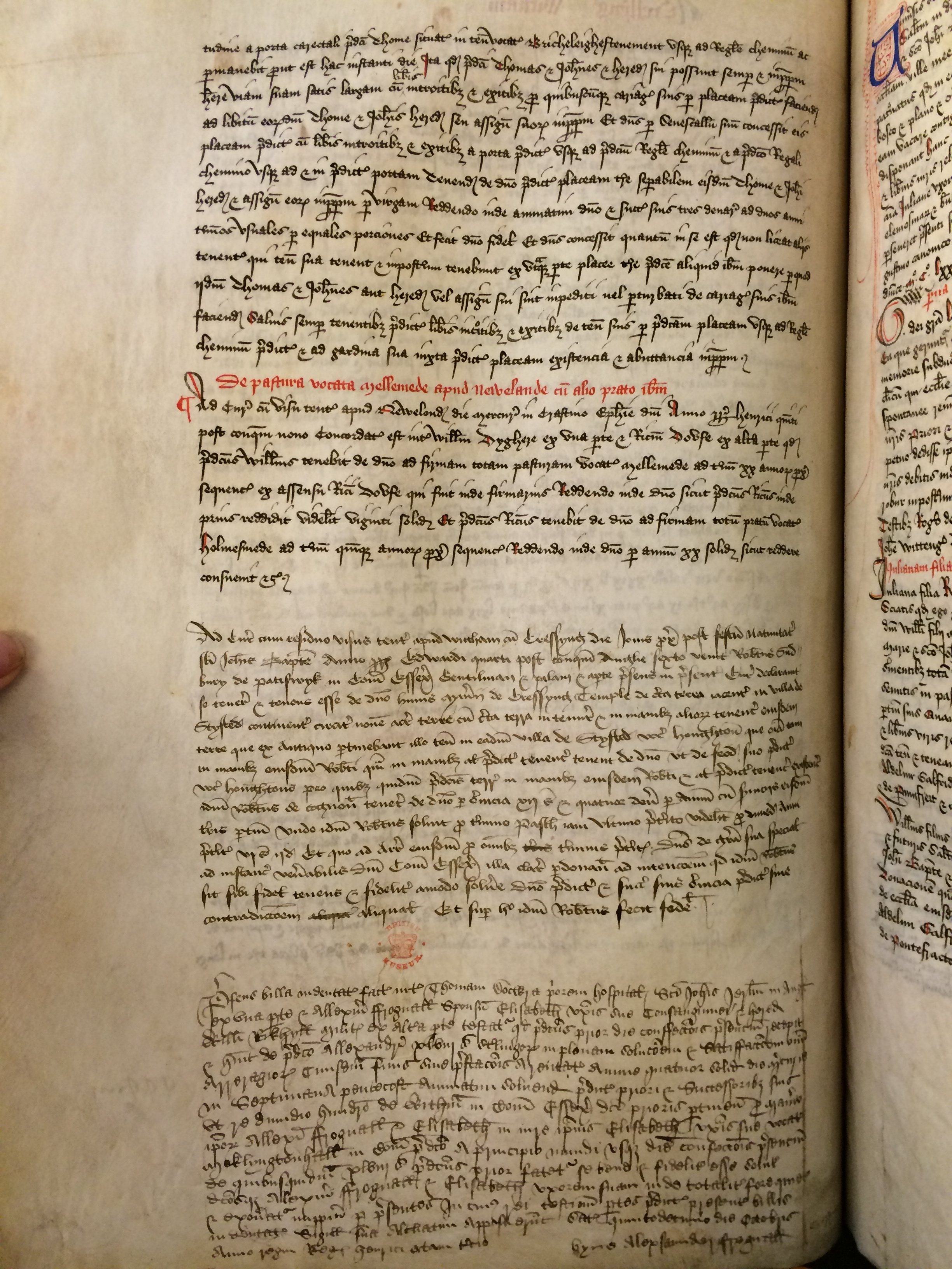 Ad curiam cum visu tentam apud Newelond die mercurii in crastino Epiphanie Domini anno regni regis Henrici quinti post conquestum nonodate concordatum est inter Willelmum Dygherename ex una parte et Ricardum Doufename ex altera parte quod predictus Willelmusname tenebit de domino ad firmam totam pasturam vocatam Mellemede ad terminum xx annorumnumeral proximorum sequencium ex assensu Ricardi Doufename qui fuit inde firmarius reddendo inde domino sicut predictus Ricardusname inde prius reddidit videlicet viginti solidosnumeral Et predictus Ricardusname tenebit de domino ad firmam totum pratum vocatum Holmesmede ad terminum quinque annorumnumeral proximorum sequencium reddendo inde domino per annum xx solidosnumeral sicut reddere consuevit []