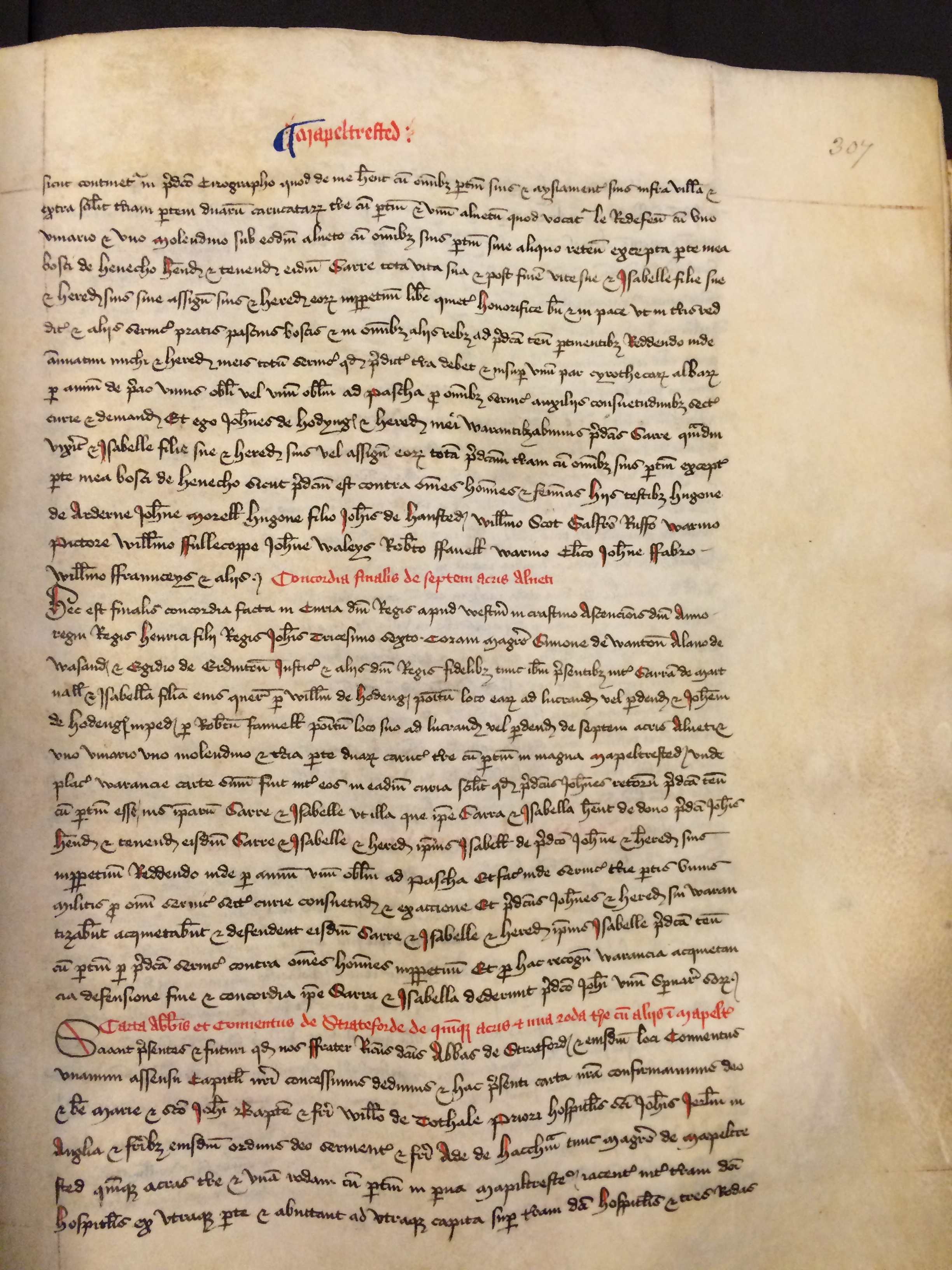 Sciant presentes et futuri quod nos frater Ricardus dictus abbas de Stratfordname[] et eiusdem loci conventusname unanimi consensu capituli nostri concessimus dedimus et hac presenti carta nostra confirmavimus Deo et beate Marie et sancto Iohanni Baptiste et fratri Willelmo de Tothale priori hospitalis sancti Iohannis Ierusalem in Anglianame et fratribusname eiusdem ordinis Deo servientibus et fratri Ade de Haccham tunc magistro de Mapeltrestedname quinque acras terre et unam rodam cum pertinentiis in parva Mapiltrestede iacentes inter terram dicti hospitalis ex utraque parte et abuttant ad utraque capita super terram dicti hospitalis et tres rodas terre iacentes in villa de Gestlyngthorpe in campo vocato Blakesfeld[] in perpetuum excambium pro sex acris terre in predicta villa de Mapeltrestede parva habendas et tenendas predictis Prioriname et fratribusname et eorum successoribus in liberam puram et perpetuam elemosinam de nobis et successoribus nostris in perpetuum Et nos predicti frater Ricardus abbasname et conventusname et successores nostri predicta tenementa cum omnibus pertinentiis suis predictis fratri Willelmo prioriname et fratribusname et eorum successoribus ut predictum est contra omnes gentes warantizabimus in perpetuum Nos vero frater Willelmus de Tothale prior hospitalis sancti Iohannis Ierusalem in Anglianame et frater Adam de Hachamname communi consensu capituli nostri concessimus dedimus et hac presenti carta nostra confirmavimus fratri Ricardo abbati de Stratfordname[] et eiusdem loci conventui sex acras terre cum pertinentiis in parva Mapeltrestede quarum due acre iacent inter terram dicti abbatisname ex una parte et terram de Beytham ex altera et tres rode iacent in campo vocato Myddelfed[] inter terram dicti abbatisname et terram Thome de Huntercoumbename et una roda et dimidia iacent in eodem campo inter terram dicti abbatisname ex una parte et terram Walteri Heroudname[] ex altera et una roda et dimidia iacent in eodem campo inter terram Hugonis Ioyename et terram Willelmi le botelername et una acra iacet in eodem campo inter terram Roberti le Blakename et terram Willelmi de Panimerename et tres rode et dimidia iacent in eodem campo inter terram Willelmi le botelername et terram hospitalisname et una roda et dimidia iacent in campo vocato Helles inter terram Hugonis Ioyename et terram Willelmi de Panimerename et una roda iacet in eodem campo inter terram Willelmi le botelername et terram Roberti le Blakename in perpetuum excambium pro sex acris terre in villa de Mapeltrestede parva et Gestlyngthorpe tenendas et habendas dictis abbati et conventui et eorum successoribus in liberam puram et perpetuam elemosinam de nobis et successoribus nostris in perpetuum Et nos et successores nostris omnia predicta tenementa cum pertinentiis suis predictis fratri Ricardo abbati de Stratford[] et conventui et eorum successoribus ut predictum est contra omnes gentes warantizabimus in perpetuum In cuius rei testimonium communia sigilla capitulorum nostrorum hiis cartis indentatis alternatim sunt apposita Hiis testibus fratre Roberto de Somerdeby fratre Nicholao de Accombename fratre Allexandro de Mitcham fratribus hospitalis sancti Iohannis Ierusalemname fratre Stephano de Benyngtonname[] fratre Iohanne Pratname et Ricardo senescallo de Stratfordname[] et multis aliis