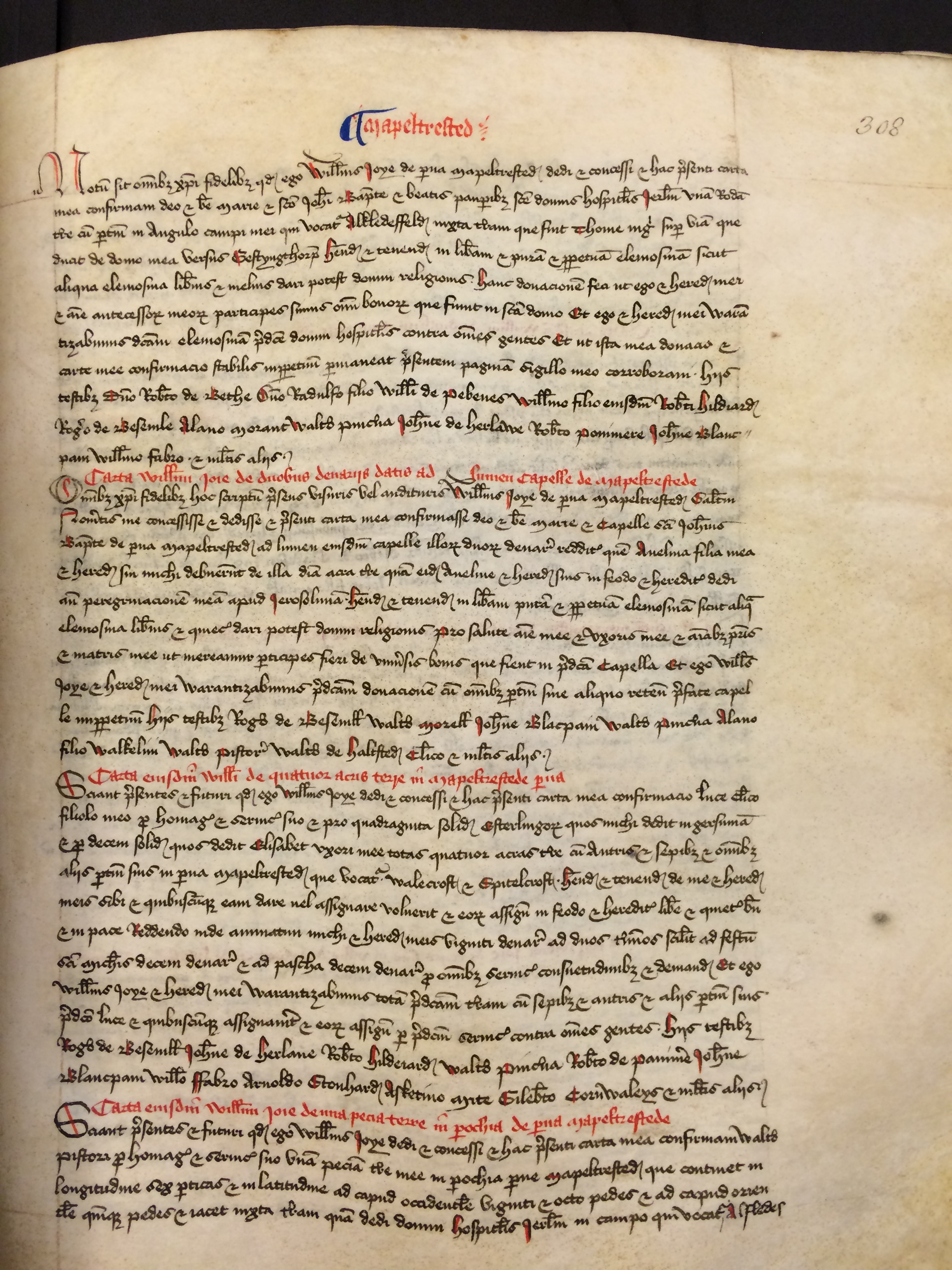Sciant presentes et futuri quod ego Willelmus Ioyename dedi et concessi et hac presenti carta mea confirmavi Luce clerico filioloname meo pro homagio et servicio suo et pro quadraginta solidis esterlingorum quos michi dedit in gersumam et pro decem solidis quos dedit Elisabet uxoriname mee totas quatuor acras terre cum antris et sepibus et omnibus aliis pertinentiis suis in parva Mapeltrestede que vocatur Walecroft et Spitelcroft habendas et tenendas de me et heredibus meis sibi et quibuscumque eam dare vel assignare voluerit et eorum assignatis in feodo et hereditate libere et quiete bene et in pace reddendo inde annuatim michi et heredibus meis viginti denarios ad duos terminos scilicet ad festum sancti Michaelis decem denarios et ad Pascha decem denarios pro omnibus serviciis consuetudinibus et demandis Et ego Willelmus Ioyename et heredes mei warantizabimus totam predictam terram cum sepibus et antris et aliis pertinentiis suis predicto Lucename et quibuscumque assignaverit et eorum assignatis per predictum servicium contra omnes gentes Hiis testibus Rogero de Besevillname[] Iohanne de Herlauename Roberto Hildeiardname[] Waltero pincernaname Roberto de Panimerename Iohanne Blancpainname Willelmo fabroname Arnoldo Stonhardname[] Asketino Mitename Gileberto Cornwaleysname et multis aliis