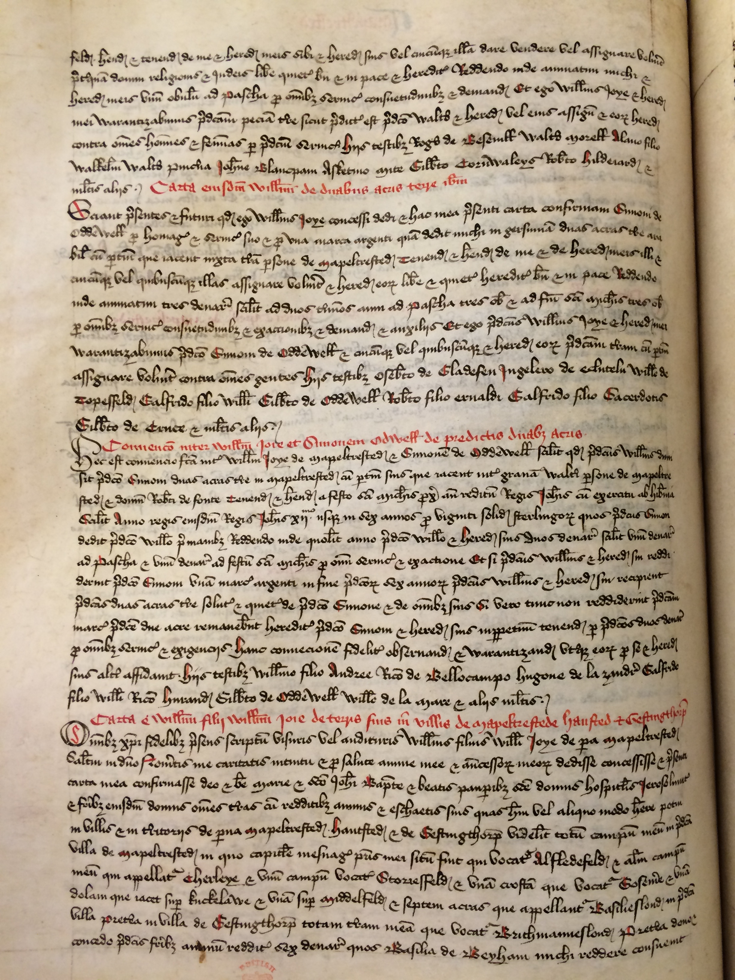 Hec est convencio facta inter Willelmum Ioye de Mapeltrestede et Simonem de Oddewell[] scilicet quod predictus Willelmus dimisit predicto Simoni duas acras terre in Mapeltrestede cum pertinentiis suis que iacent inter gravam Walteri persone de Mapeltrestede et domum Roberti de Fonte tenend et habend a festo sancti Michaelis proximo ante reditum regis Iohannis cum exercitu ab Hibernia scilicet anno regni eiusdem regis Iohannis duodecimo usque in sex annos pro viginti solidis sterlingorum quos predictus Simon dedit predicto Willelmo premanibus reddendo inde quolibet anno predicto Willelmo et heredibus suis duos denarios scilicet unum denarium ad Pascha et unum denarium ad festum sancti Michaelis pro omne servicio et exactione Et si predictus Willelmus et heredes sui reddiderint predicto Simoni unam marcam argenti in fine predictorum sex annorum predictus Willelmus et heredes sui recipient predictas duas acras terre solute et quiete de predicto Simone et de omnibus suis Si vero tunc non reddiderint predictam marcam predicte due acre remanebunt hereditarie predicto Simoni et heredibus suis in perpetuum tenend per predictos duos denarios pro omnibus serviciis et exigenciis Hanc convencionem fideliter observandam et warantizandam uterque eorum pro se et heredibus suis alteri affidavit Hiis testibus Willelmo Andree Ricardo de Bellocampo Hugone de la Zandr[] Galfrido filio Willelmi Ricardo Hurand[] Gilberto de Oddewell[] Willelmo de la Mare et aliis multis