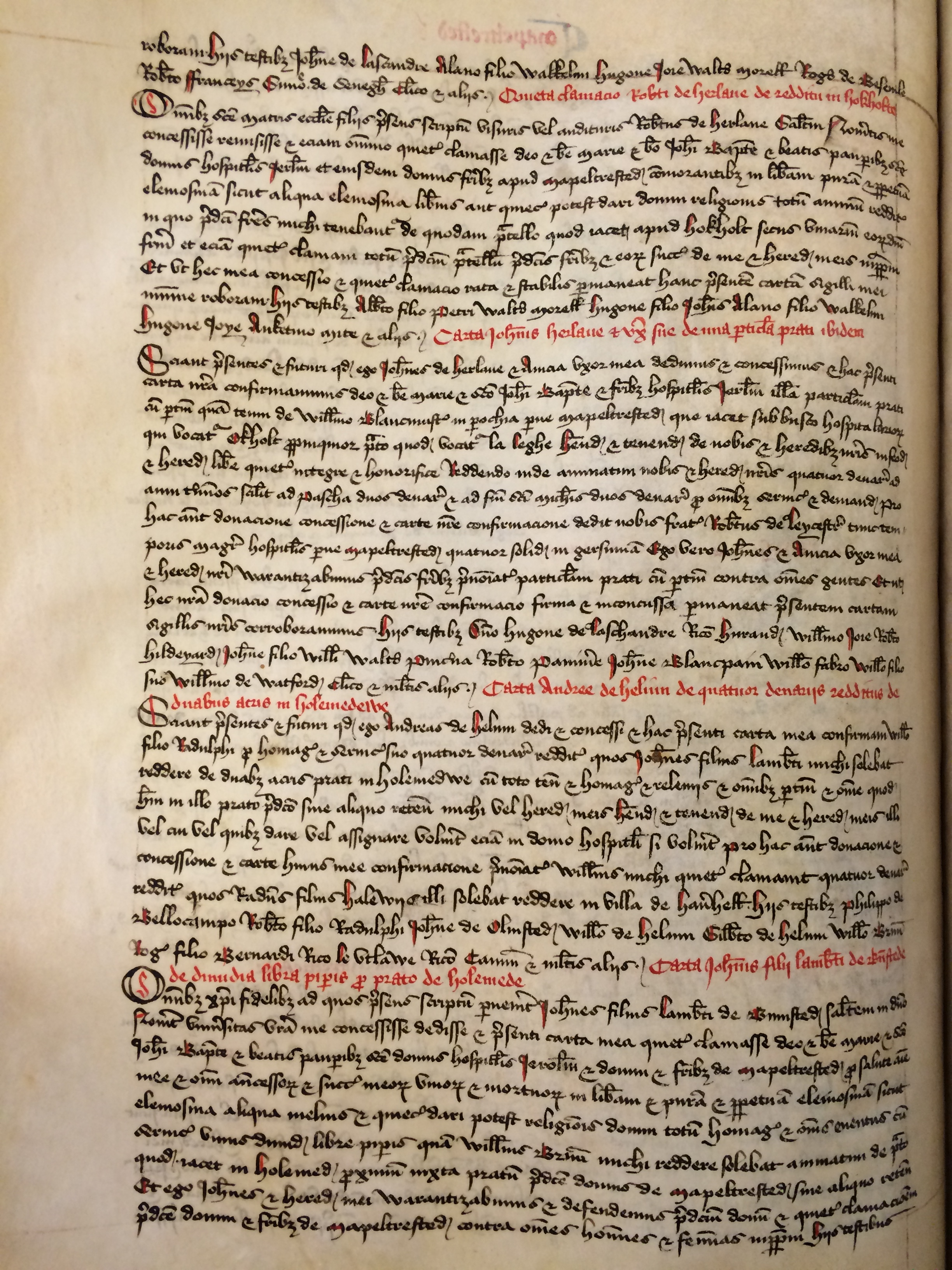 Omnibus Christi fidelibus ad quos presens scriptum pervenerit Iohannes filius Lamberti de Bumsted[] salutem in Domino Noverit universitas vestra me concessisse dedisse et presenti carta mea quietum clamasse Deo et beate Marie et sancto Iohanni Baptiste et beatis pauperibus sancte domus hospitalis Ierosalem et domui et fratribus de Mapeltrestede pro salute anime mee et omnium antecessorum et successorum meorum vivorum et mortuorum in liberam et puram et perpetuam elemosinam sicut elemosina aliqua melius et quiecius dari potest religionis domui totum homagium et omnes eventus cum servicio unius dimidie libre piperis quam Willelmus Brun[] michi reddere solebat annuatim de prato quod iacet in Holemed[] proximum iuxta pratum predicte domus de Mapeltrestede sine aliquo retento Et ego Iohannes et heredes mei warantizabimus et defendemus predictum donum et quietam clamacionem predicte domui et fratribus de Mapeltrestede contra omnes homines et feminas in perpetuum Hiis testibus Gilberto de Bailol Rogero de Bailol Rogero filio Bernardi Michaele filio Ioce Galfrido Gallico Willelmo filio Warini Galfrido Temprenoyse Roberto de Heliun et aliis