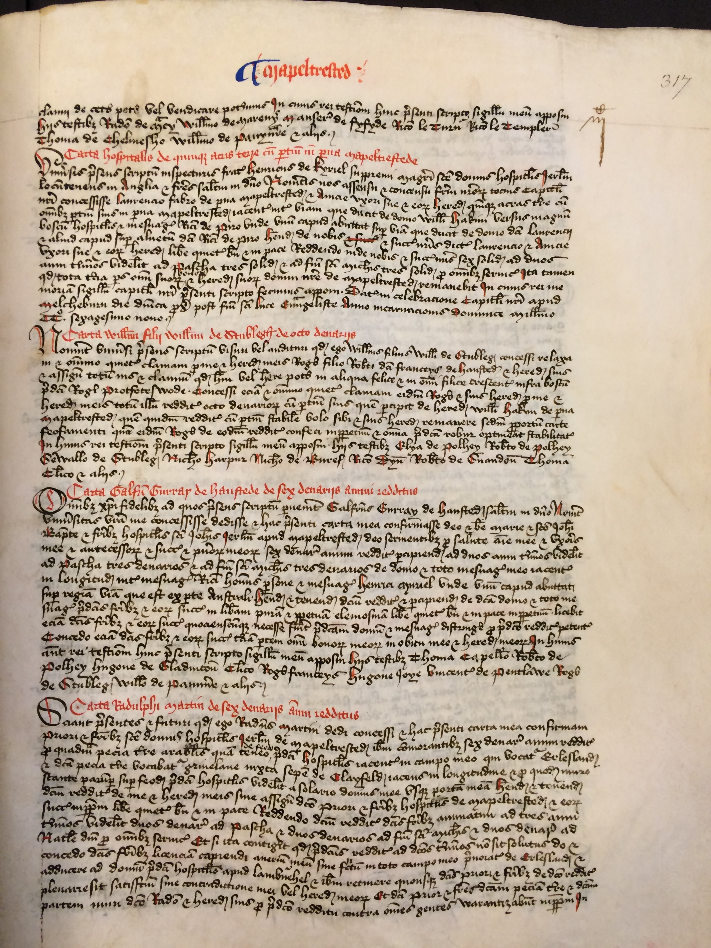 Sciant presentes et futuri quod ego Radulphus Martin dedi concessi et hac presenti carta mea confirmavi priori et fratribus sancte domus hospitalis Ierusalem de Mapeltrestede ibidem commorantibus sex denarios annui redditus pro quadam pecia terre arabilis quam teneo de feodo predicti hospitalis iacenti in campo meo qui vocatur Erlesland[] et dicta pecia terre vocabatur Grinelane iuxta sepem de Clayfeld[] iacens in longitudine et pro quodam muro stante parumper super feodum predicti hospitalis videlicet a solario domus mee usque portam meam habendum et tenendum dictum redditum de me et heredibus meis sive assignatis dicto priori et fratribus hospitalis de Mapeltrestede et eorum successoribus in perpetuum libere quiete bene et in pace reddendo dictum redditum dictis fratribus annuatim ad tres anni terminos videlicet duos denarios ad Pascha et duos denarios ad festum sancti Michaelis et duos denarios ad Natale Domini pro omnibus serviciis et si ita contigerit quod predictus redditus ad dictos terminos non sit solutus do et concedo dictis fratribus licenciam capiendi averium meum sive fructum in toto campo meo prenominato de Erlesland[] et adducere ad domum predicti hospitalis apud Lamburnehel et ibidem retinere quousque dictis priori et fratribus de dicto redditu plenarie sit satisfactum sine contradictione mei vel heredum meorum Et dicti prior et fratres dictam peciam terre et dictam partem muri dicto Radulpho et heredibus suis pro predicto redditu contra omnes gentes warantizabunt in perpetuum In cuius rei testimonium huic presenti carte cyrographate predictus Radulphus Martin et frater Iohannes de Capenore tunc magister de Mapeltrestede sigilla sua hinc et inde alternatim apposuerunt Hiis testibus fratre Ricardo de Muncton[] fratre Willelmo Luvell[] Iohanne capellano Willelmo de Lamburne Henrico de Lamburne Willelmo de Bynesle Iohanne Deu Philippo marcatore Iohanne Stoket Hugone clerico et aliis