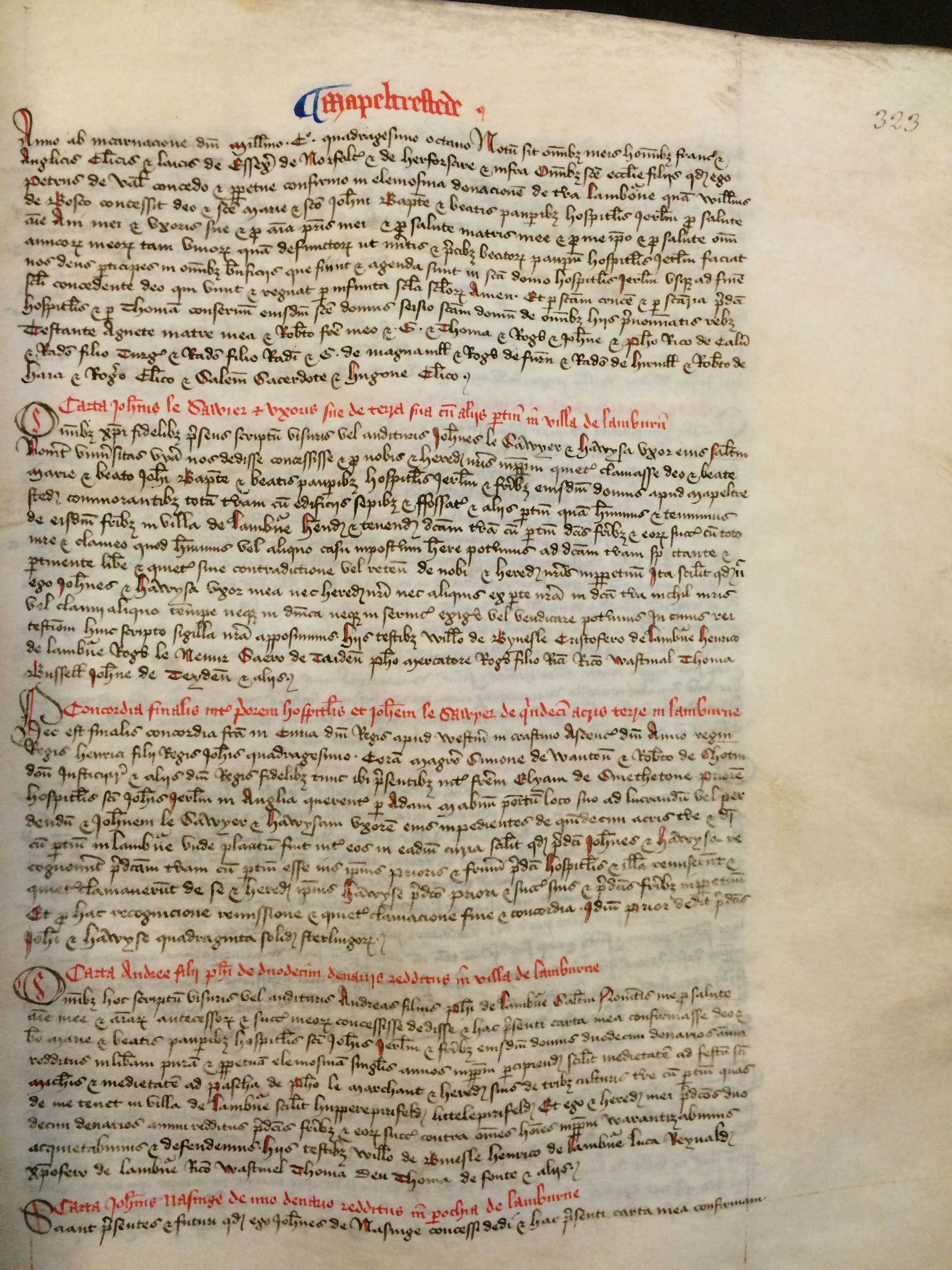 Omnibus hoc scriptum visuris vel audituris Andreas filius Philippi de Lamburne salutem Noveritis me pro salute anime mee et animarum antecessorum et successorum meorum concessisse dedisse et hac presenti carta mea confirmasse Deo et beate Marie et beatis pauperibus hospitalis sancti Iohannis Ierusalem et fratribus eiusdem domus duodecim denarios annui redditus in liberam puram et perpetuam elemosinam singulis annis in perpetuum percipiendos scilicet medietatem ad festum sancti Michaelis et medietatem ad Pascha de Philippo le marchant et heredibus suis de tribus culturis terre cum pertinentiis quas de me tenet in villa de Lamburne scilicet Hupperepirifeld[] [et] Littelepirifeld[] Et ego et heredes mei predictos duodecim denarios annui redditus predictis fratribus et eorum successoribus contra omnes homines in perpetuum warantizabimus acquietabimus et defendemus Hiis testibus Willelmo de Binesle Henrico de Lamburne Luca Reynald[] Cristofero de Lamburne Ricardo Wastinel Thoma Deu Thoma de Fonte et aliis