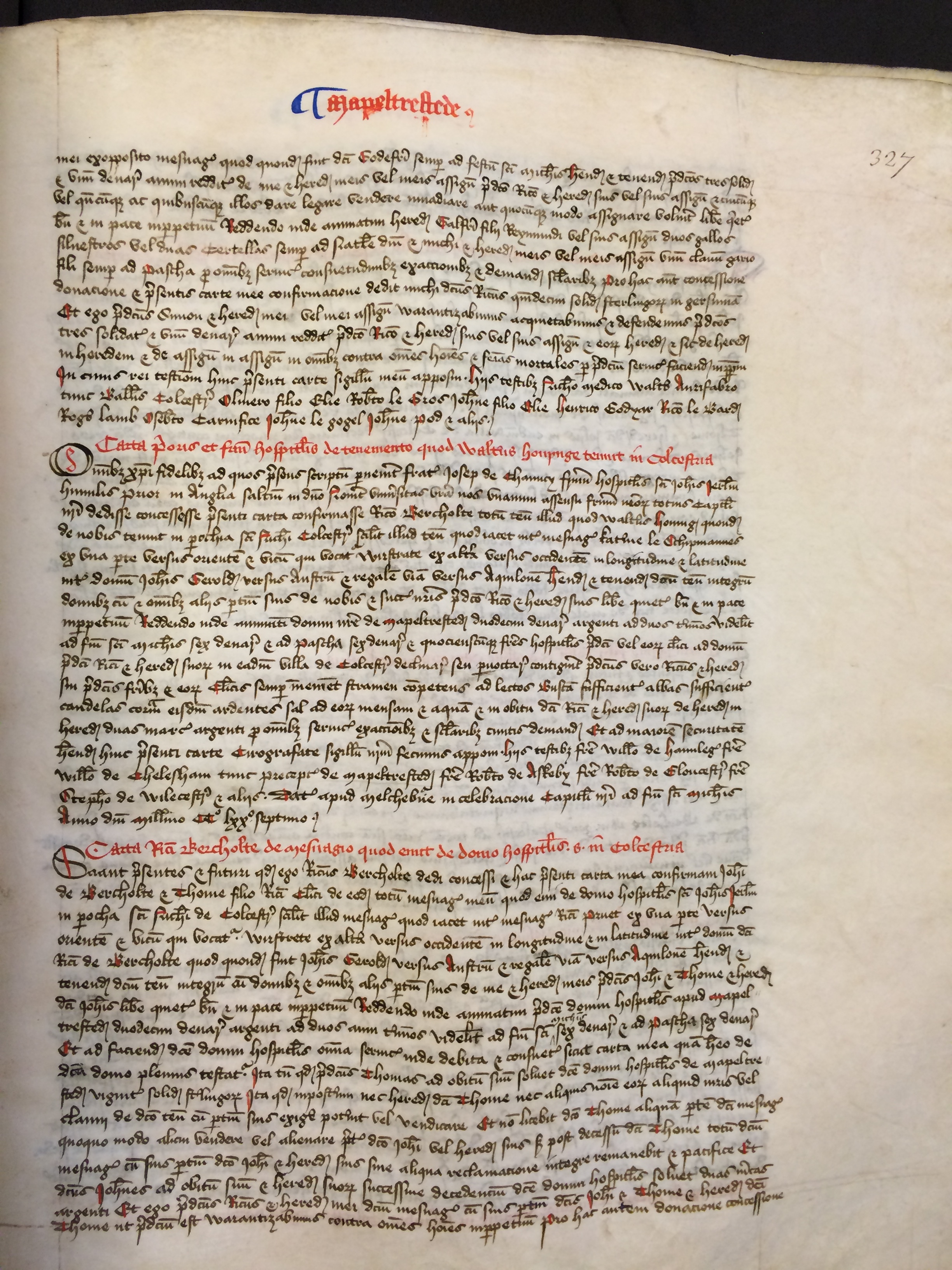 Omnibus Christi fidelibus ad quos presens scriptum perveneritintitulatio-salutatio standard frater Iosep de Chauncy fratrum hospitalis sancti Iohannis Ierusalem humilis prior in Angliaintitulatio-salutatio particulars salutem in Dominointitulatio-salutatio standard Noverit universitas vestranotification noswords of disposition standard unanimi assensu fratrum nostrorum totius capituli nostriconsent clause dedisse concessisse [et hac] presenti carta confirmassewords of disposition standard Ricardo Bercholtegrantee particulars totumobject of conveyance particulars tenementumobject of conveyance standard illud quod Walterus Honing quondam de nobis tenuit in parochia sancti Nicholai Colcestr[ie]object of conveyance particulars scilicet illud tenementum quod iacet inter mesuagium Katerine le schipmannes ex una parte versus orientem et vicum qui vocatur Wirstrate ex altera versus occidentem in longitudine et latitudine inter domum Iohannis Gerold versus austrum et regalem viam versus aquilonemland extent habend et tenend dictumhabendum clause standard tenementumhabendum clause particulars integrum cum domibus et cum omnibus aliis pertinentiis suis de nobis et successoribus nostris predictohabendum clause standard Ricardohabendum clause particulars et heredibus suis libere quiete bene et in pace in perpetuumhabendum clause standard reddendo inde annuatimpayment clause standard domui nostre de Mapeltrestede duodecimpayment clause particulars denarios argenti ad duos terminos videlicet ad festum sancti Michaelispayment clause standard sexpayment clause particulars denarios et ad Paschapayment clause standard sexpayment clause particulars denariospayment clause standard et quocienscumque fratres hospitalis predicti vel eorum clerici ad domum predicti Ricardi et heredum suorum in eadem villa de Colcestr[ia] declinare seu pernoctare contigerint predictus vero Ricardus et heredes sui predictis fratribus et eorum clericis semper invenient stramen competens ad lectos buscam sufficienter albas sufficienter candelas coram eisdem ardentes sal ad eorum mensam et aquam et in obitu dicti Ricardi et heredum suorum de herede in heredem duas marcas argenti pro omnibus serviciis exaccionibus et secularibus cunctis demandisclausulae Et ad maiorem securitatem habend huic presenti carte cirografate sigillum nostrum fecimus apponisealing clause standard Hiis testibuswitness clause standard fratre Willelmo de Haunleg fratre Willelmo de Chelesham tunc preceptore de Mapeltrestede fratre Roberto de Askeby fratre Roberto de Gloucestr[ia] fratre Stephano de Wilecestrwitness clause particulars et aliiswitness clause standard Datum apuddate clause standard Melcheburnedate clause particulars in celebracione capituli nostridate clause particulars ad festum sancti Michaelisdate clause particulars anno Dominidate clause standard millesimo ducentesimo septuagesimo septimodate clause particulars
