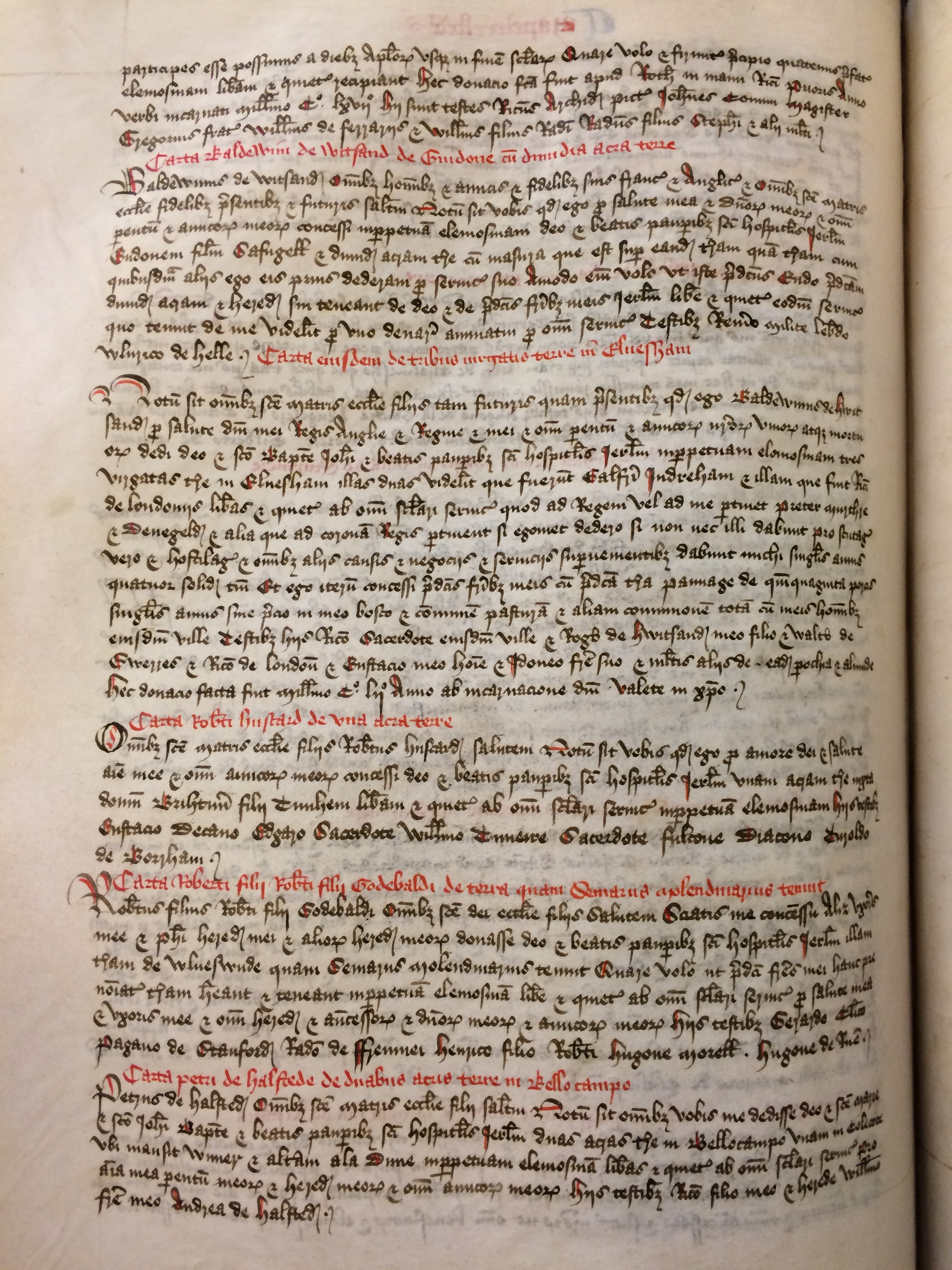 Notum sit omnibus sancte matris ecclesie filiis tam futuris quam presentibus quod ego Baldewinus de Hwitsandname pro salute domini mei regis Anglie et regine et mei et omnium parentum et amicorum nostrorum vivorum atque mortuorum dedi Deo et sancto Iohanni Baptiste et beatis pauperibus sancti hospitalis Ierusalemname in perpetuam elemosinam tresnumeral virgatas terre in Elnesham illas duasnumeral videlicet que fuerunt Galfridi Indrehamname et illam que fuit Ricardi de Londoniisname liberas et quietas ab omni seculari servicio quod ad regem vel ad me pertinet preter murthre et Denegelde et alia que ad coronam regis pertinent si egomet dederosi non nec illi dabunt Pro scutagio vero et hostilagio et omnibus aliis causis et negociis et serviciis supervenientibus dabunt michi singulis annis quatuor solidosnumeral tantum Et ego iterum concessi predictis fratribusname meis cum predicta terra pannage de quinquagintanumeral porcis singulis annis sine precio in meo bosco et communem pasturam et aliam communionem totam cum meis hominibus eiusdem ville Testibus hiis Ricardo sacerdotename eiusdem ville et Rogero de Hwitsandname meo filioname et Waltero de Gwerresname et Ricardo de Londoniisname et Eustacioname meo hominename et Idoneo fratrename suo et multis aliis de eadem parochia et aliunde Hec donacio facta fuit millesimo centesimo quinquagesimo secundo anno ab incarnacione Domini Valete in Christo