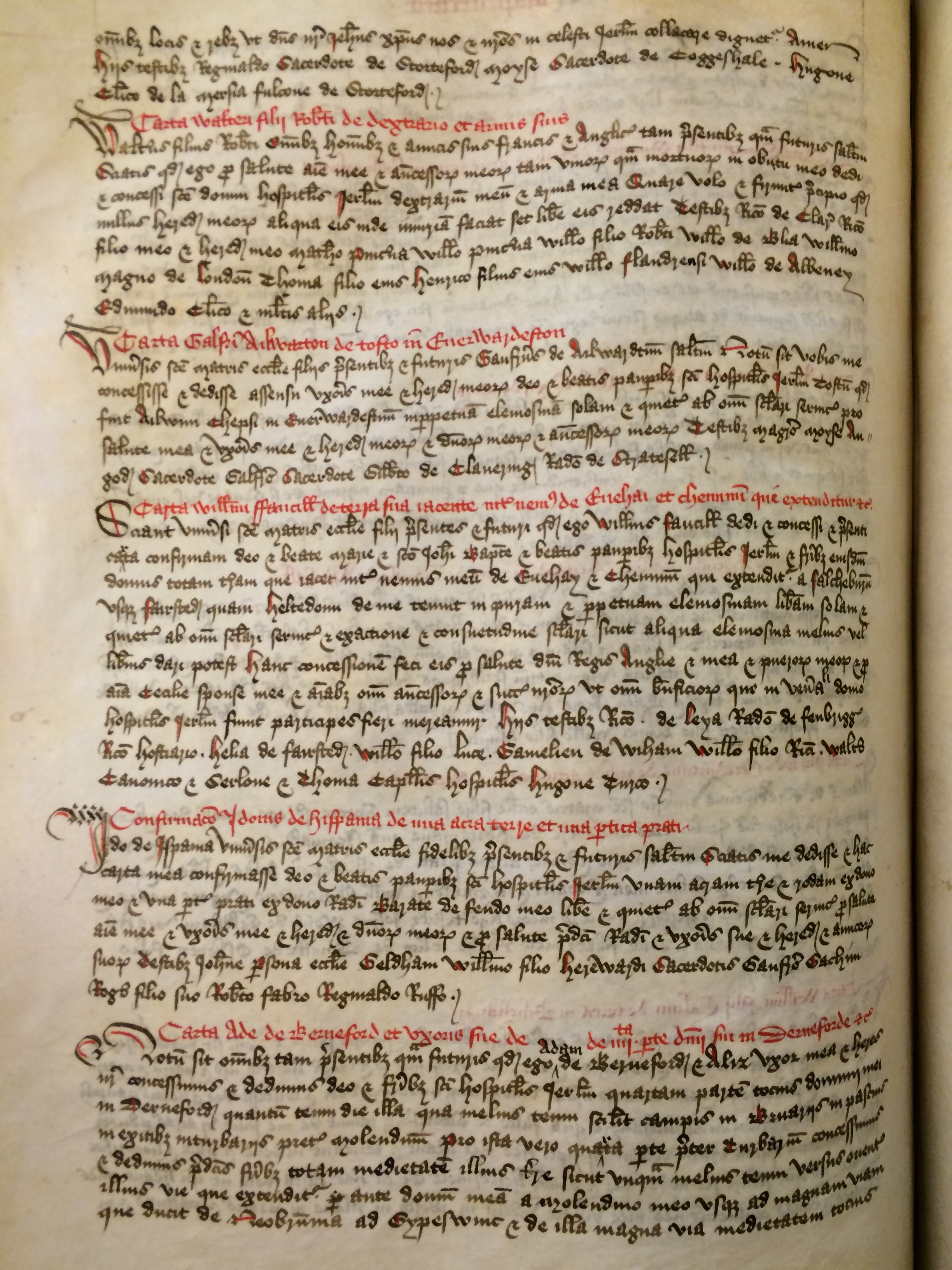 Sciant universi sancte matris ecclesie filii presentes et futuri quod ego Willelmus Faucill[] dedi et concessi et presenti carta confirmavi Deo et beate Marie et sancto Iohanni Baptiste et beatis pauperibus hospitalis Ierusalem et fratribus eiusdem domus totam terram que iacet inter nemus meum de Euehay et cheminum que extenditur a Falcheburn[] usque Fairsted[] quam Heltedoun de me tenuit in puram et perpetuam elemosinam liberam solutam et quietam ab omni seculari servicio et exactione et consuetudine seculari sicut aliqua elemosina melius vel liberius dari potest Hanc concessionem feci eis pro salute domini regis Anglie et mea et puerorum meorum et pro anima Cecilie sponse mee et animabus omnium antecessorum et successorum nostrorum ut omnium beneficiorum que in venerabili domo hospitalis Ierusalem fiunt participes fieri mereamur Hiis testibus Ricardo de Leya Radulpho de Fenbrigg[] Ricardo hostiario Helia de Fairsted[] Willelmo filio Luce Gamelien de Wiham Willelmo filio Ricardi Waltero canonico et Serlone et Thoma capellanis hospitalis Hugone Turco