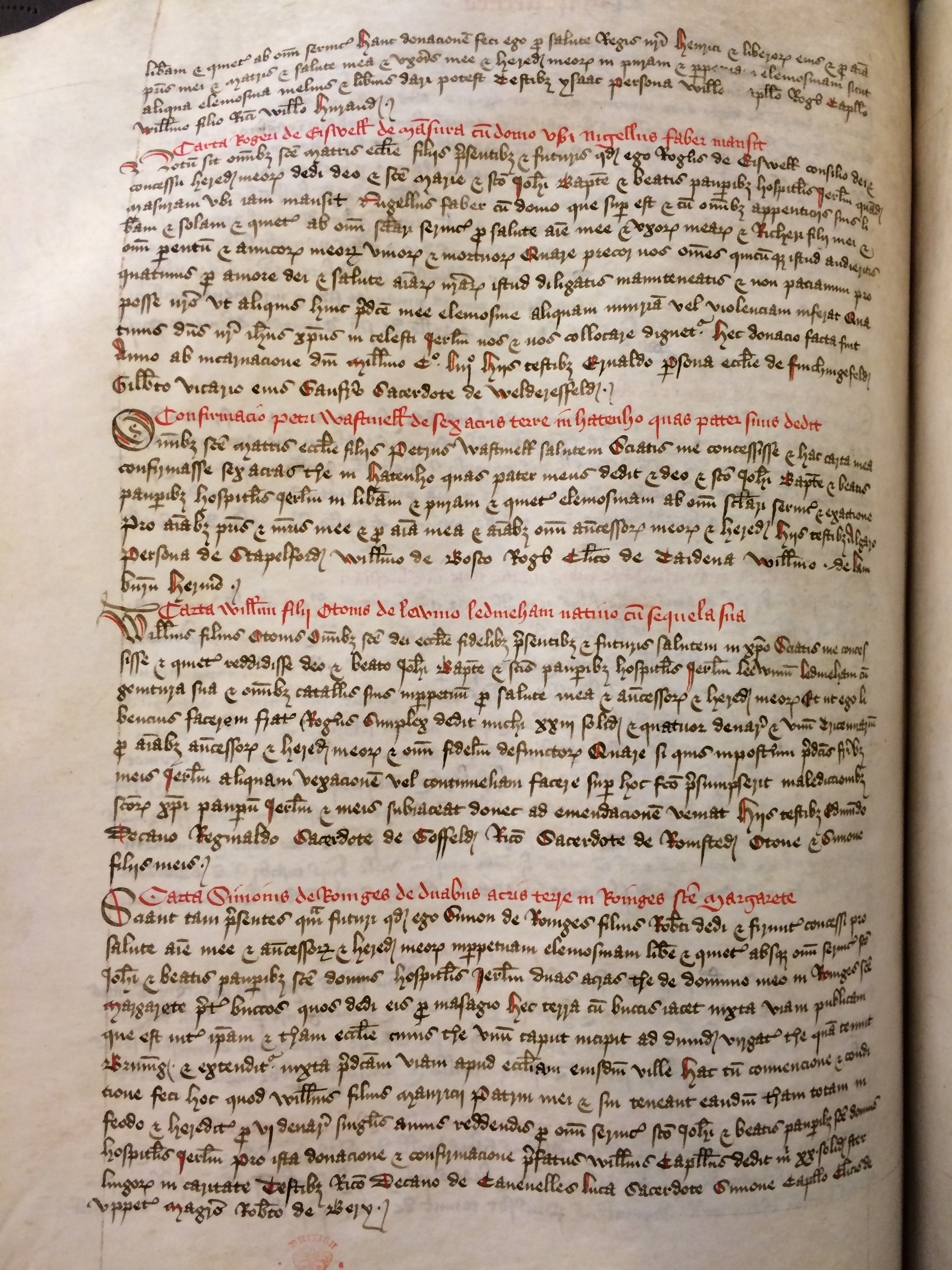 Sciant tam presentes quam futuri quod ego Simon de Roinges filius Roberti dedi et firmiter concessi pro salute anime mee et antecessorum et heredum meorum in perpetuam elemosinam libere et quietas absque omni servicio sancto Iohanni et beatis pauperibus sancte domus hospitalis Ierusalem duas acras terre de dominio meo in Roinges sancte Margarete preter buttos quos dedi eis pro masagio hec terra cum buttis iacet iuxta viam publicam que est inter ipsam et terram ecclesie cuius terre unum caput incipit ad dimidiam virgatam terre quam tenuit Bruning et extenditur iuxta predictam viam apud ecclesiam eiusdem ville Hac tamen convencione et conditione feci hoc quod Willelmus filius Mauricii patrui mei et [heredes] sui teneant eandem terram totam in feodo et hereditate pro vi denariis singulis annis reddendis pro omni servicio sancto Iohanni et beatis pauperibus sancte domus hospitalis Ierusalem Pro ista donacione et confirmacione prefatus Willelmus capellanus dedit michi xx solidos sterlingorum in caritate Testibus Ricardo decano de Canevelles Luca sacerdote Simone capellano clericis de Uppet[on] magistro Roberto de Bery