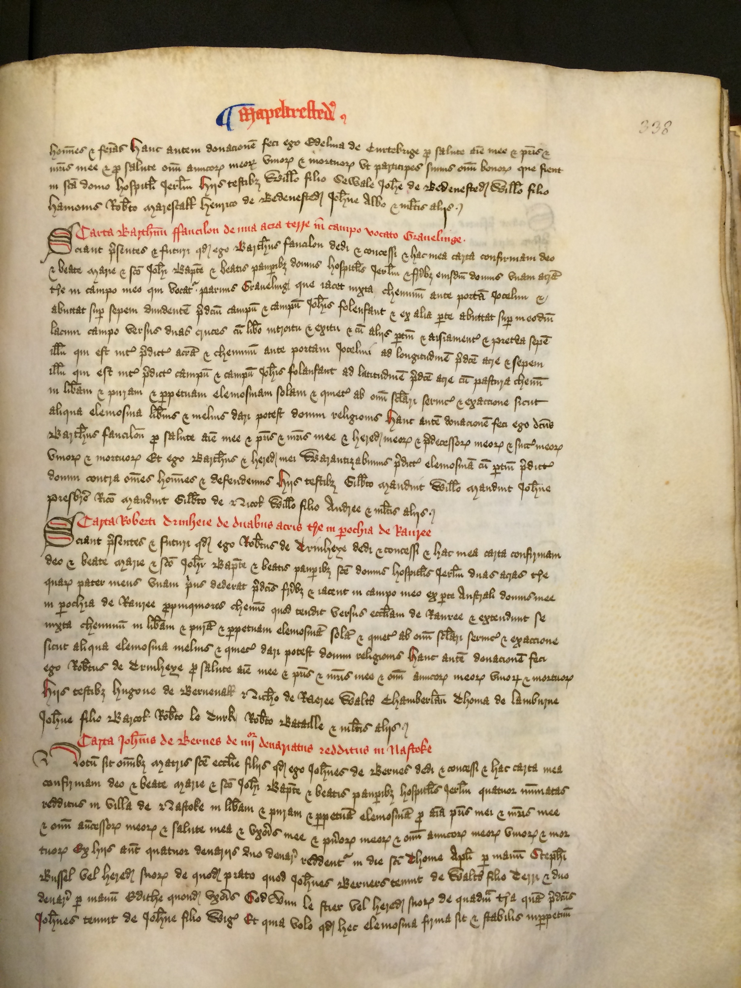 Sciant presentes et futuri quod ego Robertus de Trinheyename dedi et concessi et hac mea carta confirmavi Deo et beate Marie et sancto Iohanni Baptiste et beatis pauperibus sancte domus hospitalis Ierusalemname duas acras terre quarum pater meus unam prius dederat predictis fratribusname et iacent in campo meo ex parte australi domus mee in parochia de Rauree propinquiores chemino quod tendit versus ecclesiam de Rauree et extendunt se iuxta cheminum in liberam et puram et perpetuam elemosinam solutam et quietam ab omni seculari servicio et exaccione sicut aliqua elemosina melius et quiecius dari potest domui religionis Hanc autem donacionem feci ego Robertus de Trinheyename pro salute anime mee et patris et matris mee et omnium amicorum meorum vivorum et mortuorum Hiis testibus Hugone de Bernevallname[] Nicholao de Raereename Waltero chamberlanname[] Thoma de Lamburnename Iohanne filio Bartolomeiname Roberto le Turkname Roberto Bataillename et multis aliis