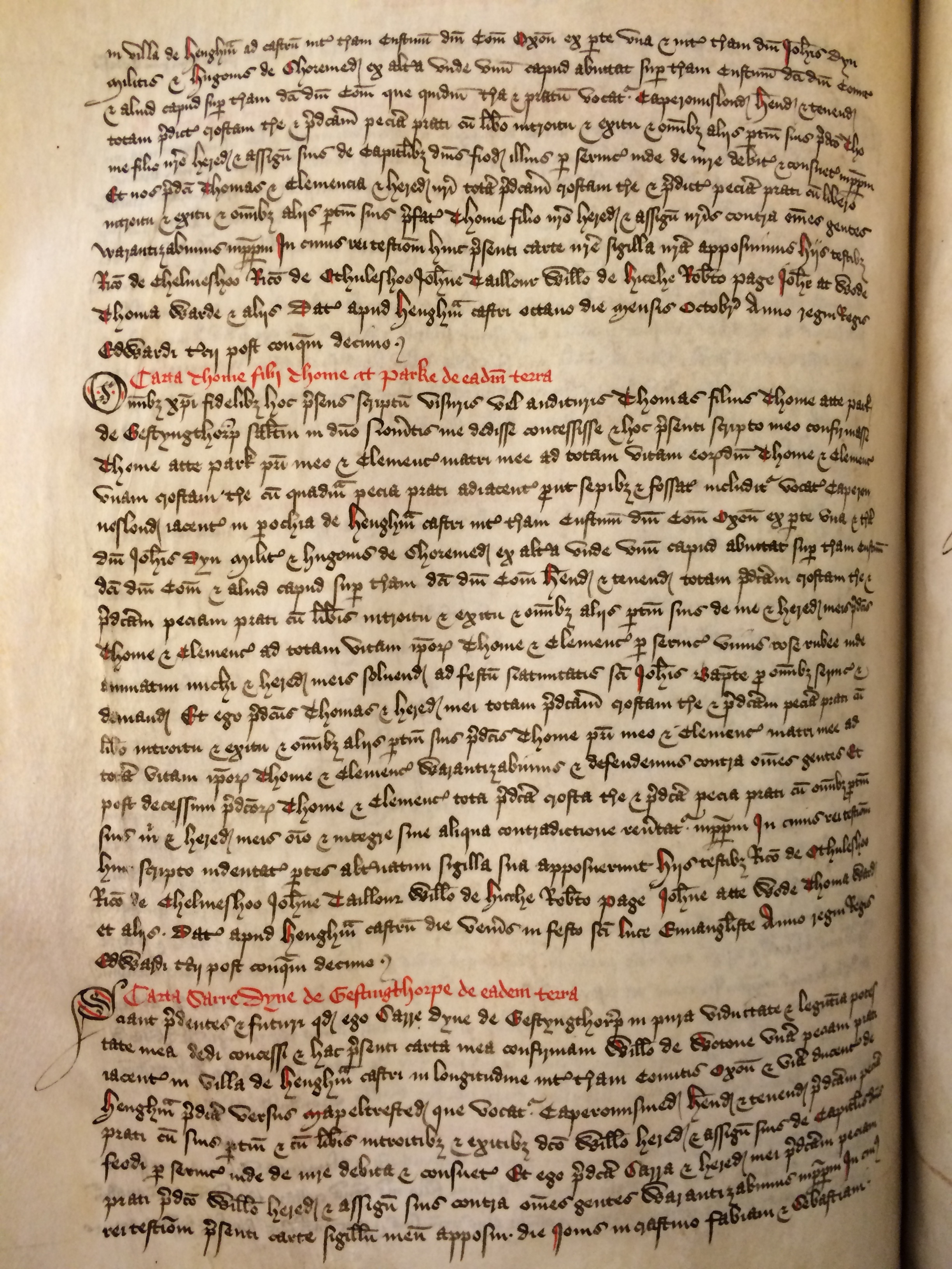 Omnibus Christi fidelibus hoc presens scriptum visuris vel audituris Thomas filius Thome atte Park de Gestyngthorp salutem in Domino Noveritis me dedisse concessisse et hoc presenti scripto meo confirmasse Thome atte Park patri meo et Clemencie matri mee ad totam vitam eorundem Thome et Clemencie unam croftam terre cum quadam pecia prati adiacente prout sepibus et fossatis includitur vocatam Caperouneslond iacentem in parochia de Hengham Castri inter terram custumariam domini comitis Oxon[ie] ex parte una et terram domini Iohannis Dyn militis et Hugonis de Shoremed ex altera unde unum capud abuttat super terram custumariam dicti domini comitis et aliud capud super terram dicti domini comitis habend et tenend totam predictam croftam terre et predictam peciam prati cum liberis introitu et exitu et omnibus aliis pertinentiis suis de me et heredibus meis predictis Thome et Clemencie ad totam vitam ipsorum Thome et Clemencie per servicium unius rose rubee inde annuatim michi et heredibus meis solvende ad festum nativitatis sancti Iohannis Baptiste pro omnibus serviciis et demandis Et ego predictus Thomas et heredes mei totam predictam croftam terre et predictam peciam prati cum libero introitu et exitu et omnibus aliis pertinentiis suis predictis Thome patri meo et Clemencie matri mee ad totam vitam ipsorum Thome et Clemencie warantizabimus et defendemus contra omnes gentes et post decessum predictorum Thome et Clemencie tota predicta crofta terre et predicta pecia prati cum omnibus pertinentiis suis michi et heredibus meis omnino et integre sine aliqua contradictione revertatur in perpetuum In cuius rei testimonium huic scripto indentato partes alternatim sigilla sua apposuerunt Hiis testibus Ricardo de Othuleshoo Ricardo de Chelmeshoo Iohanne taillour Willelmo de Hicche Roberto page Iohanne atte Wode Thoma ward et aliis Datum apud Hengham Castrum die veneris in festo sancti Luce Evvangeliste anno regni regis Edwardi tercii post conquestum decimo