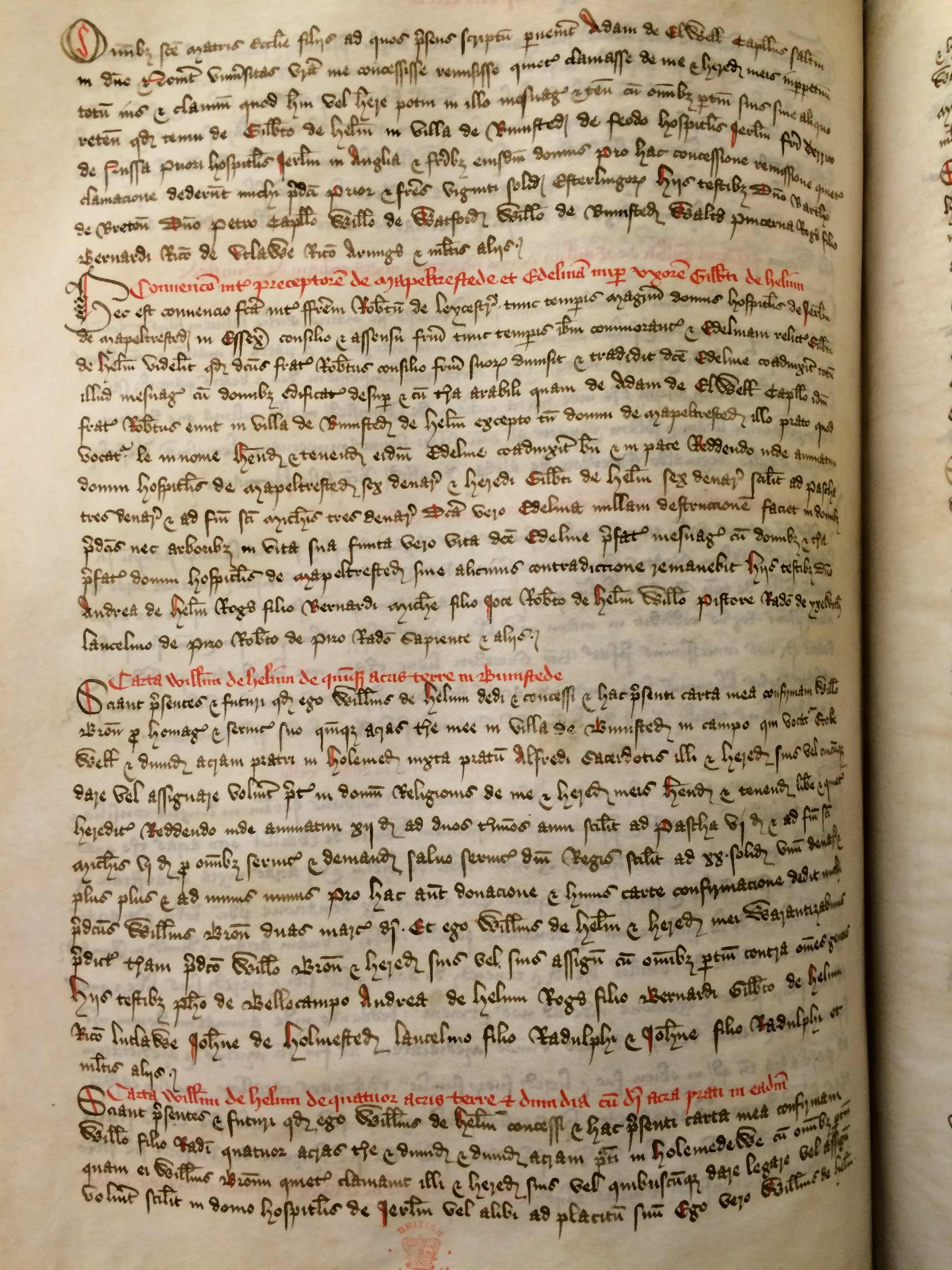 Omnibus sancte matris ecclesie filiis ad quos presens scriptum pervenerit Adam de Elwell[] capellanusname salutem in Domino Noverit universitas vestra me concessisse remisisse quietum clamasse de me et heredibus meis in perpetuum totum ius et clamium quod habui vel habere potui in illo mesuagio et tenemento cum omnibus pertinentiis suis sine aliquo retento quod tenui de Gilberto de Heliunname in villa de Bumsted[] de feodo hospitalis Ierusalemname fratri Terrico de Nussa priori hospitalis Ierusalem in Anglianame et fratribusname eiusdem domus Pro hac concessione remissione [et] quieta clamacione dederunt michi predicti priorname et fratresname viginti solidos esterlingorum Hiis testibus domino Bartholomeo de Bretonname[] domino Petro capellanoname Willelmo de Watfordname[] Willelmo de Bumstedname[] Waltero pincernaname Rogero filio Bernardiname Ricardo le Utlawename Ricardo armigeroname et multis aliis