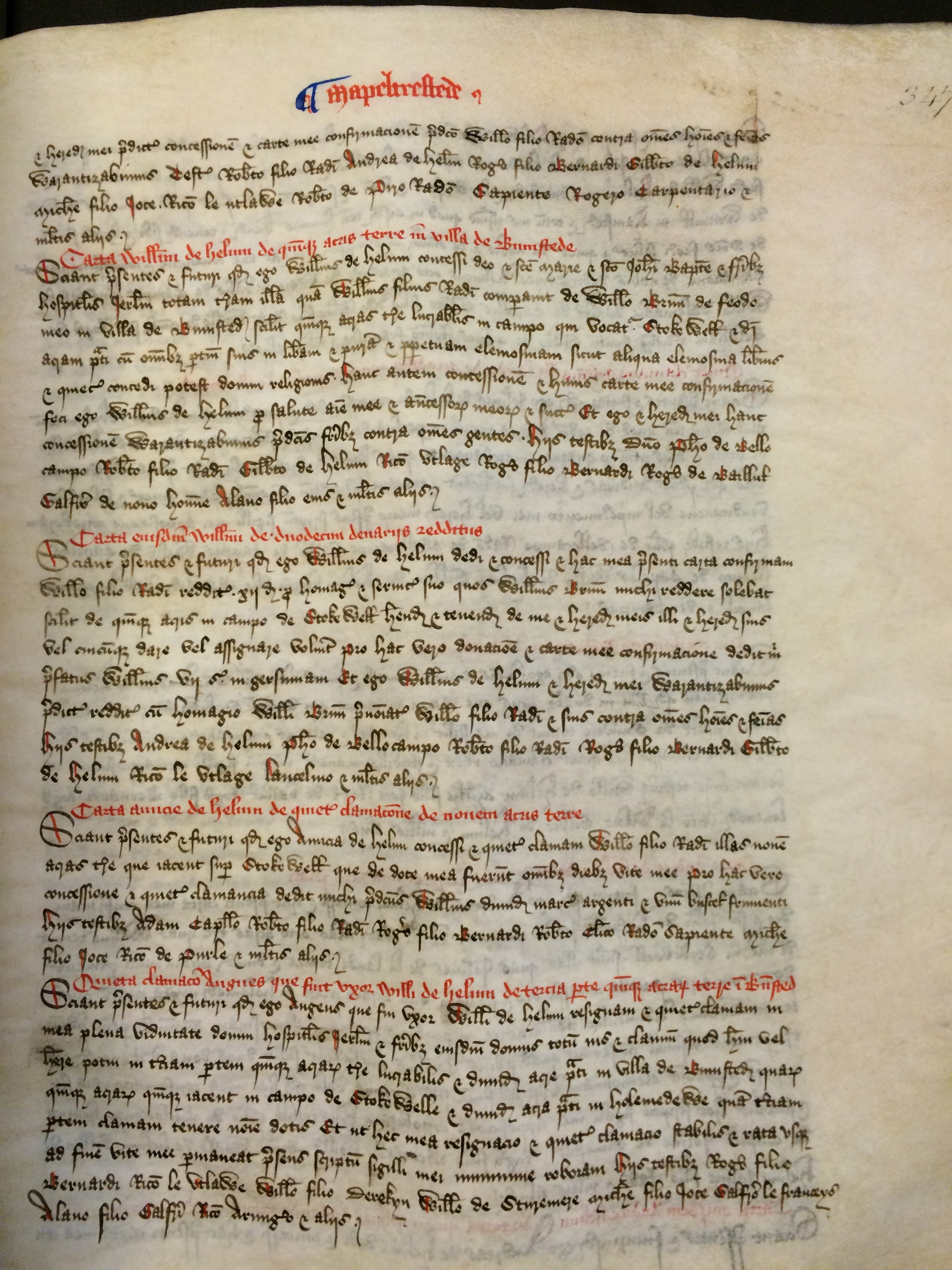 Sciant presentes et futuri quod ego Angnes que fui uxor Willelmi de Heliun resignavi et quietum clamavi in mea plena viduitate domui hospitalis Ierusalem et fratribus eiusdem domus totum ius et clamium quod habui vel habere potui in terciam partem quinque acrarum terre lucrabilis et dimidie acre prati in villa de Bumsted[] quarum quinque acrarum [et dimidie] quinque iacent in campo de Stokewelle et dimidia acra prati in Holemedewe quam terciam partem clamavi tenere nomine dotis Et ut hec mea resignacio et quieta clamacio stabilis et rata usque ad finem vite mee permaneat presens scriptum sigilli mei munimine roboravi Hiis testibus Rogero filio Bernardi Ricardo le Utlawe Willelmo filio Derekyn Willelmo de Sturemere Michaele filio Ioce Galfrido le Franceys Alano filio Galfridi Ricardo armigero et aliis
