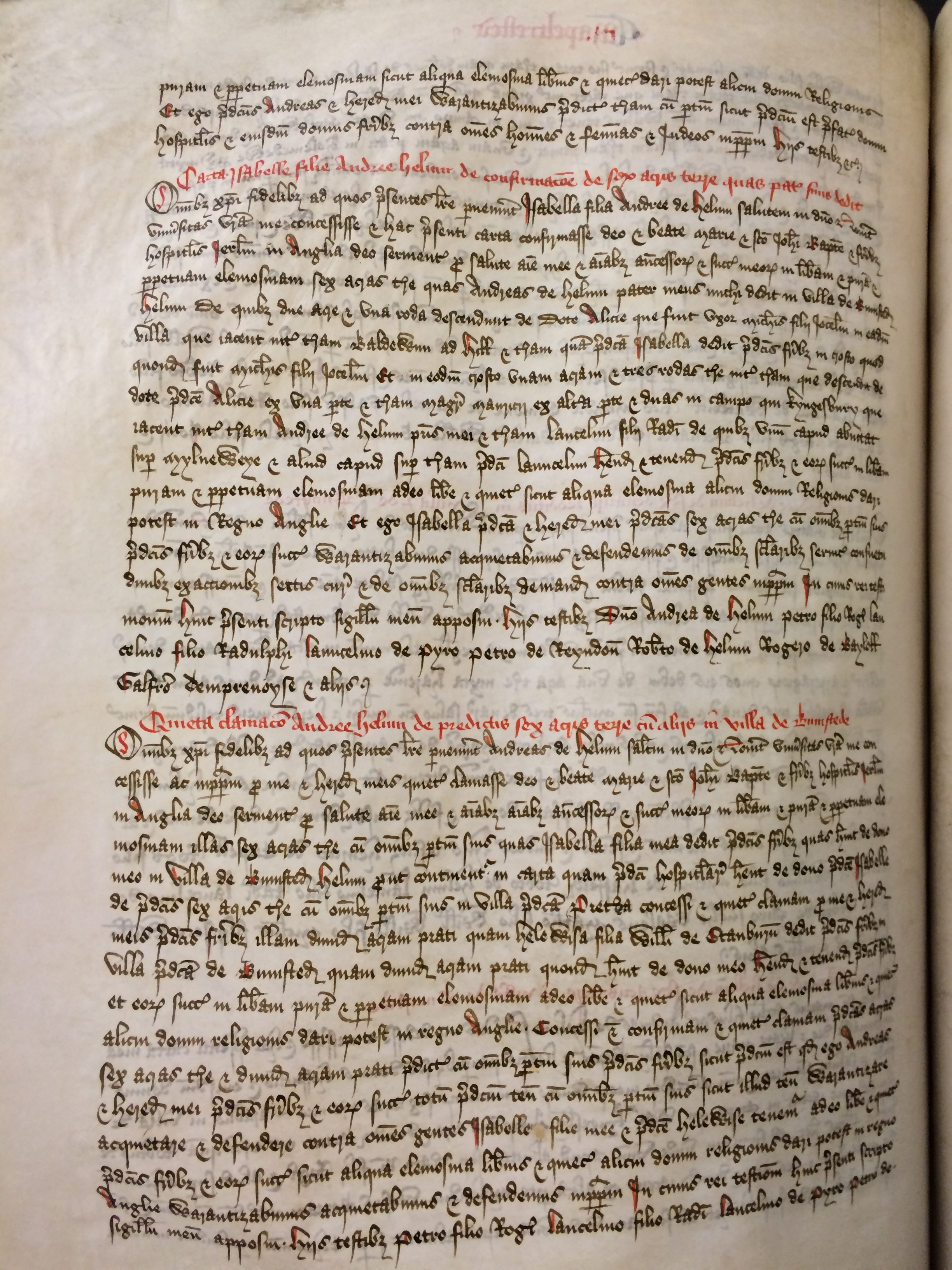 Omnibus Christi fidelibus ad quos presentes litere pervenerint Isabella filia Andree de Heliunname salutem in Domino Noverit universitas vestra me concessisse et hac presenti carta confirmasse Deo et beate Marie et sancto Iohanni Baptiste et fratribus hospitalis Ierusalem in Anglianame Deo servientibus pro salute anime mee et animabus antecessorum et successorum meorum in liberam et puram et perpetuam elemosinam sex acras terre quas Andreas de Heliun pater meusname michi dedit in villa de Bumsted[] Heliun de quibus due acre et una roda descendunt de dote Alicie que fuit uxor Michaelis filii Iocelininame in eadem villa que iacent inter terram Baldewini ad Hill[] et terram quam predicta Isabellaname dedit predictis fratribusname in crofto quod quondam fuit Michaelis filii Iocelininame et in eodem crofto unam acram et tres rodas terre inter terram que descendit de dote predicte Aliciename ex una parte et terram magistri Mauriciiname ex altera parte et duas [acras] in campo qui [vocatur] Kyngesbury que iacent inter terram Andree de Heliun patris meiname et terram Lancelini filii Radulphiname de quibus unum capud abuttat super Mylneweye et aliud capud super terram predicti Launcelininame habendas et tenendas predictis fratribusname et eorum successoribus in liberam puram et perpetuam elemosinam adeo libere et quiete sicut aliqua elemosina alicui domui religionis dari potest in regno Anglie Et ego Isabellaname predicta et heredes mei predictas sex acras terre cum omnibus pertinentiis suis predictis fratribusname et eorum successoribus warantizabimus acquietabimus et defendemus de omnibus secularibus serviciis consuetudinibus exactionibus sectis curie et de omnibus secularibus demandis contra omnes gentes in perpetuum In cuius rei testimonium huic presenti scripto sigillum meum apposui Hiis testibus domino Andrea de Heliunname Petro filio Rogeriname Lancelino filio Radulphiname Launcelino de Pyroname Petro de Reyndonname[] Roberto de Heliunname Rogero de Baylollname[] Galfrido Temprenoysename et aliis