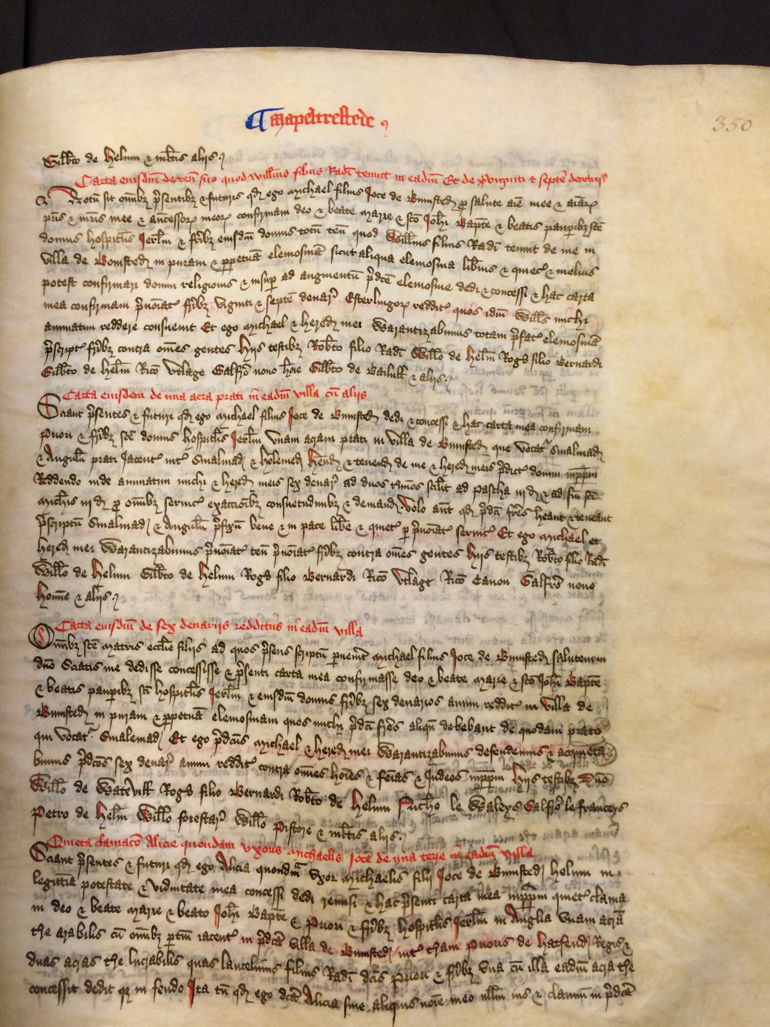 Notum sit omnibus presentibus et futuris quod ego Michael filius Ioce de Bumstedname[] pro salute anime mee et animarum patris et matris mee et antecessorum meorum confirmavi Deo et beate Marie et sancto Iohanni Baptiste et beatis pauperibus sancte domus hospitalis Ierusalem et fratribusname eiusdem domus totum tenementum quod Willelmus filius Radulphiname tenuit de me in villa de Bomsted[] in puram et perpetuam elemosinam sicut aliqua elemosina liberius et quiecius et melius potest confirmare domui religionis et insuper ad augmentum predicte elemosine dedi et concessi et hac carta mea confirmavi prenominatis fratribusname viginti et septem denarios esterlingorum redditus quod idem Willelmusname michi annuatim reddere consuevit Et ego Michaelname et heredes mei warantizabimus totam prefatam elemosinam prescriptis fratribusname contra omnes gentes Hiis testibus Roberto filio Radulphiname Willelmo de Heliunname Rogero filio Bernardiname Gilberto de Heliunname Ricardo Utlagename Galfrido novo hominename Gilberto de Bailullname[] et aliis