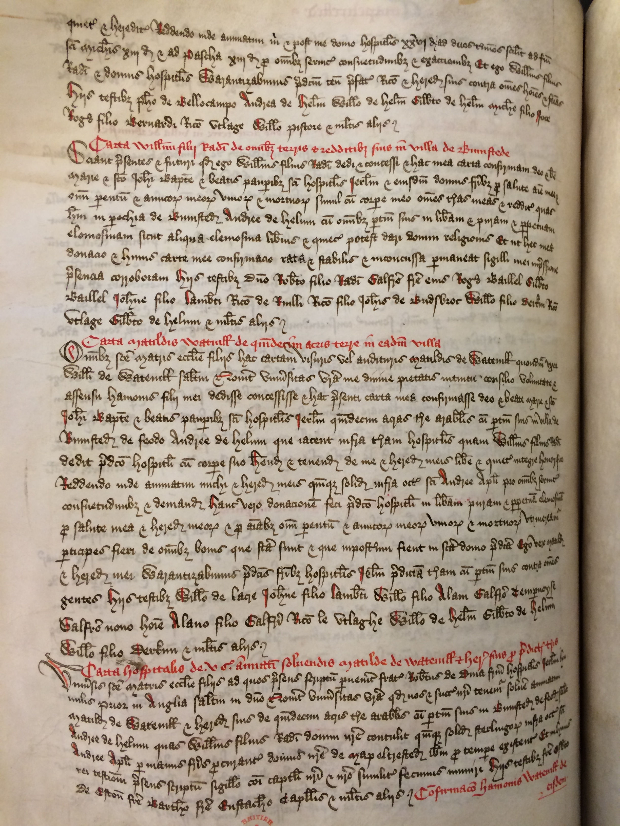 Omnibus sancte matris ecclesie filiis hac cartam visuris vel audituris Matildis de Watevillname[] quondam uxor Willelmi de Watevillname[] salutem Noverit universitas vestra me divine pietatis intuitu consilio voluntate et assensu Hamonis filii meiname dedisse concessisse et hac presenti carta mea confirmasse Deo et beate Marie et sancto Iohanni Baptiste et beatis pauperibus sancti hospitalis Ierusalemname quindecim acras terre arabilis cum pertinentiis suis in villa de Bumsted[] de feodo Andree de Heliunname que iacent infra terram hospitalisname quam Willelmus filius Radulphiname dedit predicto hospitaliname cum corpore suo habendas et tenendas de me et heredibus meis libere et quiete integre honorifice reddendo inde annuatim michi et heredibus meis quinque solidos infra octavum sancti Andree apostoli pro omnibus serviciis consuetudinibus et demandis Hanc vero donacionem feci predicto hospitaliname in liberam puram et perpetuam elemosinam pro salute mea et heredum meorum et pro animabus omnium parentum et amicorum meorum vivorum et mortuorum ut mereamur participes fieri de omnibus bonis que facta sunt et que inposterum fient in sancta domoname predicta Ego vero Matildisname et heredes mei warantizabimus predictis fratribus hospitalis Ierusalemname predictam terram cum pertinentiis suis contra omnes gentes Hiis testibus Willelmo de Lacrename Iohanne filio Lambertiname Willelmo filio Alaniname Galfrido Tempernoysename Galfrido novo hominename Alano filio Galfridiname Ricardo le Utlaghename Willelmo de Heliunname Gilberto de Heliunname Willelmo filio Derkininame et multis aliis