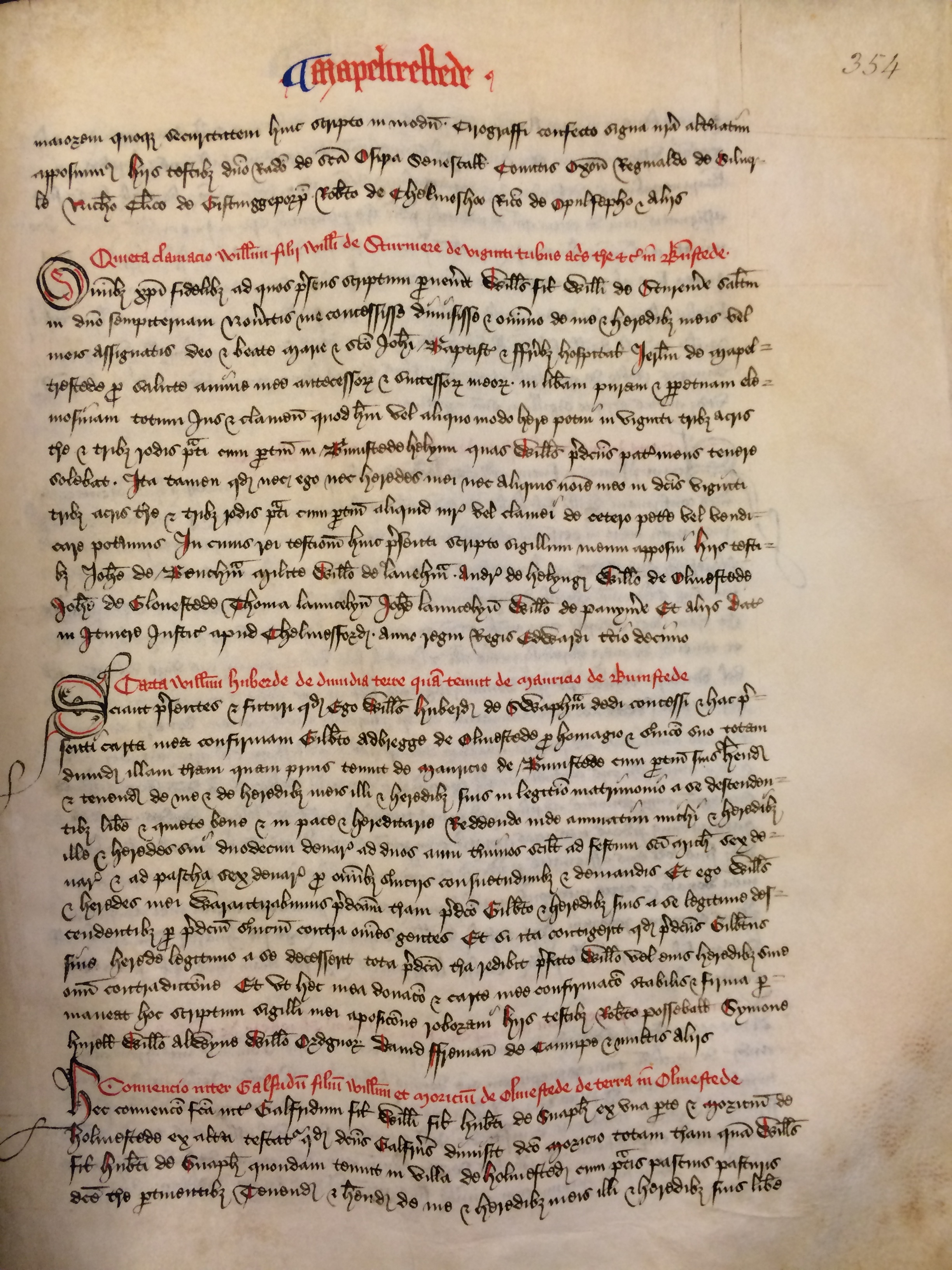 Omnibus Christi fidelibus ad quos presens scriptum pervenerit Willelmus filius Willelmi de Sturemerename salutem in Domino sempiternam Noveritis me concessisse dimisisse et omnino de me et heredibus meis vel meis assignatis [quietum clamasse] Deo et beate Marie et sancto Iohanni Baptiste et fratribus hospitalis Ierusalem de Mapeltrestedename pro salute anime mee antecessorum et successorum meorum in liberam puram et perpetuam elemosinam totum ius et clameum quod habui vel aliquo modo habere potui in viginti tribus acris terre et tribus rodis prati cum pertinentiis in Bumstede Helyun quas Willelmus predictus pater meusname tenere solebat ita tamen quod nec ego nec heredes mei nec aliquis nomine meo in dictis viginti tribus acris terre et tribus rodis prati cum pertinentiis aliquid iuris vel clamei de cetero petere vel vendicare poterimus In cuius rei testimonium huic presenti scripto sigillum meum apposui Hiis testibus Iohanne de Beucham militename Willelmo de Lavehamname Andrea de Helyngname Willelmo de Olmestedename Iohanne de Glouestedename Thoma Launcelynname Iohanne Launcelynname Willelmo de Panymerename et aliis Datum in itinere iustic[iariorum] apud Chelmesford anno regni regis Edwardi tercio decimo