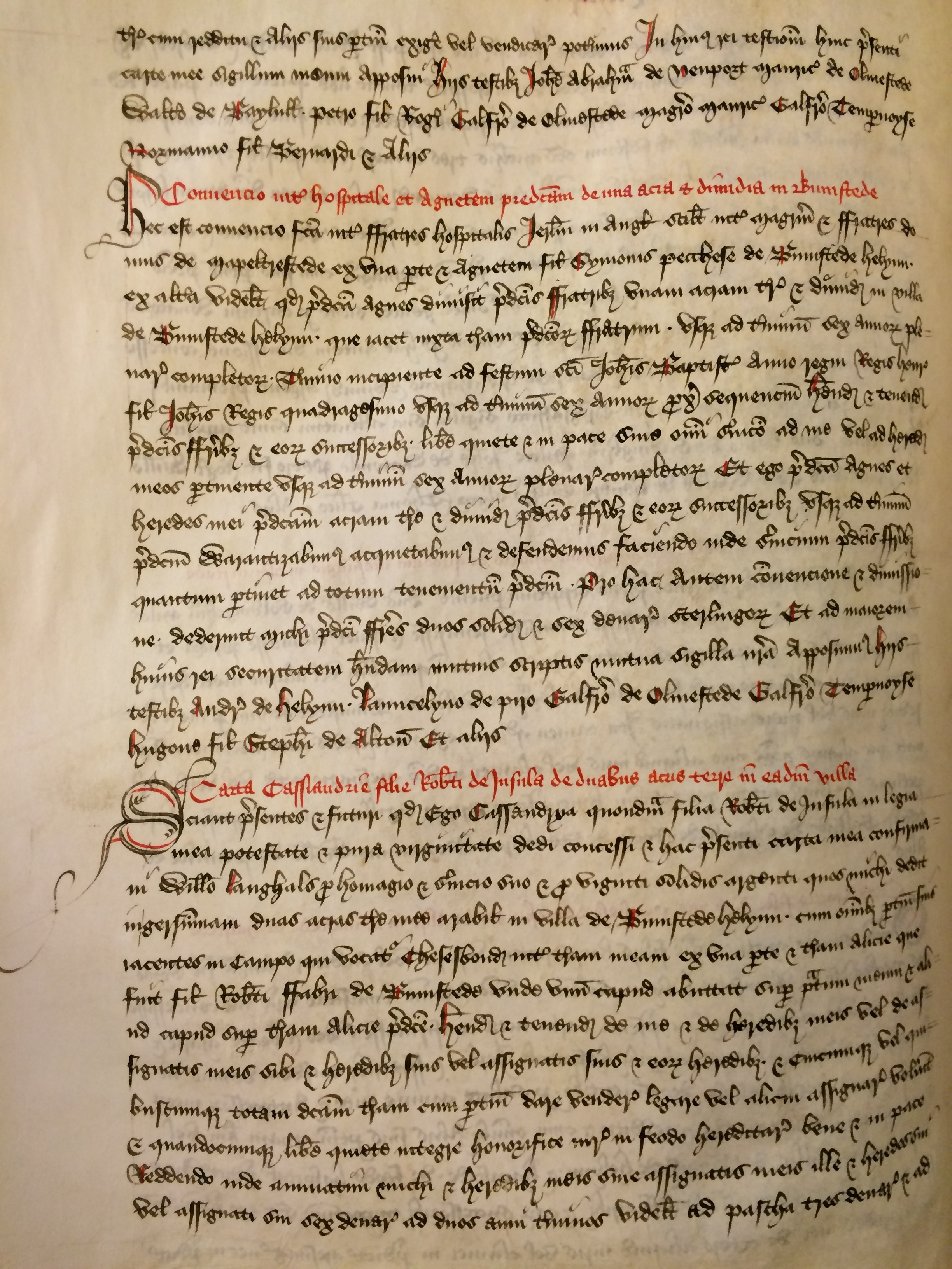 Sciant presentes et futuri quod ego Cassandrya quondam filia Roberti de Insula in legia mea potestate et pura virginitate dedi concessi et hac presenti carta mea confirmavi Willelmo Langhals pro homagio et servicio suo et pro viginti solidis argenti quos michi dedit in gersummam duas acras terre mee arabilis in villa de Bumstede Helyun cum omnibus pertinentiis suis iacentes in campo qui vocatur Chesesbond[] inter terram meam ex una parte et terram Alicie que fuit filia Roberti fabri de Bumstede [ex altera] unde unum capud abuttat super pratum meum et aliud capud super terram Alicie predicte habendas et tenendas de me et de heredibus meis vel de assignatis meis sibi et heredibus suis vel assignatis suis et eorum heredibus et cuicumque vel quibuscumque totam dictam terram cum pertinentiis dare vendere legare vel alicui assignare voluerit et quandocumque libere quiete integre honorifice iure in feodo hereditarie bene et in pace reddendo inde annuatim michi et heredibus meis sive assignatis meis ille et heredes sui vel assignati sui sex denarios ad duos anni terminos videlicet ad Pascha tres denarios et ad festum sancti Michaelis tres denarios pro omnibus serviciis consuetudinibus exaccionibus auxiliis sectis curie et secularibus demandis Et ego predicta Caussandria et heredes mei sive assignati mei warantizabimus defendemus et acquietabimus totam dictam terram cum pertinentiis predicto Willelmo et heredibus suis sive assignatis suis et eorum heredibus per predictum servicium sicut prenominatum est contra omnes homines et feminas imperpetuum In cuius rei testimonium presenti carte sigillum meum apposui Hiis testibus Rogero de Bayloll[] Petro et Mauricio filiis Rogeri Petro de Reyndun[]e Roberto de Heliun Launcelino de Pyro Rogero de Pyro Michaele clerico et aliis