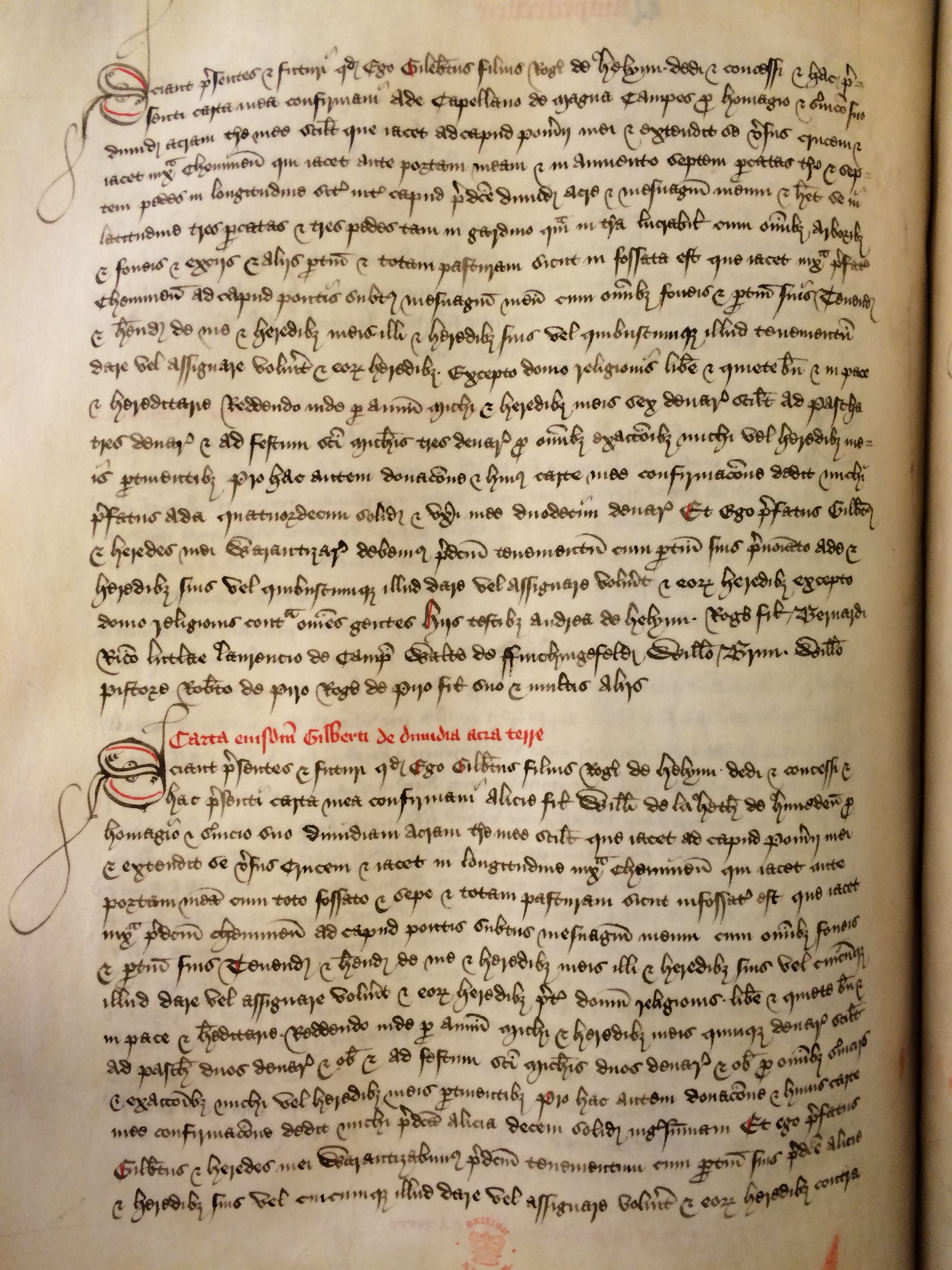 Sciant presentes et futuri quod ego Gilbertus filius Rogeri de Helyun dedi et concessi et hac presenti carta mea confirmavi Ade capellano de magna Campes pro homagio et servicio suo dimidiam acram terre mee scilicet que iacet ad capud pomerii mei et extendit se versus crucem et iacet iuxta chemineum qui iacet ante portam meam et in aumento septem percatas terre et septem pedes in longitudine sitos inter capud predicte dimidie acre et mesuagium meum et habet se in latitudine tres percatas et tres pedes tam in gardino quam in terra lucrabili cum omnibus arboribus et foveis et exsitis et aliis pertinentiis et totam pasturam sicut in fossata est que iacet iuxta prefatum chemineum ad capud pontis subtus mesuagium meum cum omnibus foveis et pertinentiis suis tenendum et habendum de me et heredibus meis illi et heredibus suis vel quibuscumque illud tenementum dare vel assignare voluerit et eorum heredibus excepto domo religionis libere et quiete bene et in pace et hereditarie reddendo inde per annum michi et heredibus meis sex denarios scilicet ad Pascha tres denarios et ad festum sancti Michaelis tres denarios pro omnibus exaccionibus michi vel heredibus meis pertinentibus Pro hac autem donacione et huius carte mee confirmacione dedit michi prefatus Ada quatuordecim solidos et uxori mee duodecim denarios Et ego prefatus Gilbertus et heredes mei warantizare debemus predictum tenementum cum pertinentiis suis prenominato Ade et heredibus suis vel quibuscumque illud dare vel assignare voluerit et eorum heredibus excepto domo religionis contra omnes gentes Hiis testibus Andrea de Helyun Rogero filio Bernardi Ricardo Lutlae Laurencio de Camp[es] Waltero de Finchingefeld[] Willelmo Brun Willelmo pistore Roberto de Piro Rogero de Piro filio suo et multis aliis