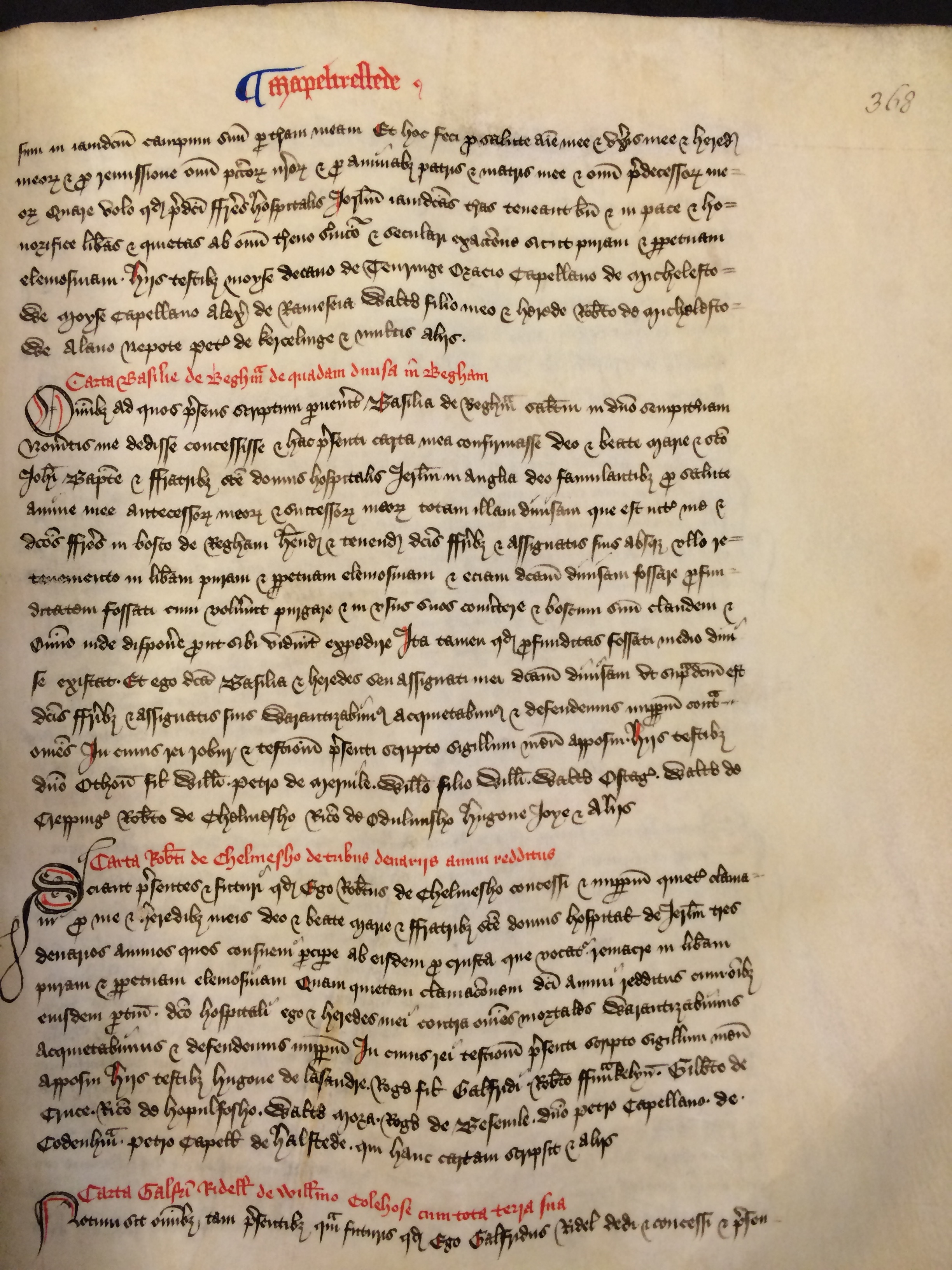 Omnibus ad quos presens scriptum pervenerit Basilia de Begham salutem in Domino sempiternam Noveritis me dedisse concessisse et hac presenti carta mea confirmasse Deo et beate Marie et sancto Iohanni Baptiste et fratribus sancte domus hospitalis Ierusalem in Anglia Deo famulantibus pro salute anime mee antecessorum meorum et successorum meorum totam illam divisam que est inter me et dictos fratres in bosco de Begham habendam et tenendam dictis fratribus et assignatis suis absque ullo retenemento in liberam puram et perpetuam elemosinam et eciam dictam divisam fossare profunditatem fossati cum voluerint purgare et in usus suos convertere et boscum suum claudem et omnino inde disponere prout sibi viderint expedire ita tamen quod profunditas fossati medio divise existat Et ego dicta Basilia et heredes seu assignati mei dictam divisam ut supradictum est dictis fratribus et assignatis suis warantizabimus acquietabimus et defendemus imperpetuum contra omnes In cuius rei robur et testimonium presenti scripto sigillum meum apposui Hiis testibus domino Othone filio Willelmi Petro de Mervile Willelmo filio Willelmi Waltero Ostag[io] Waltero de Crepping[] Roberto de Chelmesho Ricardo de Odulvusho Hugone Ioye et aliis