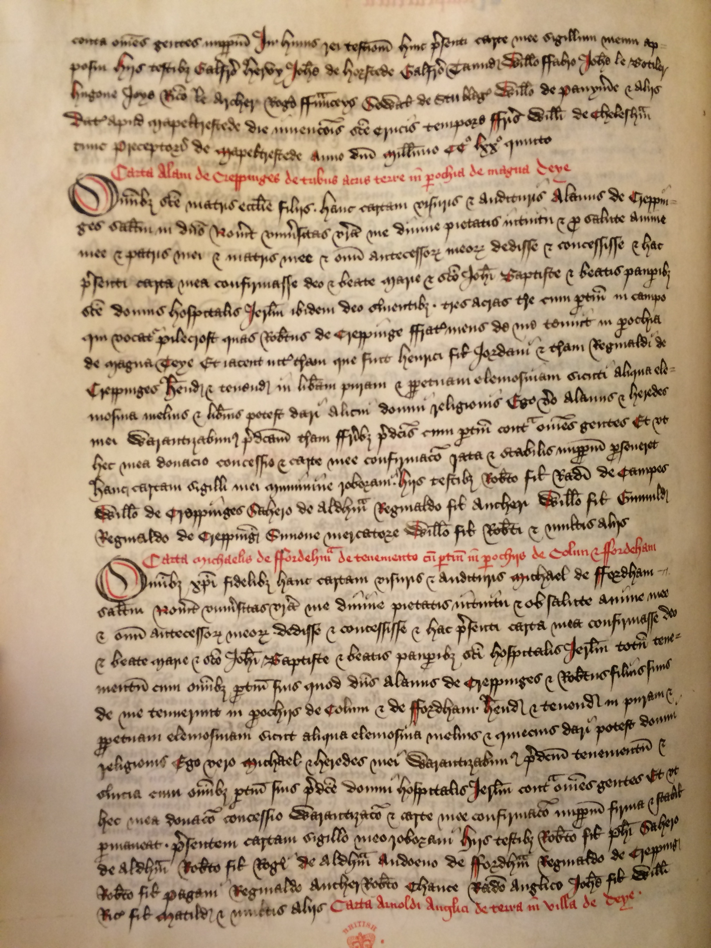 Omnibus sancte matris ecclesie filiis hanc cartam visuris et audituris Alanus de Creppinges salutem in Domino Noverit universitas vestra me divine pietatis intuitu et pro salute anime mee et patris mei et matris mee et omnium antecessorum meorum dedisse et concessisse et hac presenti carta mea confirmasse Deo et beate Marie et sancto Iohanni Baptiste et beatis pauperibus sancte domus hospitalis Ierusalem ibidem Deo servientibus tres acras terre cum pertinentiis in campo qui vocatur Pilecroft quas Robertus de Creppinge frater meus de me tenuit in parochia de magna Teye et iacent inter terram que fuit Henrici filii Iordani et terram Reginaldi de Creppinges habendas et tenendas in liberam puram et perpetuam elemosinam sicuti aliqua elemosina melius et liberius potest dari alicui domui religionis Ego vero Alanus et heredes mei warantizabimus predictam terram fratribus predictis cum pertinentiis contra omnes gentes Et ut hec mea donacio concessio et carte mee confirmacio rata et stabilis imperpetuum perseveret hanc cartam sigilli mei munimine roboravi Hiis testibus Roberto filio Radulphi de Campes Willelmo de Creppinges Sahero de Aldham Reginaldo filio Aucheri Willelmo filio Gunnilde Reginaldo de Crepping[es] Simone mercatore Willelmo filio Roberti et multis aliis
