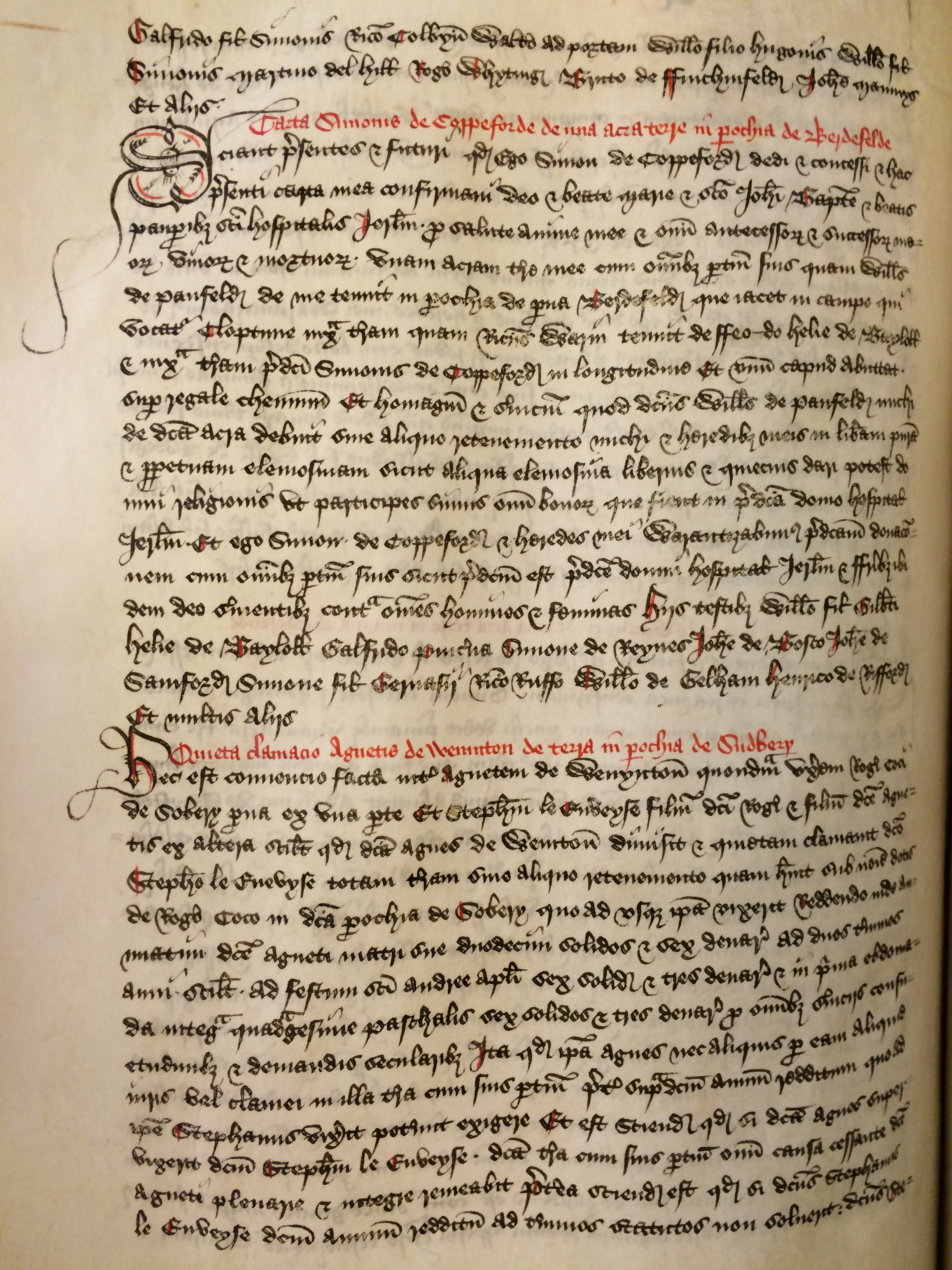 Sciant presentes et futuri quod ego Simon de Coppeford[] dedi et concessi et hac presenti carta mea confirmavi Deo et beate Marie et sancto Iohanni Baptiste et beatis pauperibus sancti hospitalis Ierusalem pro salute anime mee et omnium antecessorum et successorum meorum vivorum et mortuorum unam acram terre mee cum omnibus pertinentiis suis quam Willelmus de Panfeld[] de me tenuit in parochia de parva Berdefeld[] que iacet in campo qui vocatur Cloptune iuxta terram quam Ricardus Warin tenuit de feodo Helie de Bayloll[] et iuxta terram predicti Simonis de Coppeford[] in longitudine et unum capud abuttat super regale cheminum et homagium et servicium quod dictus Willelmus de Panfeld[] michi de dicta acra debuit sine aliquo retenemento michi et heredibus meis in liberam puram et perpetuam elemosinam sicut aliqua elemosina liberius et quiecius dari potest domui religionis ut participes simus omnium bonorum que fient in predicta domo hospitalis Ierusalem Et ego Simon de Coppeford[] et heredes mei warantizabimus predictam donacionem cum omnibus pertinentiis suis sicut predictum est predicte domui hospitalis Ierusalem et fratribus ibidem Deo servientibus contra omnes homines et feminas Hiis testibus Willelmo filio Gilberti Helie de Bayloll[] Galfrido pincerna Simone de Reynes Iohanne de Bosco Iohanne de Samford[] Simone filio Gervasii Ricardo Ruffo Willelmo de Gelham Henrico de Rifford[] et multis aliis