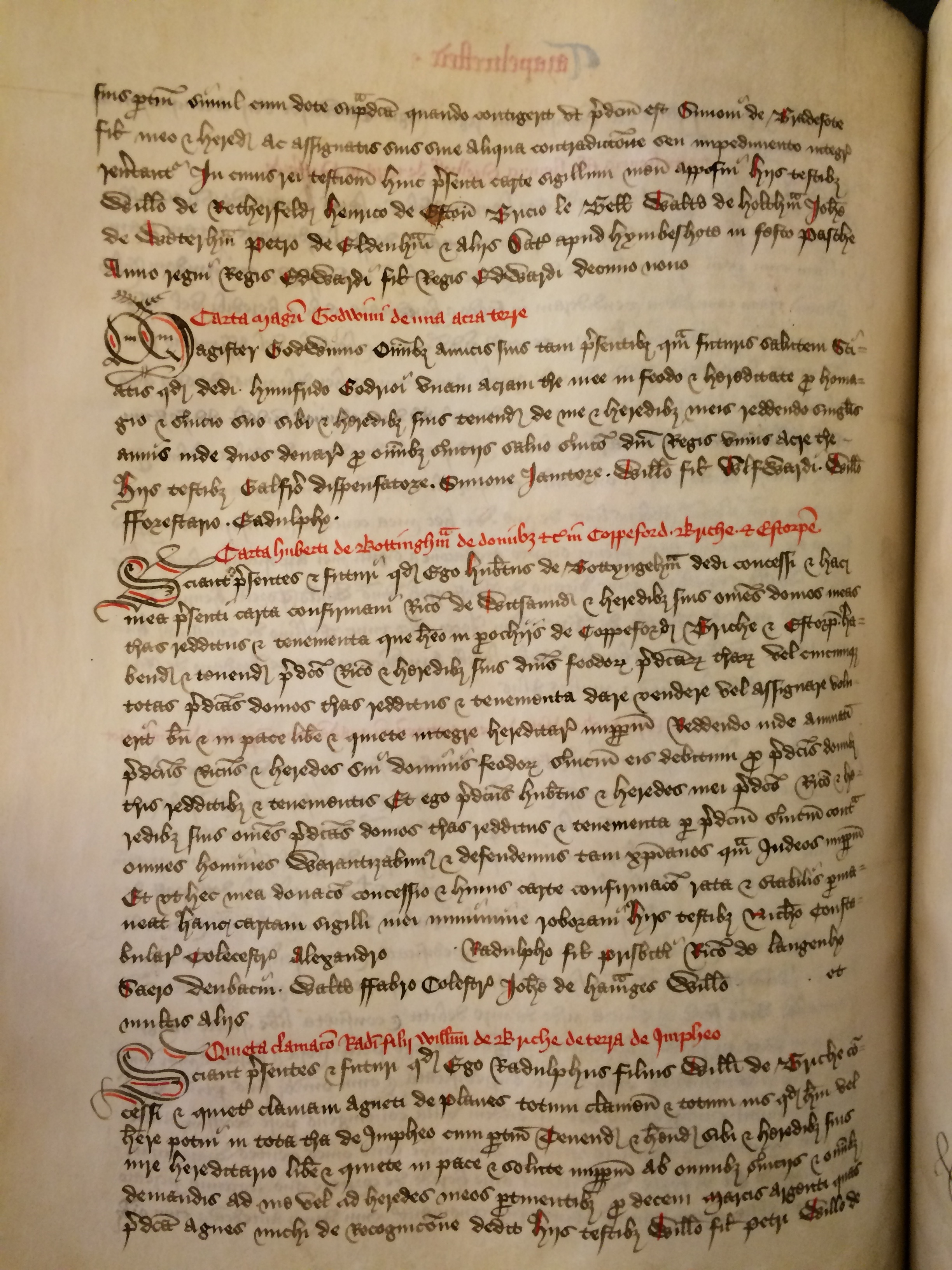 Magister Godwinus omnibus amicis suis tam presentibus quam futuris salutem Sciatis quod dedi Humfrido Godrici unam acram terre mee in feodo et hereditate pro homagio et servicio suo sibi et heredibus suis tenendam de me et heredibus meis reddendo singulis annis inde duos denarios pro omnibus serviciis salvo servicio domini regis unius acre terre Hiis testibus Galfrido dispensatore Simone ianitore Willelmo filio Wlfwardi Willelmo forestario Eadulpho