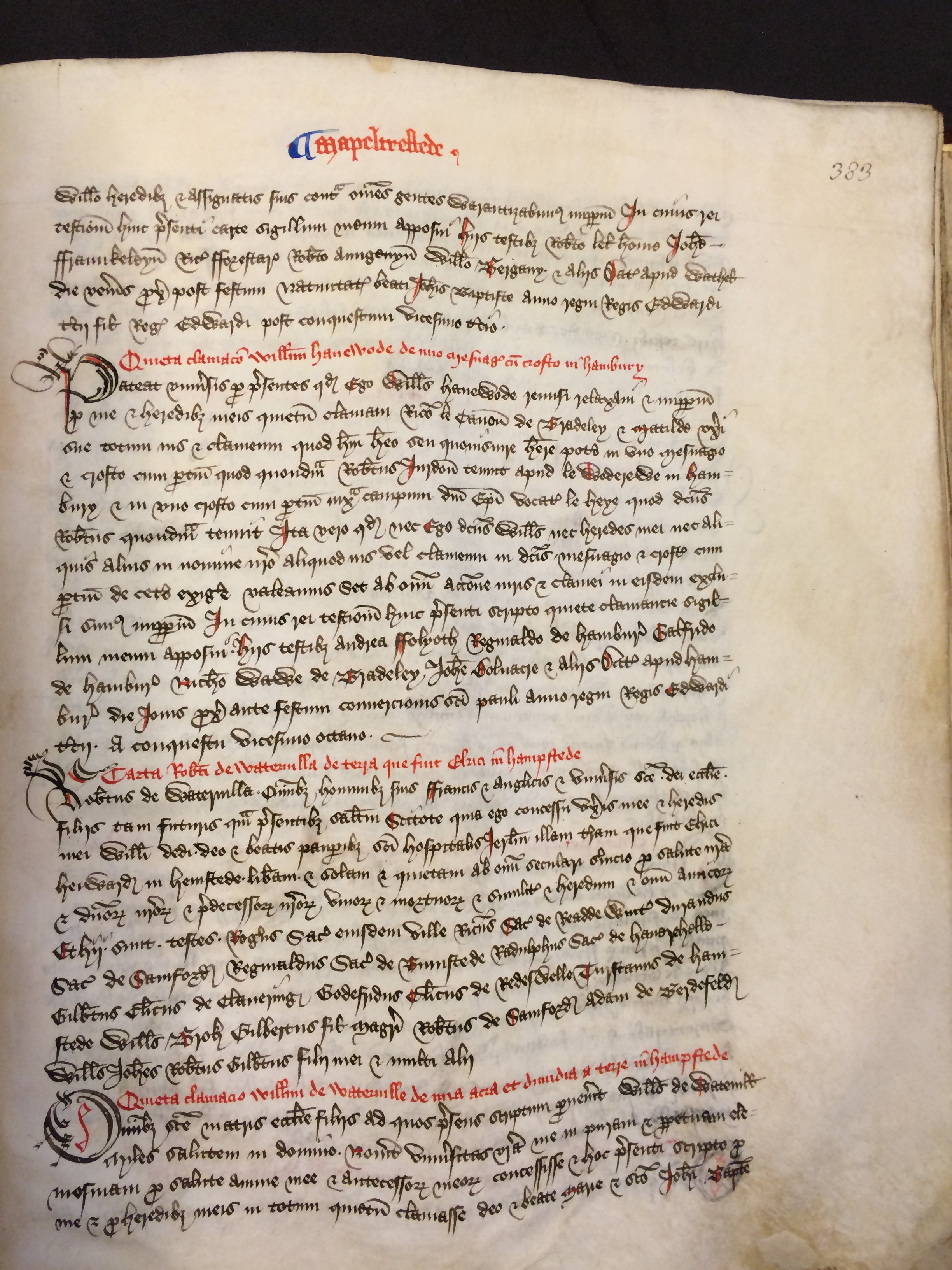 Pateat universis per presentes quod ego Willelmus Hauewodename remisi relaxavi et imperpetuum pro me et heredibus meis quietum clamavi Ricardo le canon[] de Bradeleyname et Matilde uxoriname sue totum ius et clameum quod habui habeo seu quovis iure habere potero in uno mesuagio et crofto cum pertinentiis quod quondam Robertus Iurdonname[] tenuit apud le Woderewe in Hambury et in uno crofto cum pertinentiis iuxta campum domini episcopi vocatum le Heye quod dictus Robertusname quondam tenuit ita vero quod nec ego dictus Willelmusname nec heredes mei nec aliquis alius in nomine nostro aliquod ius vel clameum in dictis mesuagio et crofto cum pertinentiis de cetero exigere valeamus set ab omni actione iuris et clamei in eisdem exclusi simus imperpetuum In cuius rei testimonium huic presenti scripto quiete clamancie sigillum meum apposui Hiis testibus Andrea Folyothname Reginaldo de Hamburyname Galfrido de Hamburyname Nicholao Wawe de Bradeleyname Iohanne Bolnacrename et aliis Datum apud Hambury die Iovis proxima ante festum convercionis sancti Pauli anno regni regis Edwardi tercii a conquestu vicesimo octavo