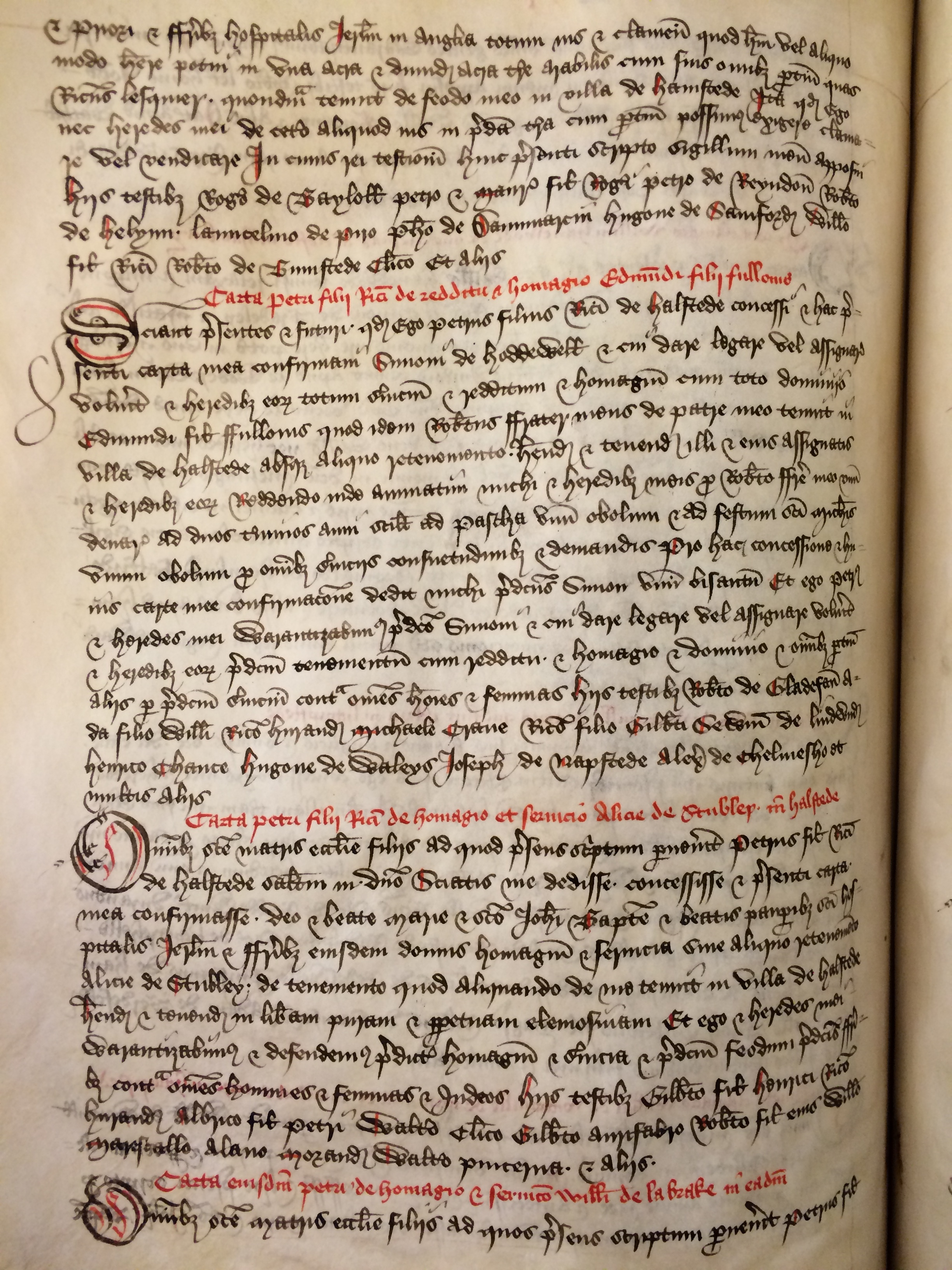 Omnibus sancte matris ecclesie filiis ad quos presens scriptum pervenerit Petrus filius Ricardi de Halstede salutem in Domino Sciatis me dedisse concessisse et presenti carta mea confirmasse Deo et beate Marie et sancto Iohanni Baptiste et beatis pauperibus sancti hospitalis Ierusalem et fratribus eiusdem domus homagium et servicia sine aliquo retenemento Willelmi de la Brake de tenemento quod aliquando de me tenuit in villa de Halstede habenda et tenenda in liberam puram et perpetuam elemosinam Et ego et heredes mei warantizabimus et defendemus predictum homagium et servicia et predictum feodum predictis fratribus contra omnes homines et feminas et Iudeos Hiis testibus Gilberto filio Henrici Ricardo Hurand[] Albrico filio Petri Waltero clerico Gilberto aurifabro Roberto filio eius Roberto marescallo Alano Morand[] Waltero pincerna et aliis