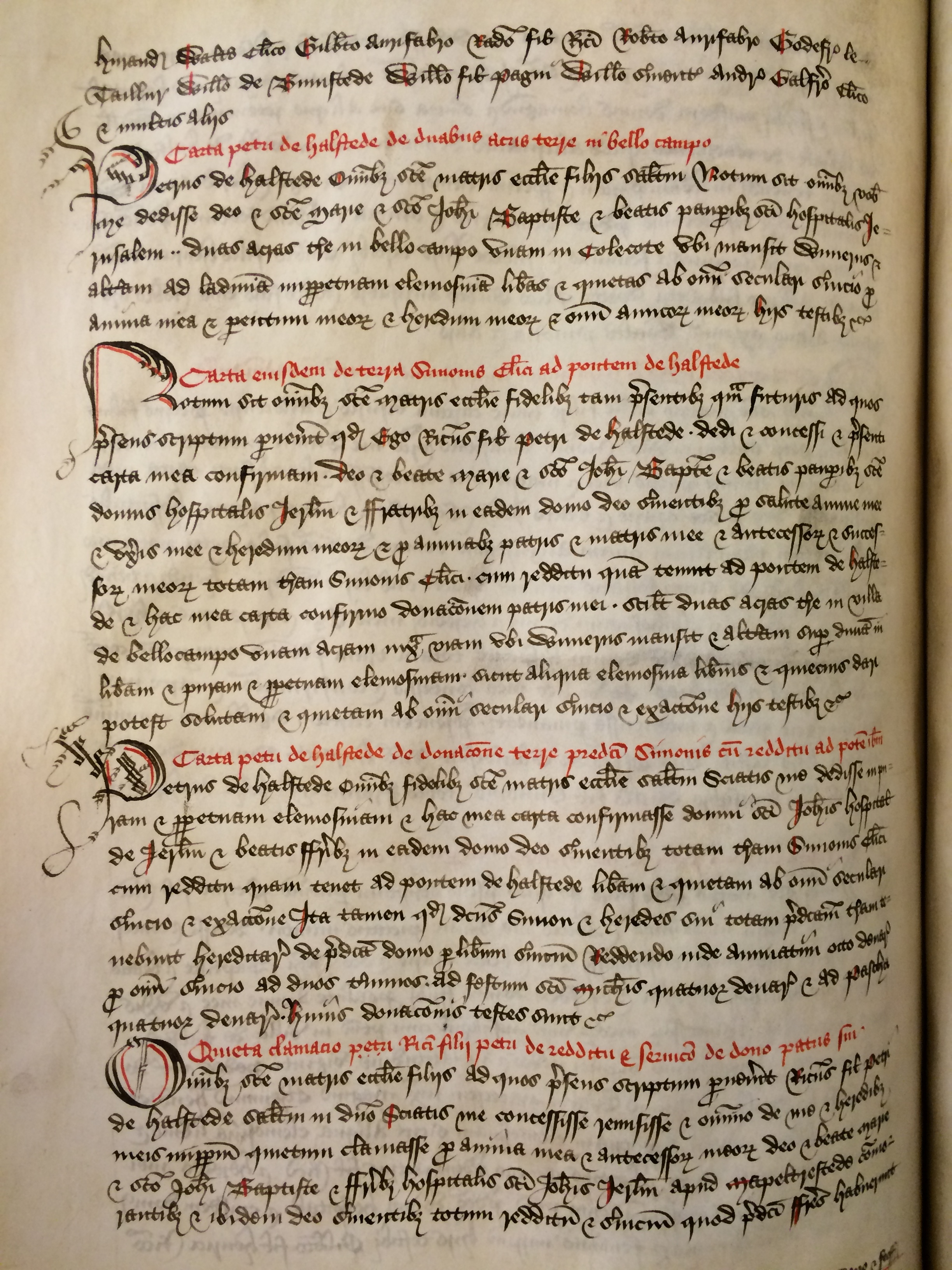 Omnibus sancte matris ecclesie filiis ad quos presens scriptum pervenerit Ricardus filius Petri de Halstedename salutem in Domino Sciatis me concessisse remisisse et omnino de me et heredibus meis imperpetuum quietum clamasse pro anima mea et antecessorum meorum Deo et beate Marie et sancto Iohanni Baptiste et fratribusname hospitalis sancti Iohannis Ierusalemname apud Mapeltrestede commorantibus et ibidem Deo servientibus totum redditum et servicium quod predicti fratresname habuerunt ex dono et feoffamento Petri filii Ricardi patrisname mei de tenementis que Henricus fabername Willelmus Hurauntname Iohannes le sleytername Edmundus le fullername Willelmus aurifabername Simon le fullername et Robertus le deyername Everwinus le tannerename Rogerus Waggestafname[] Willelmus atte Solername Willelmus wardename Gilbertusname Cotebat de nobis tenuerunt in villa de Halstede et eciam piscariam eisdem fratribusname per tres vices per annum in ripario meo in villa predicta habendum et tenendum predictum redditum de predictis tenentibus una cum wardis homagiis releviis herietis escaetis scutagiis et omnibus aliis commoditatibus de predictis tenentibus et eorundem heredum et assignatorum omnino provenientibus et eciam sectis curiarum eorundem tenencium in puram et perpetuam elemosinam adeo liberius sicut aliqua elemosina libere potest concedi vel quieta clamari ita tamen quod nec ego dictus Ricardus filius Petriname nec heredes mei vel assignati nec aliquis nomine nostro aliquid iuris in predicto redditu wardis releviis escaetis homagiis herietis scutagiis maritagiis sectis curiarum piscariis de cetero exigere vel vendicare poterimus imperpetuum In cuius rei testimonium presenti scripto sigillum meum apposui Hiis testibus Roberto de Glaudefenname Rogero Cramavilename Ricardo filio Gilbertiname Willelmo filio Andreename Andrea filioname suo Alexandro fratrename suo Ricardo Hurauntname Ricardo filio Andreename Willelmo marescalloname Albrico filio Petriname Waltero clerico Ioseph de Napstede et multis aliis