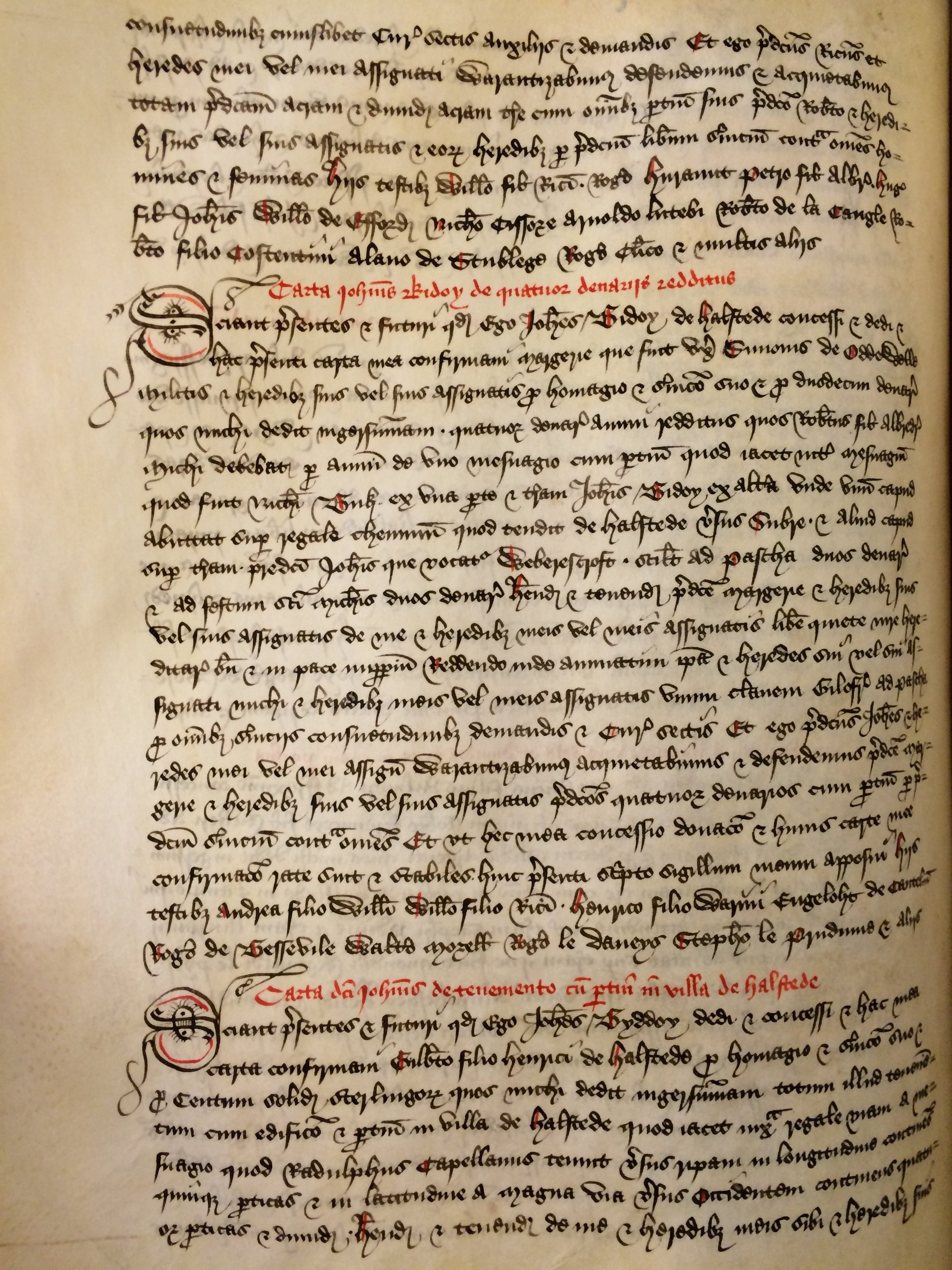 Sciant presentes et futuri quod ego Iohannes Bidoy de Halstede concessi et dedi et hac presenti carta mea confirmavi Margerie que fuit uxor Simonis de Oddewelle militis et heredibus suis vel suis assignatis pro homagio et servicio suo et pro duodecim denariis quos michi dedit in gersummam quatuor denarios annui redditus quos Robertus filius Albredr[] michi debebat per annum de uno mesuagio cum pertinentiis quod iacet inter mesuagium quod fuit Nicholai Buk ex una parte et terram Iohannis Bidoy ex altera unde unum capud abuttat super regale cheminum quod tendit de Halstede versus Subre et aliud capud super terram predicti Iohannis que vocatur Weberescroft scilicet ad Pascha duos denarios et ad festum sancti Michaelis duos denarios habendos et tenendos predicte Margerie et heredibus suis vel suis assignatis de me et heredibus meis vel meis assignatis libere quiete iure hereditarie bene et in pace imperpetuum reddendo inde annuatim ipsa et heredes sui vel sui assignati michi et heredibus meis vel meis assignatis unum clavem gilofre ad Pascha pro omnibus serviciis consuetudinibus demandis et curiarum sectis Et ego predictus Iohannes et heredes mei vel mei assignati warantizabimus acquietabimus et defendemus predicte Margerie et heredibus suis vel suis assignatis predictos quatuor denarios cum pertinentiis per predictum servicium contra omnes Et ut hec mea concessio donacio et huius carte mee confirmacio rate sint et stabiles huic presenti scripto sigillum meum apposui Hiis testibus Andrea filio Willelmi Willelmo filio Ricardi Henrico filio Warini Engeloht de Canteliu[] Rogero de Bessevile Waltero Morell[] Rogero le Daneys Stephano le Prudume et aliis