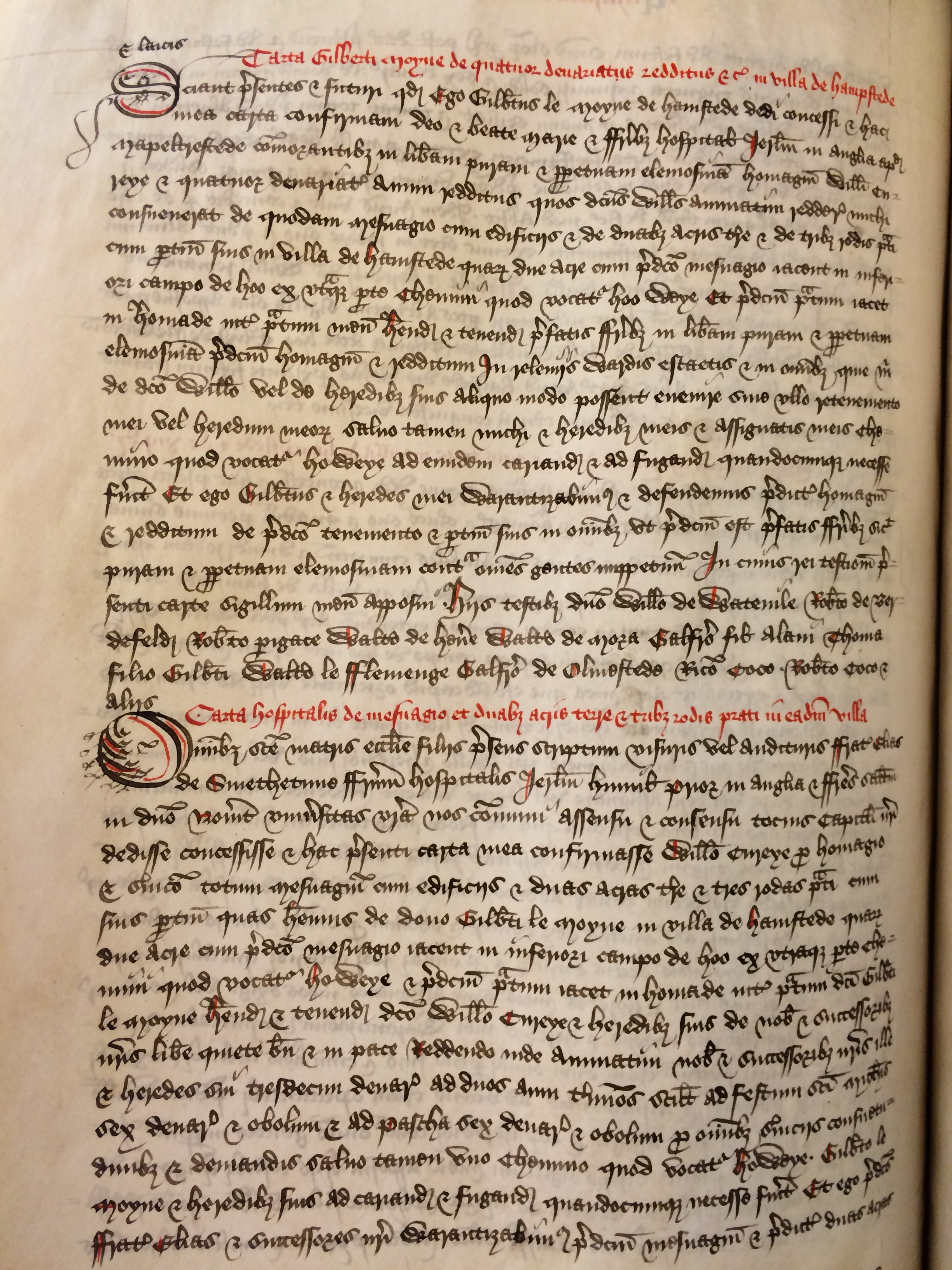 Omnibus sancte matris ecclesie filiis presens scriptum visuris vel audituris frater Elias de Smethetune fratrum hospitalis Ierusalem humilis prior in Anglia et fratres salutem in Domino Noverit universitas vestra nos communi assensu et consensu tocius capituli nostri dedisse concessisse et hac presenti carta mea confirmasse Willelmo Cureye pro homagio et servicio [suo] totum mesuagium cum edificiis et duas acras terre et tres rodas prati cum suis pertinentiis quas habemus de dono Gilberti le moyne in villa de Hamstede quarum due acre cum predicto mesuagio iacent in inferiori campo de Hoo ex utraque parte chemini quod vocatur Howeye et predictum pratum iacet in Homade inter pratum dicti Gilberti le moyne habenda et tenenda dicto Willelmo Cureye et heredibus suis de nobis et successoribus nostris libere quiete bene et in pace reddendo inde annuatim nobis et successoribus nostris ille et heredes sui tresdecim denarios ad duos anni terminos scilicet ad festum sancti Michaelis sex denarios et obolum et ad Pascha sex denarios et obolum pro omnibus serviciis consuetudinibus et demandis salvo tamen uno chemino quod vocatur Howeye Gilberto le moyne et heredibus suis ad cariandum et fugandum quandocumque necesse fuerit Et ego predictus frater Elias et successores nostri warantizabimus predictum mesuagium et predictas duas acras terre et tres rodas prati cum suis pertinentiis predicto Willelmo et heredibus suis quamdiu per cartam dicti Gilberti le moyne donatoris nostri ipsam warantizare poterimus ita tamen quod in obitu dicti Willelmi Cureye et heredum suorum tota tercia pars catallorum suorum in feodo nostro inventa soluta et quieta domui nostre remanebit In cuius rei testimonium huic scripto in modum cirographi facto sigillum nostrum apposuimus Hiis testibus frater Theobaldo de Marius fratre Willelmo de Erdlington[] fratre Willelmo de Esseby fratre Roberto de Heccham fratre Willelmo Picot fratre Willelmo de Sywoldby et aliis