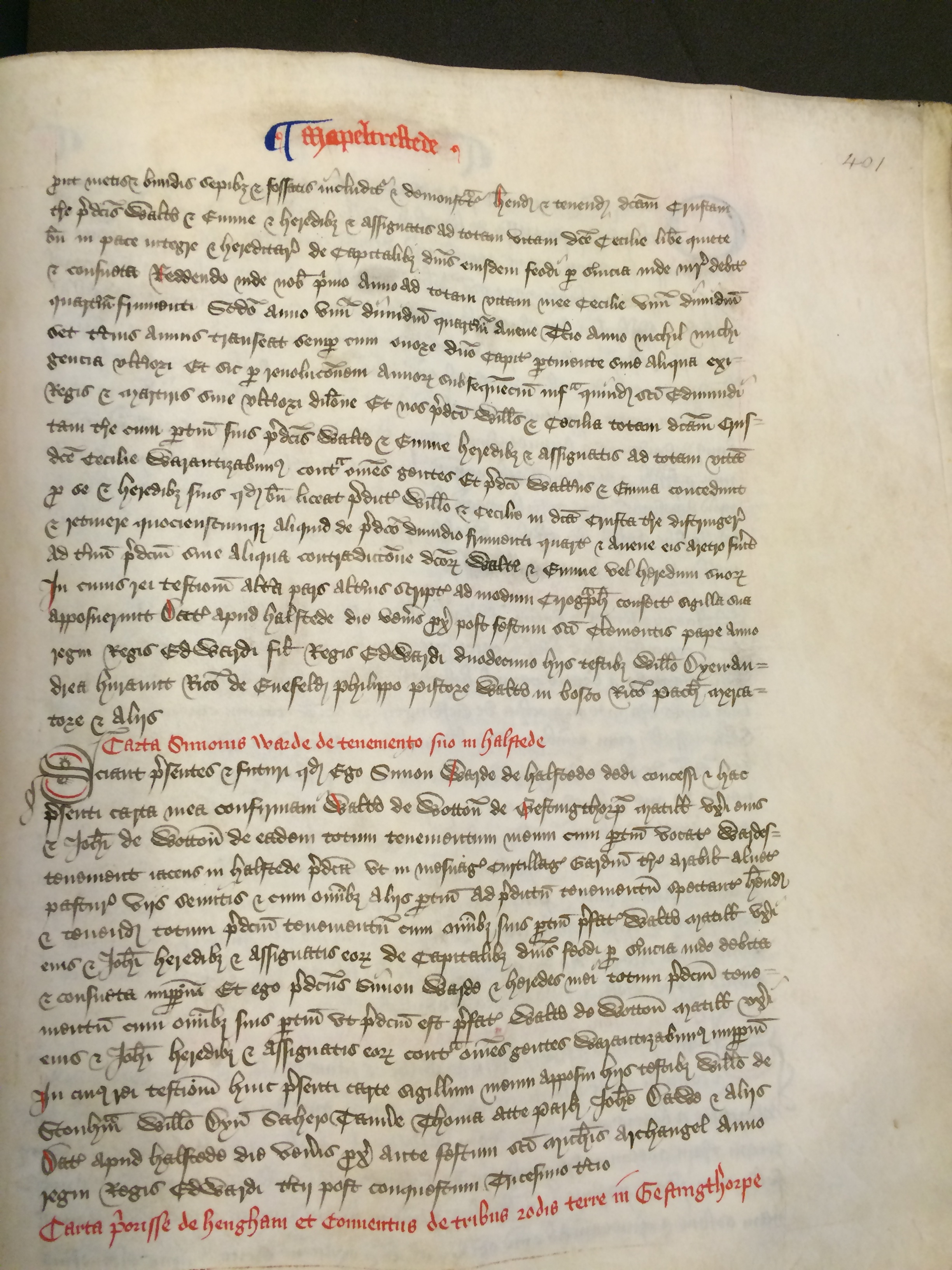 Sciant presentes et futuri quod ego Simon warde de Halstede dedi concessi et hac presenti carta mea confirmavi Waltero de Wotton de Gestingthorpe Matillde uxori eius et Iohanni de Wotton de eadem totum tenementum meum cum pertinentiis vocatum Wardestenement iacens in Halstede predicta ut in mesuagiis curtilagiis gardinis terris arabilibus alnetis pasturis viis semitis et cum omnibus aliis pertinentiis ad predictum tenementum spectantibus habend et tenend totum predictum tenementum cum omnibus suis pertinentiis prefatis Waltero Matillde uxori eius et Iohanni heredibus et assignatis eorum de capitalibus dominis feodi per servicia inde debita et consueta imperpetuum Et ego predictus Simon warde et heredes mei totum predictum tenementum cum omnibus suis pertinentiis ut predictum est prefatis Waltero de Wotton Matillde uxori eius et Iohanni heredibus et assignatis eorum contra omnes gentes warantizabimus imperpetuum In cuius rei testimonium huic presenti carte sigillum meum apposui Hiis testibus Willelmo de Stonham Willelmo Dyn Sahero tannatore Thoma atte Park Iohanne Dawe et aliis Datum apud Halstede die veneris proxima ante festum sancti Michaelis archangel anno regni regis Edwardi tercii post conquestum tricesimo tercio
