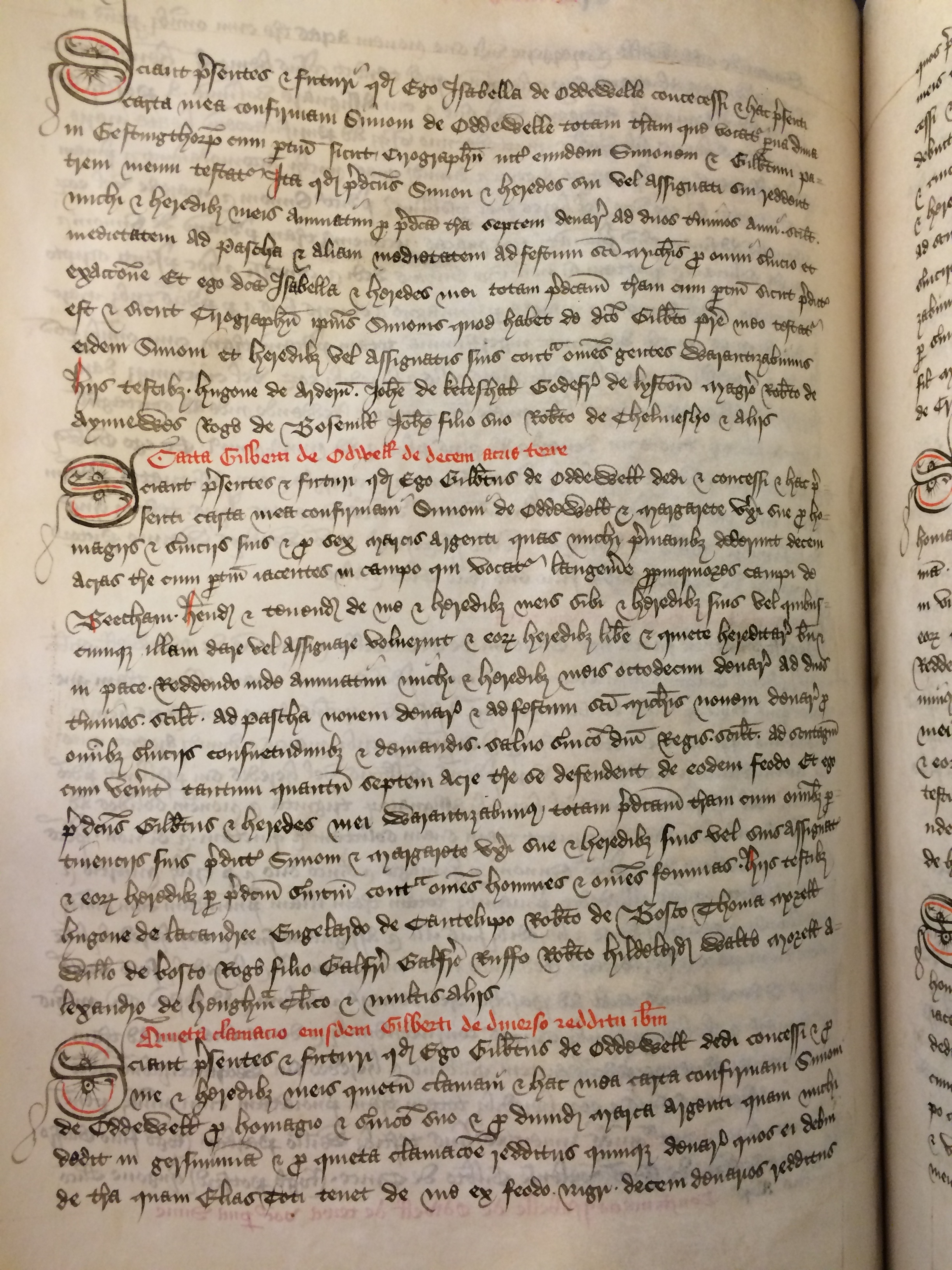 Sciant presentes et futuri quod ego Gilbertus de Oddewell[] dedi et concessi et hac presenti carta mea confirmavi Simoni de Oddewell[] et Margarete uxori sue pro homagiis et serviciis suis et pro sex marcis argenti quas michi premanibus dederunt decem acras terre cum pertinentiis iacentes in campo qui vocatur Langemere propinquiores campi de Beecham habendas et tenendas de me et heredibus meis sibi et heredibus suis vel quibuscumque illam dare vel assignare voluerint et eorum heredibus libere et quiete hereditarie bene et in pace reddendo inde annuatim michi et heredibus meis octodecim denarios ad duos terminos scilicet ad Pascha novem denarios et ad festum sancti Michaelis novem denarios pro omnibus serviciis consuetudinibus et demandis salvo servicio domini regis scilicet ad scutagium cum venerit tantum quantum septem acre terre se defendent de eodem feodo Et ego predictus Gilbertus et heredes mei warantizabimus totam predictam terram cum omnibus pertinentiis suis predicto Simoni et Margarete uxori sue et heredibus suis vel suis assignatis et eorum heredibus per predictum servicium contra omnes homines et omnes feminas Hiis testibus Hugone de Lacandree Engelardo de Cantelupo Roberto de Bosco Thoma Morell[] Willelmo de Bosco Rogero filio Galfridi Galfrido Ruffo Roberto Hildelerd[] Waltero Morell[] Alexandro de Hengham clerico et multis aliis