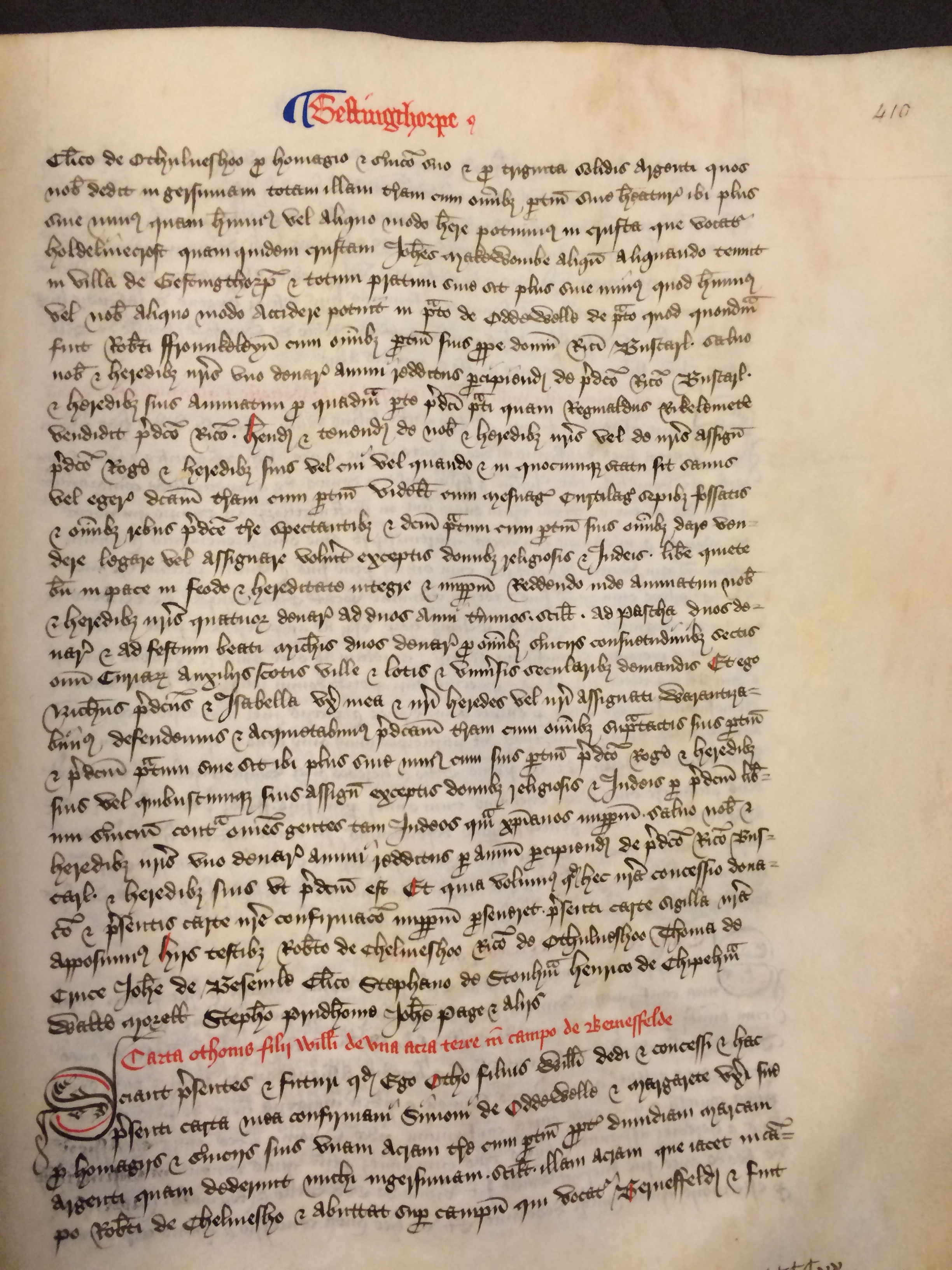 Sciant presentes et futuri quod ego Otho filius Willelmi dedi et concessi et hac presenti carta mea confirmavi Simoni de Oddewelle et Margarete uxori sue pro homagiis et serviciis suis unam acram terre cum pertinentiis propter dimidiam marcam argenti quam dederunt michi in gersumam scilicet illam acram que iacet in campo Roberti de Chelmesho et abuttat super campum qui vocatur Bernesfeld[] et fuit de feodo Reginaldi de Noreis habendam et tenendam de me et heredibus meis eis et heredibus eorum vel cuicumque dare vel assignare voluerint vel heredibus assignatorum per liberum servicium scilicet per unum denarium reddendum annuatim scilicet ad Pascha pro omnibus serviciis et demandis et consuetudinibus et querelis Et ego et heredes mei warantizabimus predicto Simoni et Margarete uxori sue et heredibus eorum vel heredibus assignatorum totam predictam terram cum pertinentiis contra omnes homines et feminas Hiis testibus Hugone de Lasandre Hugone de Cantilu Godefrido filio Iohannis Michaele Crawe Roberto de Sanford[] Willelmo de Blaveny Iohanne fratre eius Henrico Ruffo et multis aliis