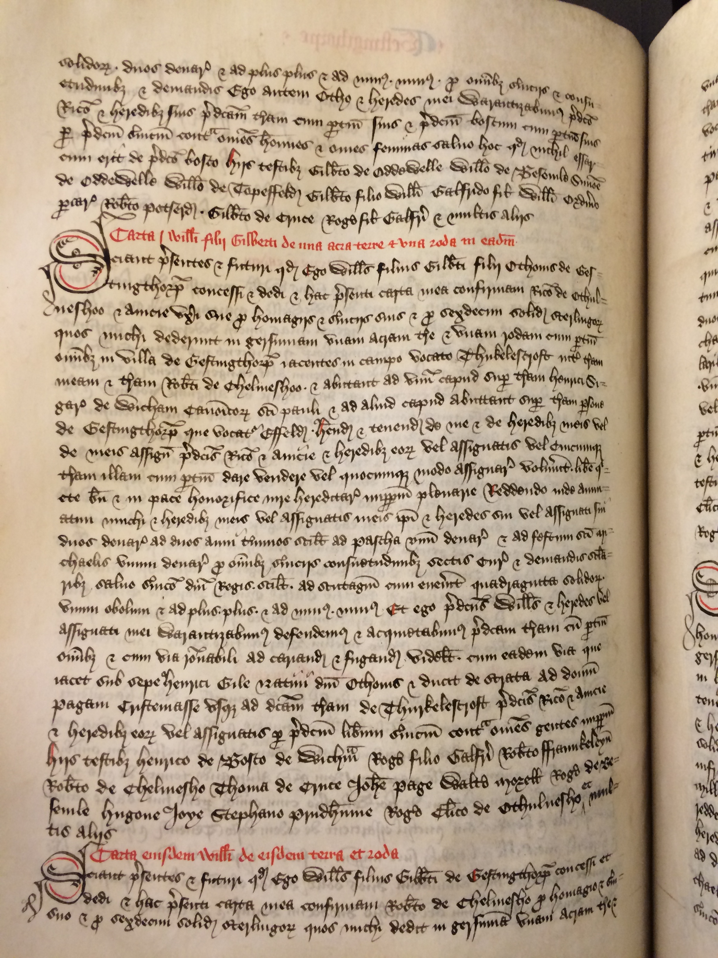 Sciant presentes et futuri quod ego Willelmus filius Gilberti filii Othonis de Gestingthorpename concessi et dedi et hac presenti carta mea confirmavi Ricardo de Othulveshooname et Avicie uxoriname sue pro homagiis et serviciis suis et pro sexdecim solidis sterlingorum quos michi dederunt in gersumam unam acram terre et unam rodam cum pertinentiis omnibus in villa de Gestingthorpe iacentes in campo vocato Thukelescroft inter terram meam et terram Roberti de Chelmeshooname et abbutant ad unum capud super terram Henrici Sigar[] de Wicham canonicorum sancti Pauliname et ad aliud capud abuttant super terram persone de Gestingthorpe que vocatur Esfeld[] habendas et tenendas de me et de heredibus meis vel de meis assignatis predictis Ricardoname et Aviciename et heredibus eorum vel assignatis vel cuicumque terram illam cum pertinentiis dare vendere vel quocumque modo assignare voluerint libere quiete bene et in pace honorifice iure hereditario imperpetuum plenarie reddendo inde annuatim michi et heredibus meis vel assignatis meis ipsi et heredes sui vel assignati sui duos denarios ad duos anni terminos scilicet ad Pascha unum denarium et ad festum sancti Michaelis unum denarium pro omnibus serviciis consuetudinibus sectis curiarum et demandis secularibus salvo servicio domini regis scilicet ad scutagium cum evenerit quadraginta solidorum unum obolum et ad plus plus et ad minus minus Et ego predictus Willelmusname et heredes vel assignati mei warantizabimus defendemus et acquietabimus predictam terram cum pertinentiis omnibus et cum via rationabili ad cariandum et fugandum videlicet cum eadem via que iacet sub sepe Henrici Gile nativi domini Othonisname et ducit de strata ad domum Pagani Cristemassename usque ad dictam terram de Thurkelescroft predictis Ricardoname et Aviciename et heredibus eorum vel assignatis per predictum liberum servicium contra omnes gentes imperpetuum Hiis testibus Henrico de Bosco de Wichamname Rogero filio Galfridiname Roberto fraunkeleynname[] Roberto de Chelmeshoname Thoma de Crucename Iohanne pagename Waltero Morellname[] Rogero de Besevilename Hugone Ioyename Stephano Prudhummename Rogero clerico de Othulveshoname et multis aliis