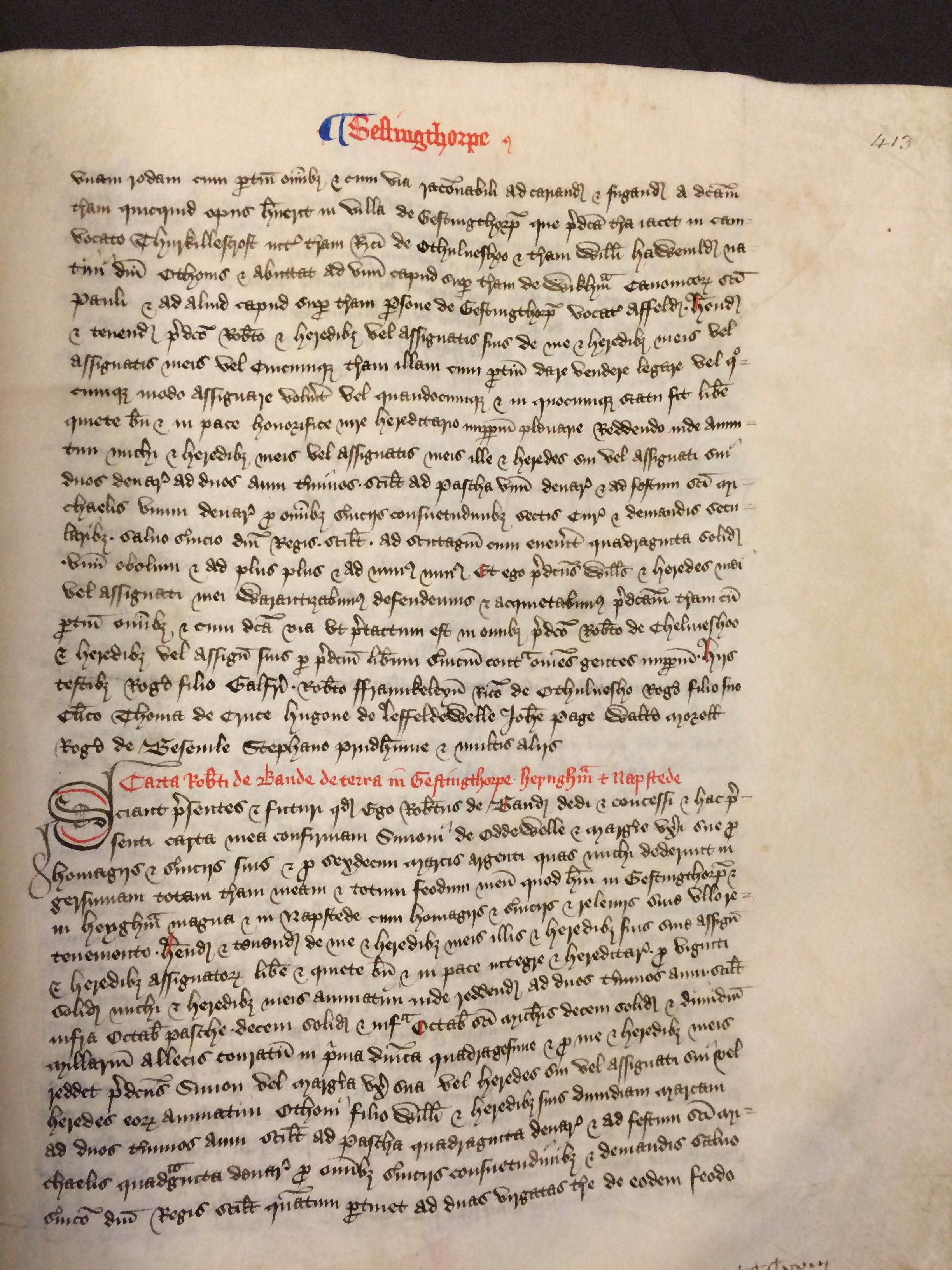 Sciant presentes et futuri quod ego Robertus le Baud[] dedi et concessi et hac presenti carta mea confirmavi Simoni de Oddewelle et Margerie uxori sue pro homagiis et serviciis suis et pro sexdecim marcis argenti quas michi dederunt in gersumam totam terram meam et totum feodum meum quod habui in Gestingthorpe et in Heygham magna et in Napstede cum homagiis et serviciis et releviis sine ullo retenemento habenda et tenenda de me et heredibus meis illis et heredibus suis sive assignatis et heredibus assignatorum libere et quiete bene et in pace integre et hereditarie pro viginti solidis michi et heredibus meis annuatim inde reddendis ad duos terminos anni scilicet infra octabas Pasche decem solidos et infra octabas sancti Michaelis decem solidos et dimidium millarium allecis conratum in prima dominica quadragesime et pro me et heredibus meis reddet predictus Simon vel Margeria uxor sua vel heredes sui vel assignati sui vel heredes eorum annuatim Othoni filio Willelmi et heredibus suis dimidiam marcam ad duos terminos anni scilicet ad Pascha quadraginta denarios et ad festum sancti Michaelis quadraginta denarios pro omnibus serviciis consuetudinibus et demandis salvo servicio domini regis scilicet quantum pertinet ad duas virgatas terre de eodem feodo in eadem villa Et ego Robertus le Baud[] et heredes mei warantizabimus predictis Simoni et Margerie uxori sue et heredibus suis vel assignatis suis et eorum heredibus totam prenominatam terram et totum prenominatum feodum cum homagiis et serviciis et releviis et omnibus pertinentiis ad predictam terram et feodum pertinentibus per prenominatum liberum servicium contra omnes gentes Hiis testibus domino Hugone de Laszandre Radulpho de Gremdon[] Willelmo de Ponte Radulpho de Ponte Roberto de Blaveny Willelmo filio suo Gilberto de Oddewelle Roberto de Wicham Willelmo forestario Rogero filio Galfridi Ricardo filio Willelmi Roberto de Chelmesho Roberto Hildeard[] Gilberto filio Othonis Willelmo Ioye Rogero de Bosewyll[] Reginaldo clerico et aliis