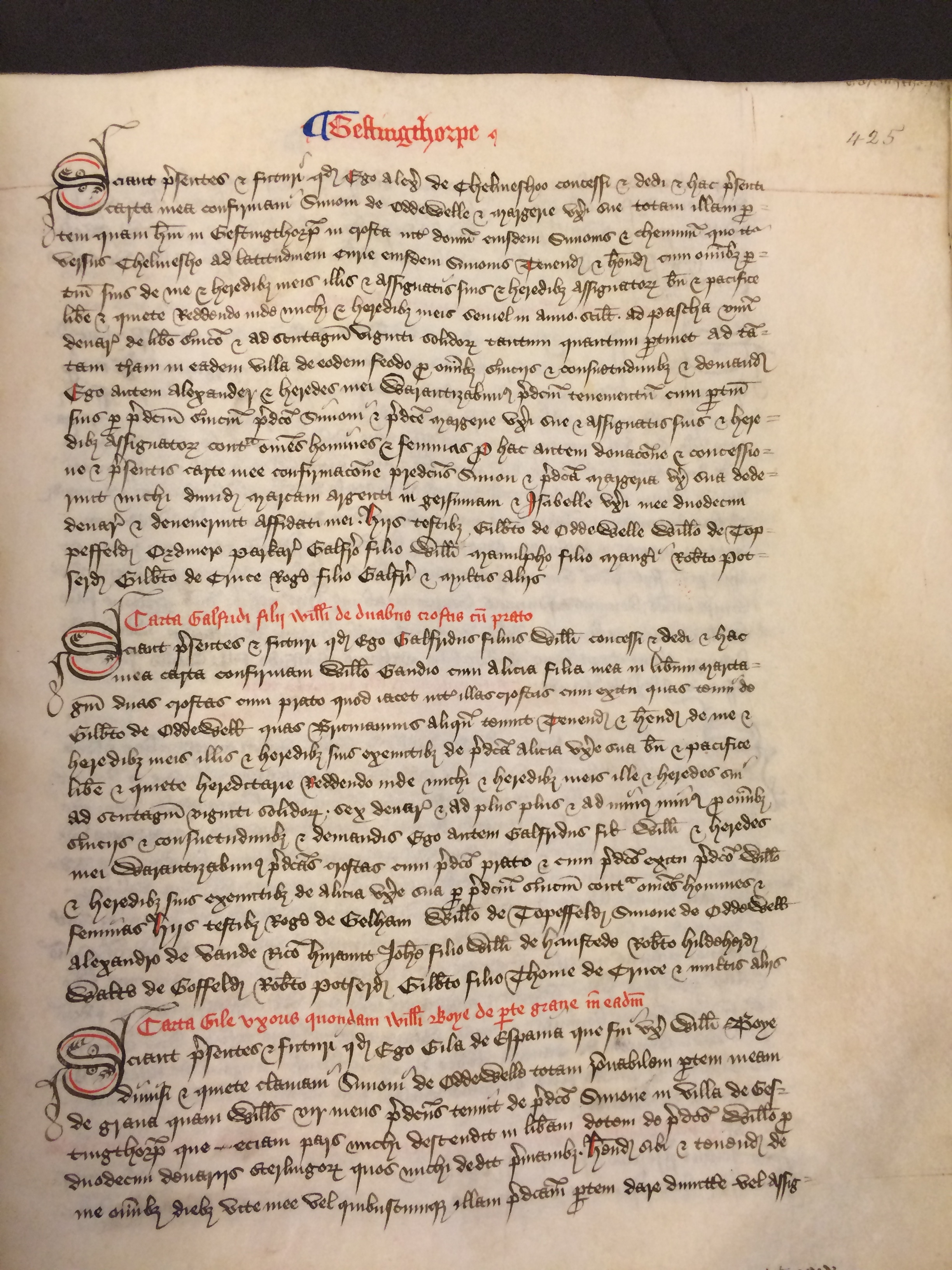 Sciant presentes et futuri quod ego Galfridus filius Willelmi concessi et dedi et hac mea carta confirmavi Willelmo Gaudio cum Alicia filia mea in liberum maritagium duas croftas cum prato quod iacet inter illas croftas cum exitu quas tenui de Gilberto de Oddewell[] quas Britmannus aliquando tenuit tenendas et habendas de me et heredibus meis illis et heredibus suis exeuntibus de predicta Alicia uxore sua bene et pacifice libere et quiete hereditarie reddendo inde michi et heredibus meis ille et heredes sui ad scutagium viginti solidorum sex denarios et ad plus plus et ad minus minus pro omnibus serviciis et consuetudinibus et demandis Ego autem Galfridus filius Willelmi et heredes mei warantizabimus predictas croftas cum predicto prato et cum predicto exitu predicto Willelmo et heredibus suis exeuntibus de Alicia uxore sua per predictum servicium contra omnes homines et feminas Hiis testibus Rogero de Gelham Willelmo de Topesfeld[] Simone de Oddewell[] Alexandro de Vaude Ricardo Huraunt Iohanne filio Willelmi de Haustede Roberto Hildeherd[] Waltero de Gosfeld[] Roberto potserd[] Gilberto filio Thome de Cruce et multis aliis