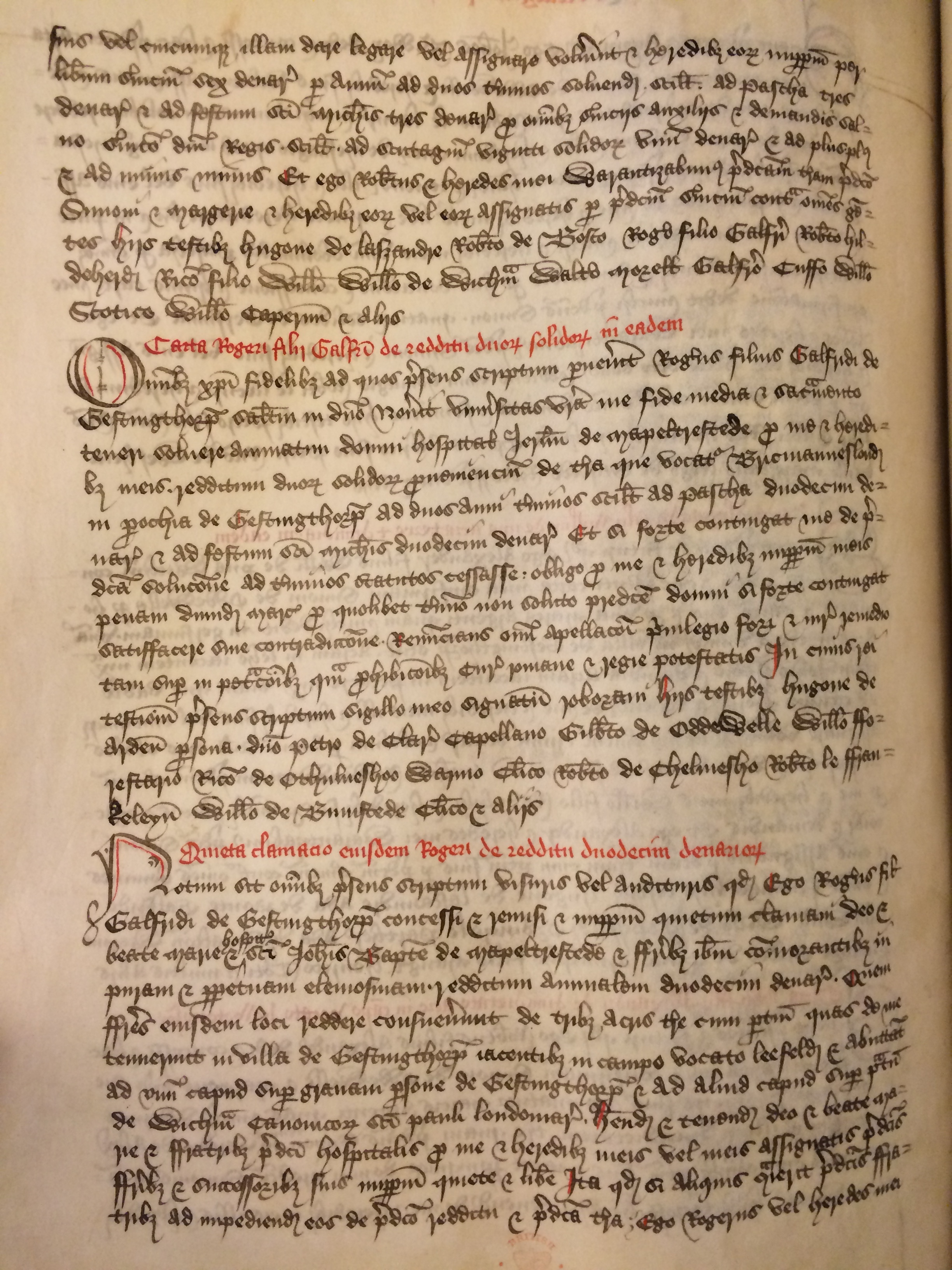 Notum sit omnibus presens scriptum visuris vel audituris quod ego Rogerus filius Galfridi de Gestingthorpename concessi et remisi et imperpetuum quietum clamavi Deo et beate Marie et hospitali sancti Iohannis Baptiste de Mapeltrestedename et fratribusname ibidem commorantibus in puram et perpetuam elemosinam redditum annualem duodecim denariorum quem fratresname eiusdem loci reddere consueverunt de tribus acris terre cum pertinentiis quas de me tenuerunt in villa de Gestingthorpe iacentibus in campo vocato Leefeld[] et abuttant ad unum capud super gravam persone de Gestingthorpename et ad aliud capud super pratum de Wicham canonicorum sancti Pauli Londoniar[um]name habendum et tenendum Deo et beate Marie et fratribusname predicti hospitalis pro me et heredibus meis vel meis assignatis predictis fratribusname et successoribus suis imperpetuum quiete et libere ita quod si aliquis contraierit predictis fratribus ad impediendum eos de predicto redditu et predicta terra ego Rogerusname vel heredes mei vel mei assignati warantizabimus defendemus et acquietabimus predictam terram et predictum redditum predictis fratribus contra omnes gentes imperpetuum et quod nec ego Rogerusname nec heredes mei vel assignati mei de cetero in predicta terra et predicto redditu aliquod ius vel aliquod clameum habere poterimus imposterum Et ad maiorem huius rei securitatem habendam huic scripto sigillum meum apposui Hiis testibus domino Othone filio Willelminame Willelmo filio Willelmi fratrename suo Hugone de Dyna rectorename tunc temporis de Gestingthorpe Roberto de Chelmeshoname Ricardo de Othulveshoname Rogero filio suo clericoname Waltero Morellname[] Rogero de Besevilename Hugone Ioyename et aliis